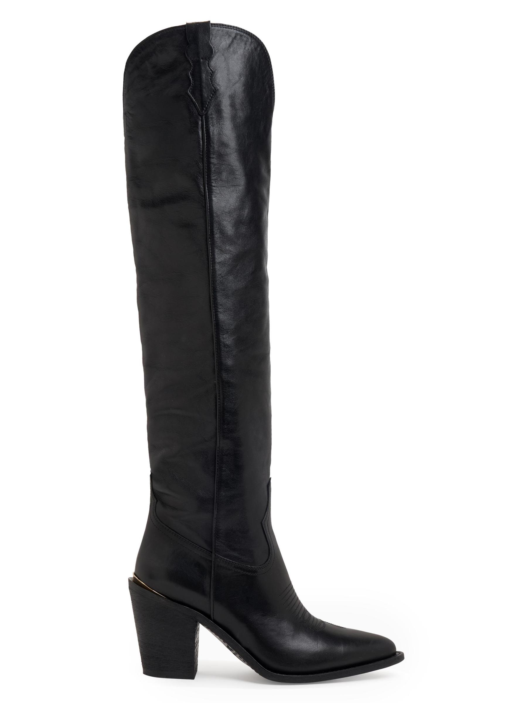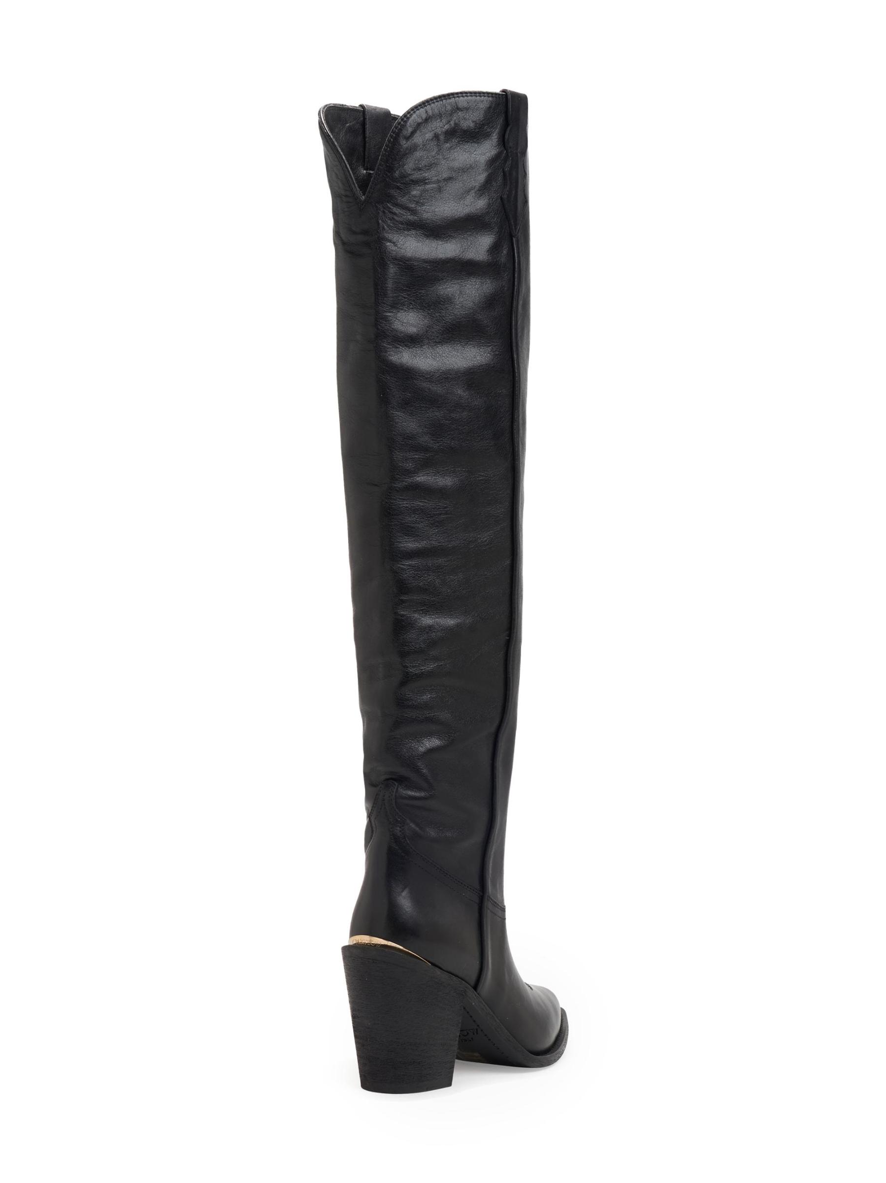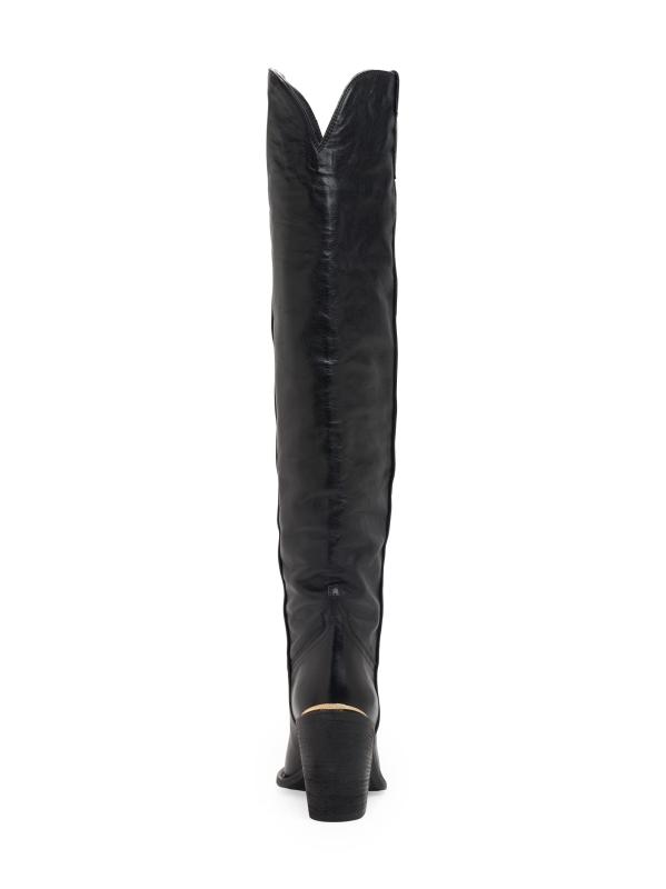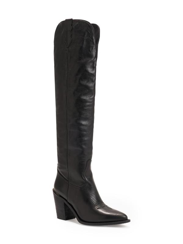 حذاء Jojo الذي يصل إلى الركبة على الطراز الغربي من Partlow مصنوع من الجلد ومصمم بعمود ممتد وكعب عريض يمكن ارتداؤه.