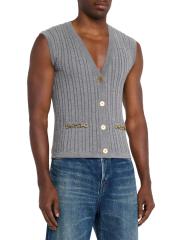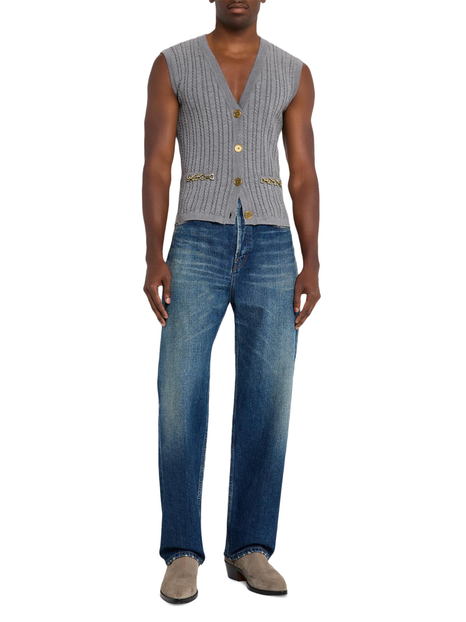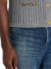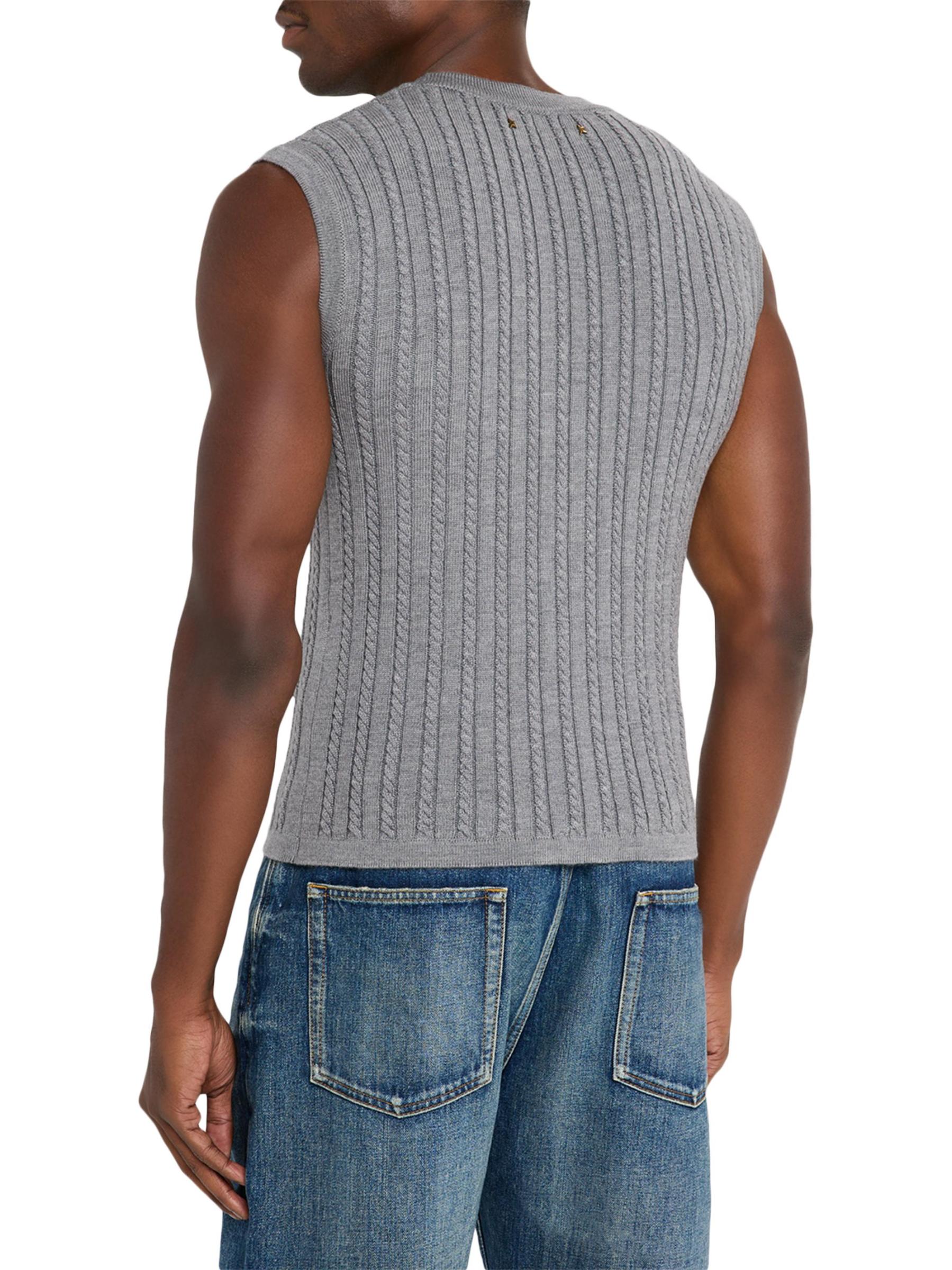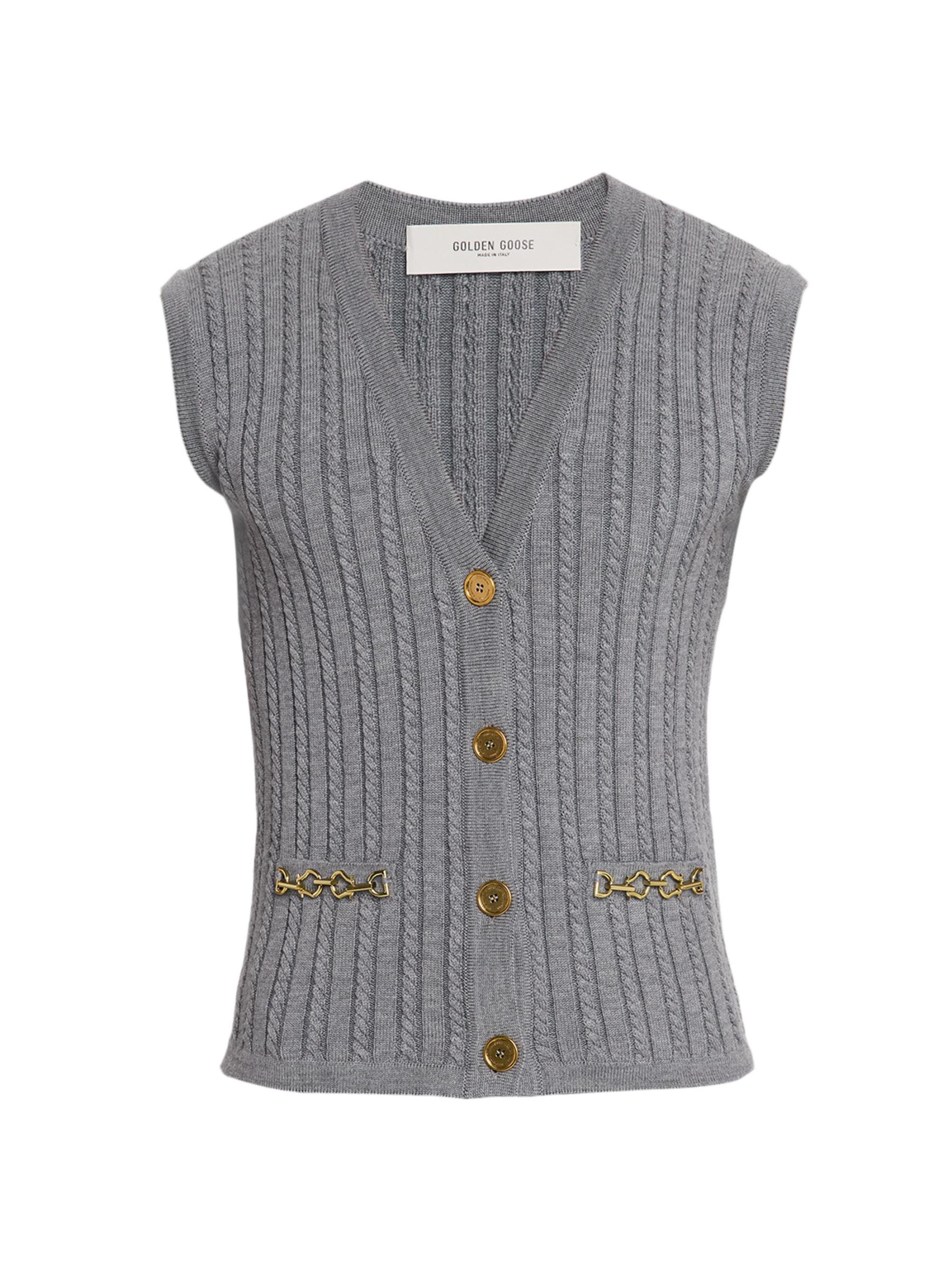 من مجموعة جورني. سترة Golden Goose محبوكة من مزيج الصوف المرن الخفيف. يتميز الطراز بخطوط محبوكة بالكابلات وأجزاء صلبة ذهبية اللون للحصول على لمسة نهائية راقية.رقبة على شكل حرف V بدون أكمام جيبان أماميان إغلاق بأزرار أمامية الصوف البكر والنايلون/البولياميد تنظيف جاف صُنع في إيطاليا