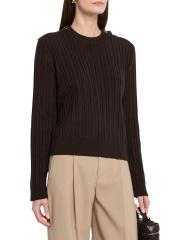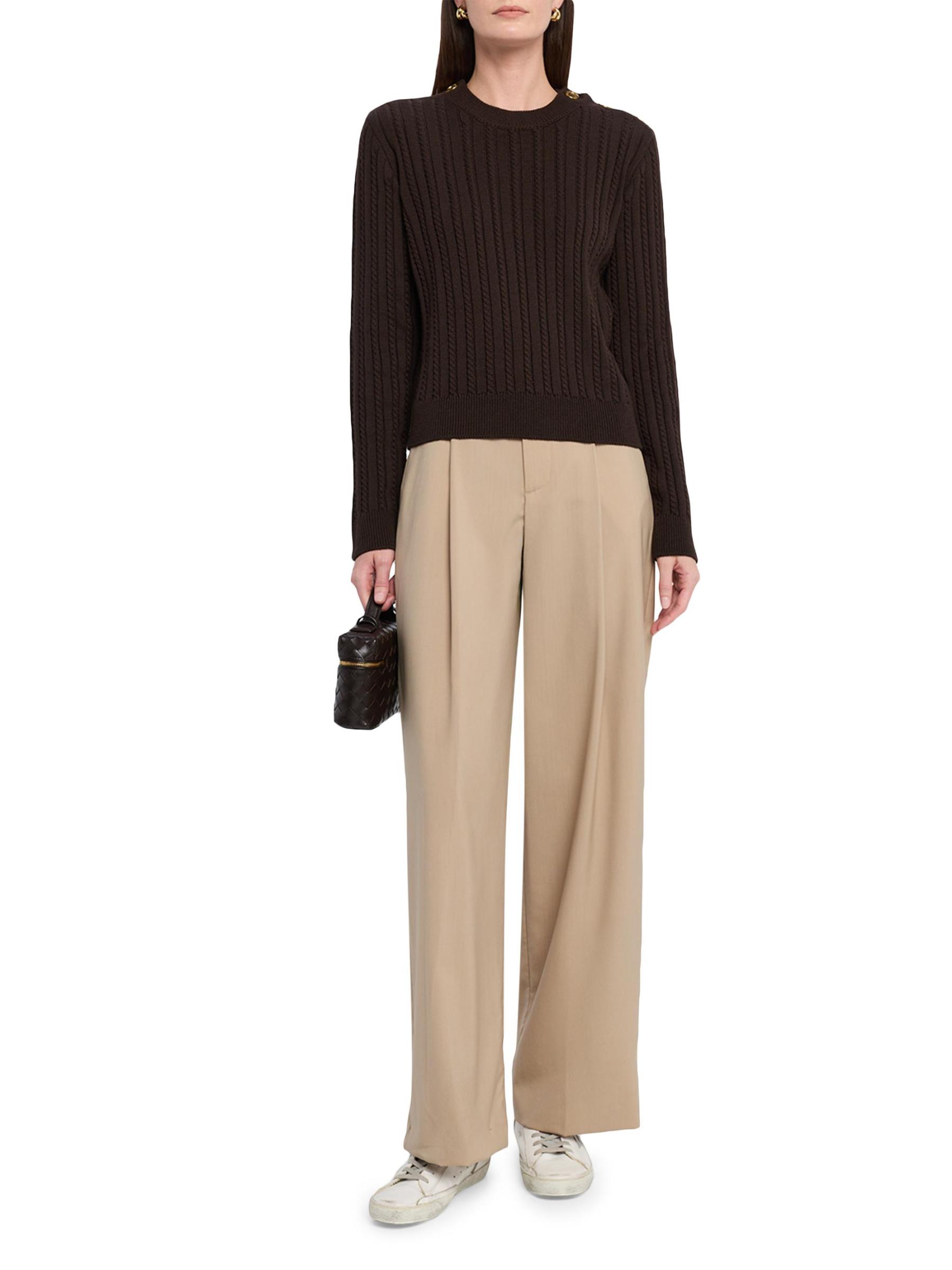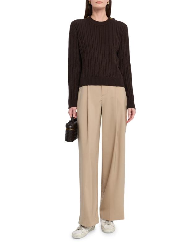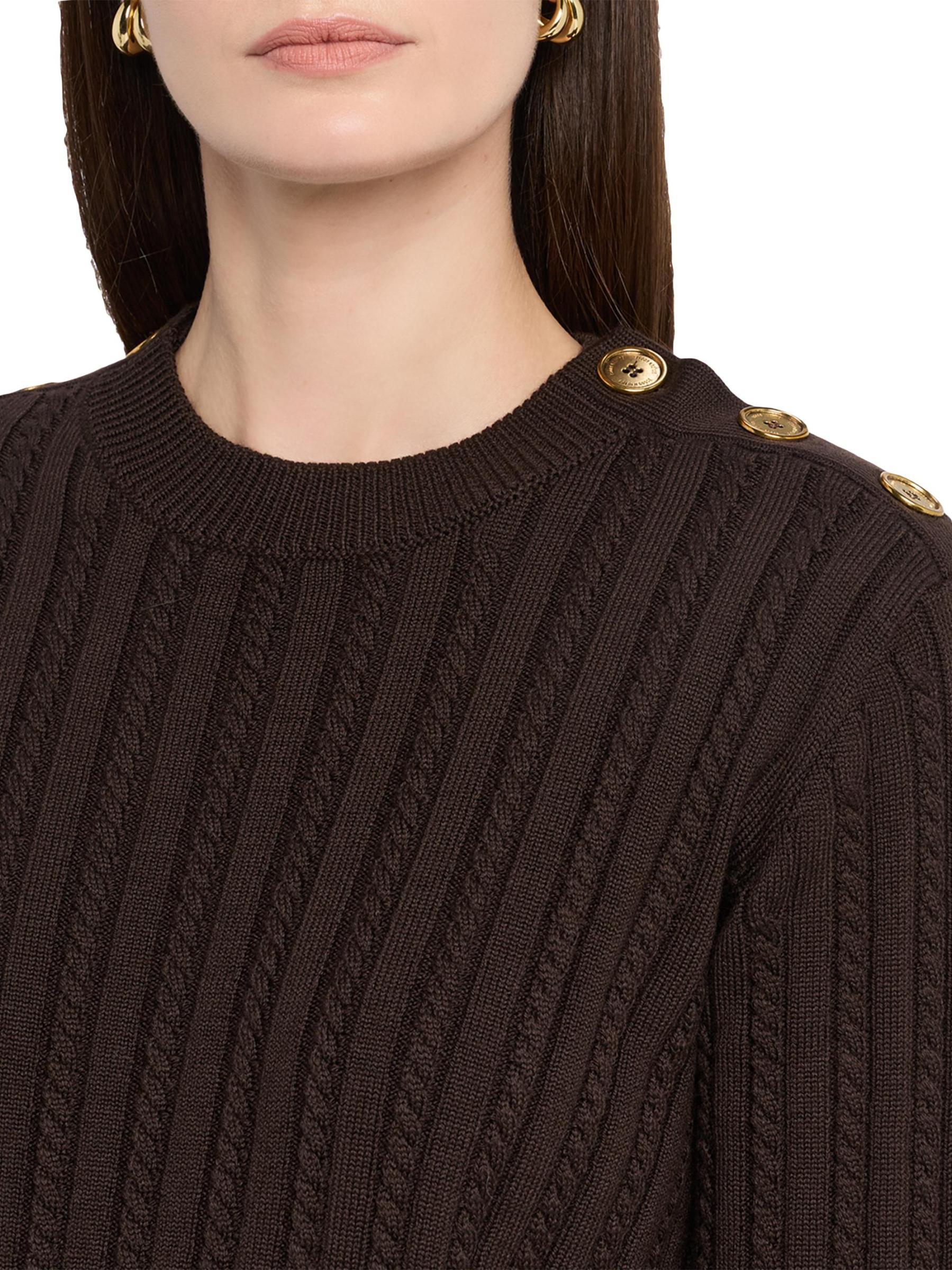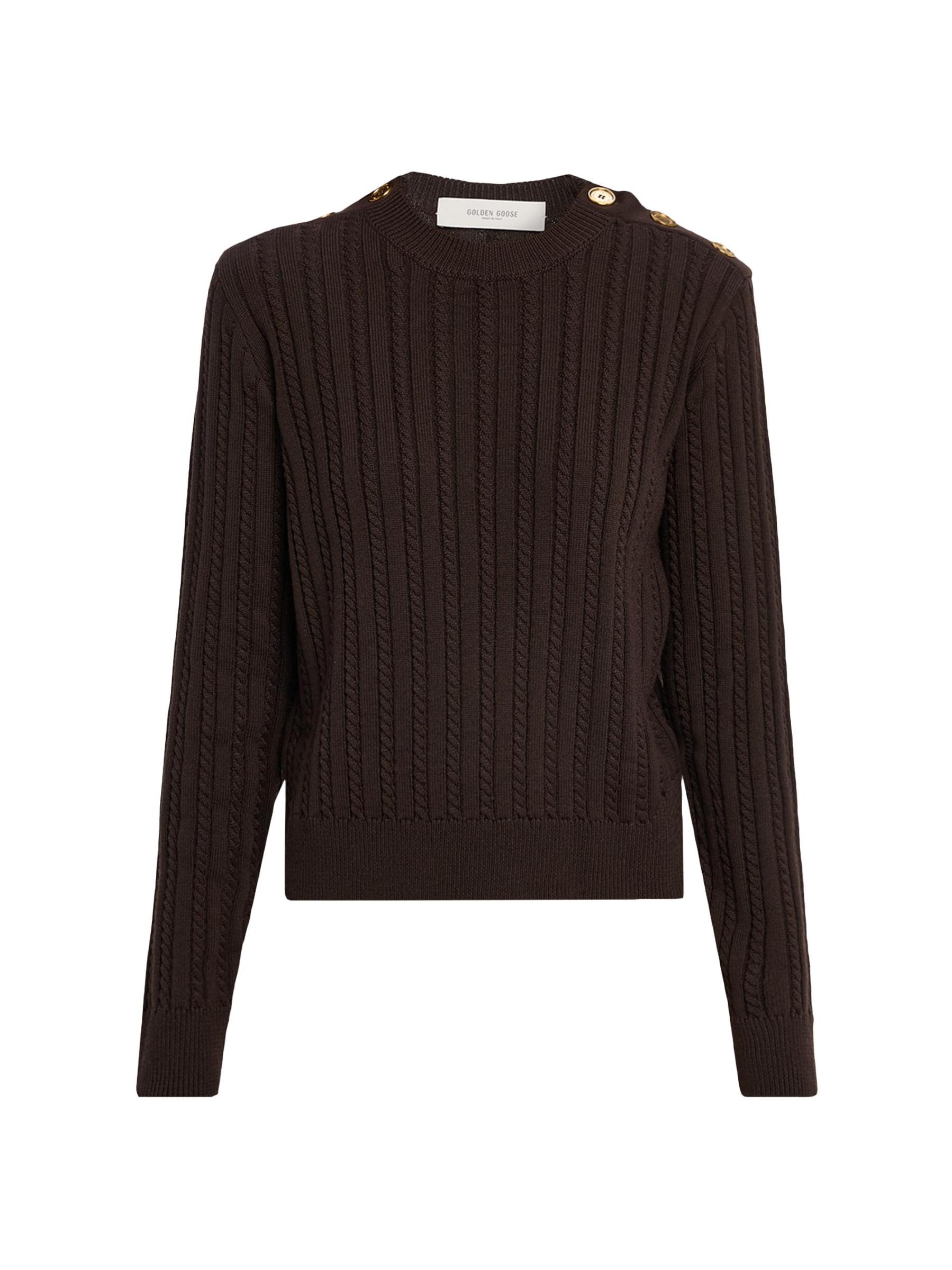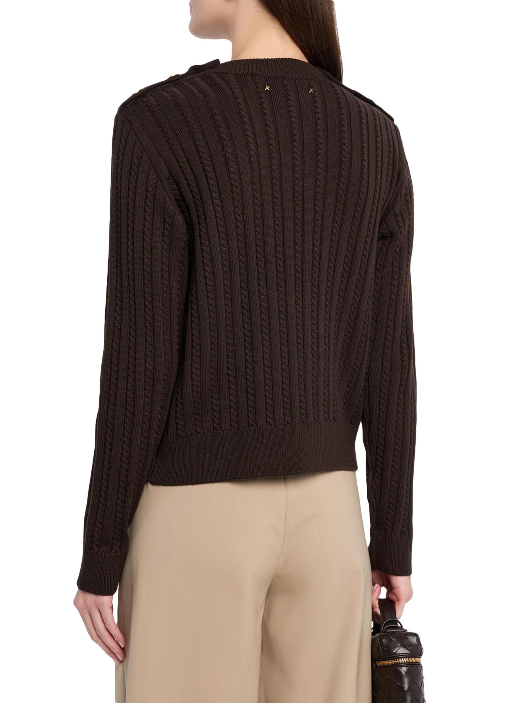 من مجموعة جورني. سترة Ofra من Golden Goose محبوكة من الصوف المرن الخفيف. يتميز الطراز بخطوط محبوكة بالكابلات وأزرار ذهبية اللون على الكتفين.
