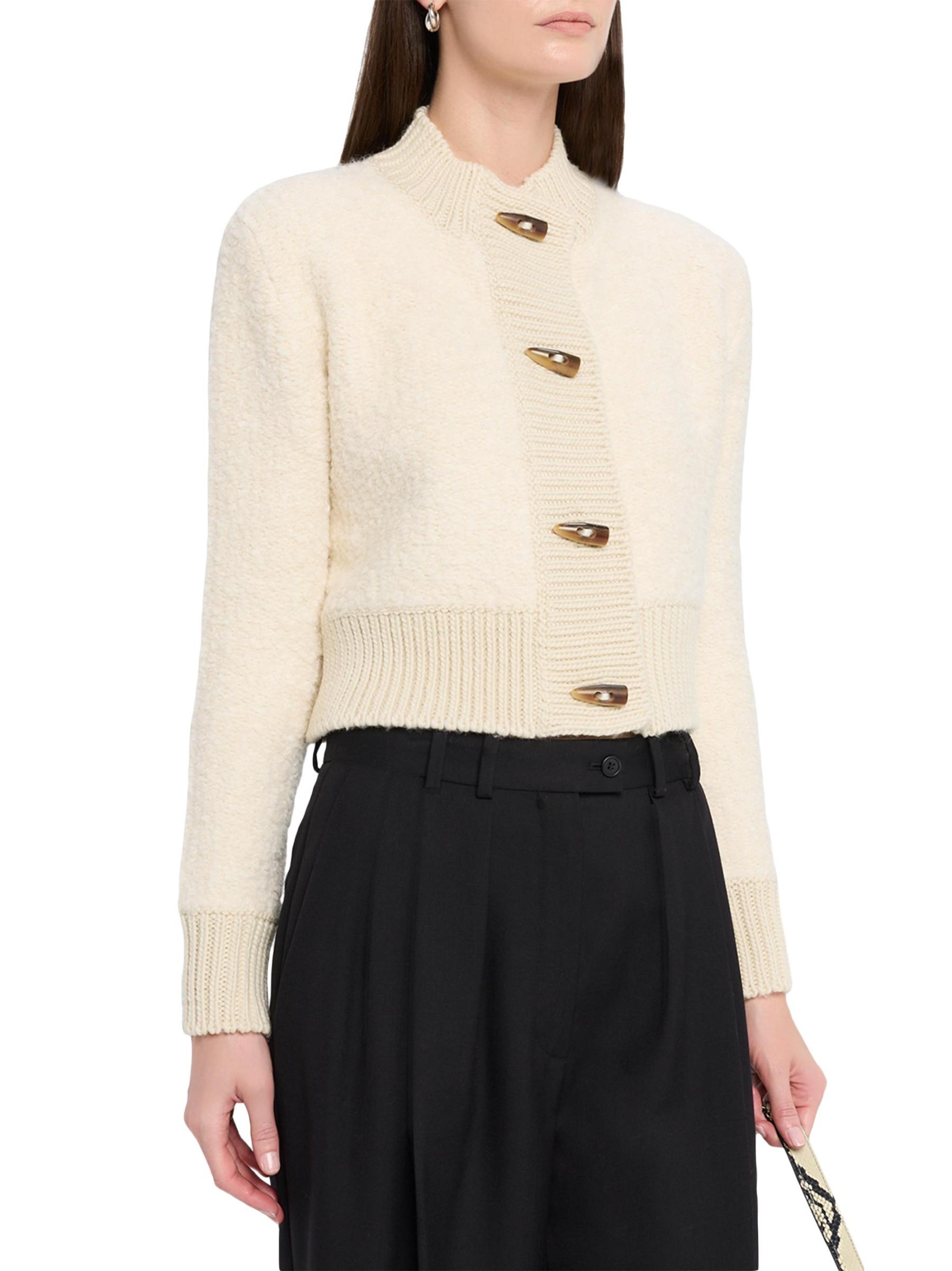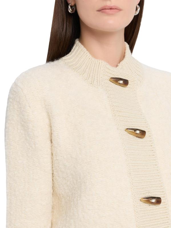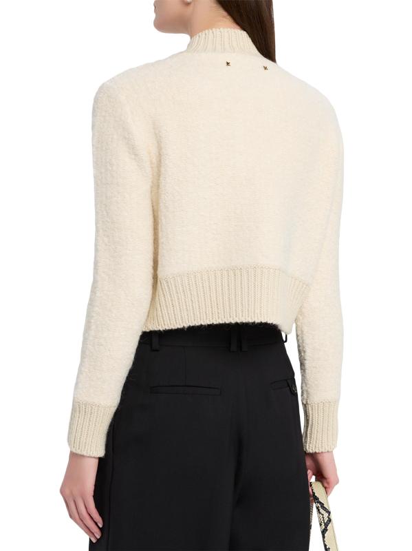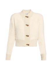 من مجموعة جورني. يتميز كارديجان Oxa من Golden Goose بأنه محبوك من مزيج الصوف المنقوش إلى التصميم النحيف ذو الرقبة المستديرة مع لمسة نهائية ناعمة وبوكلي.
