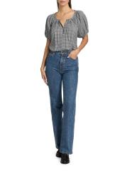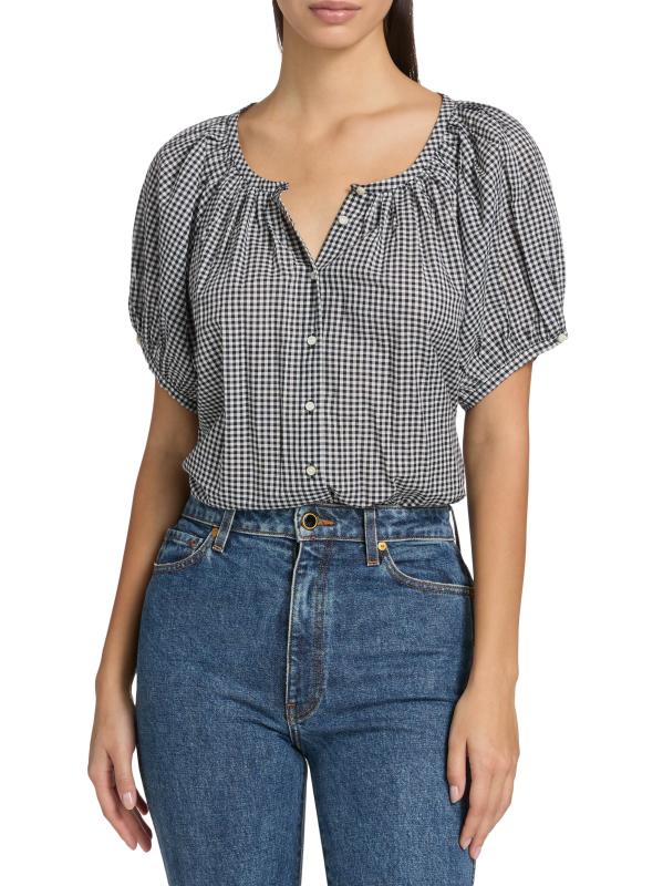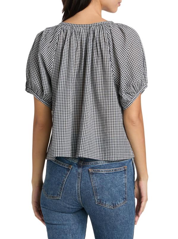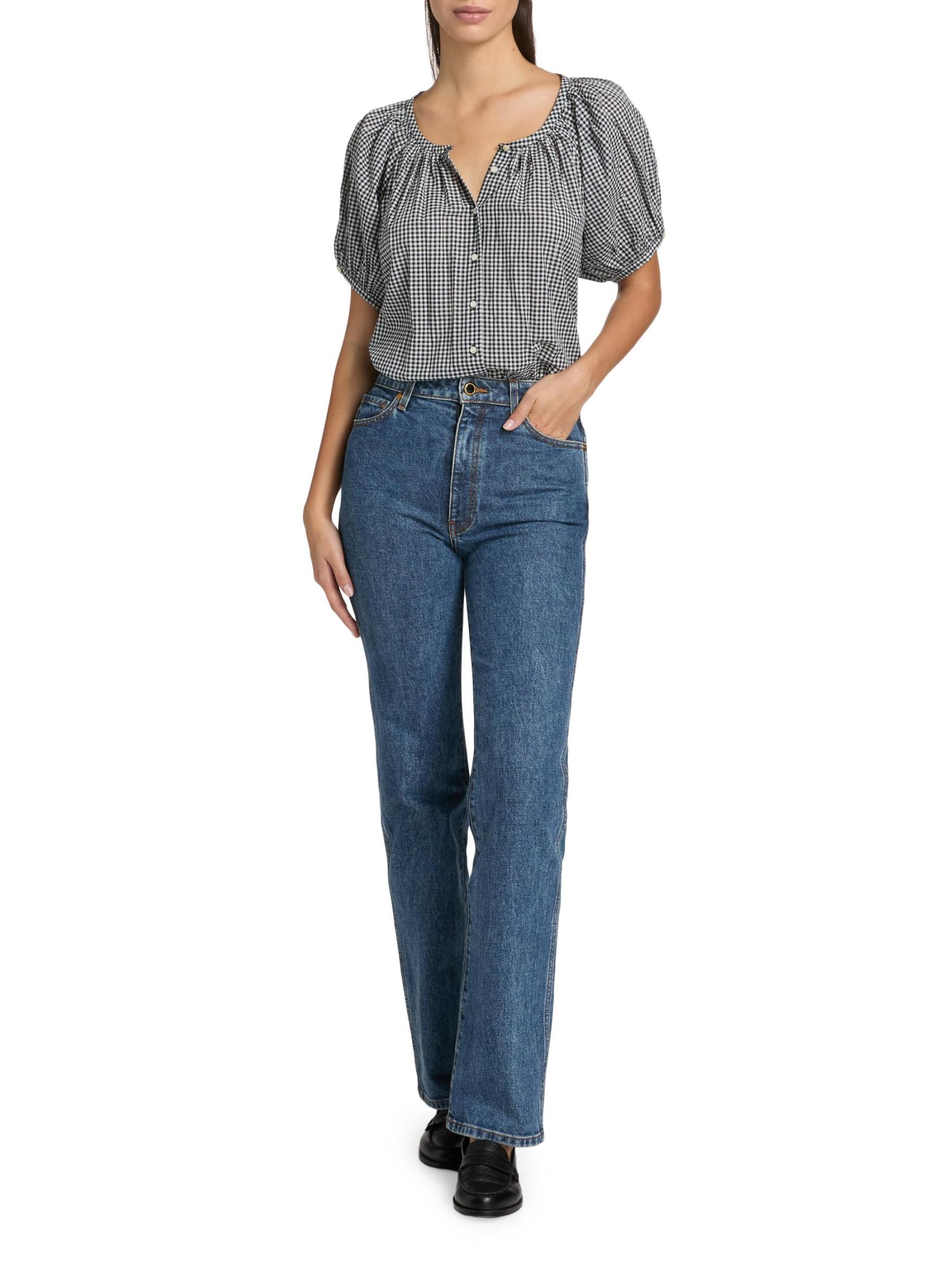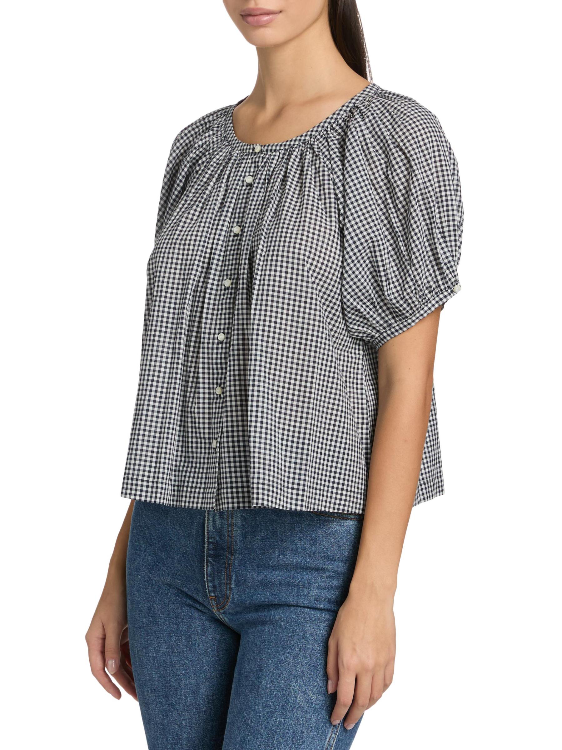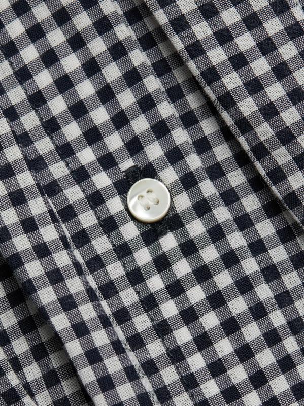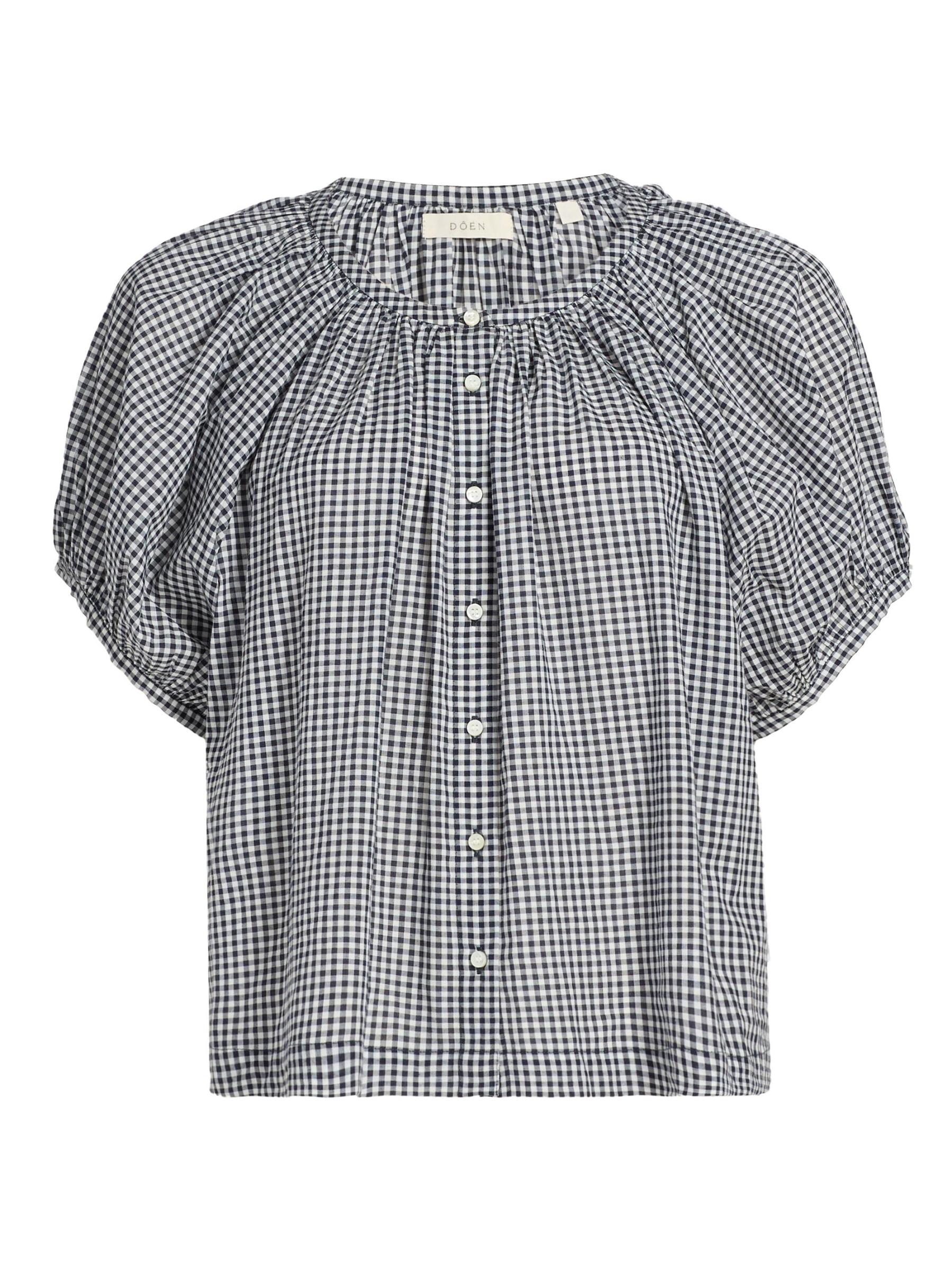 صُمّمت بلوزة يونيو من D E N المصنوعة من القطن بنقشة الجنغام، بتصميم على شكل حرف A.
