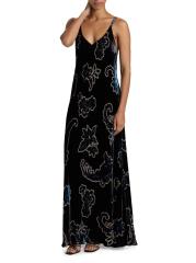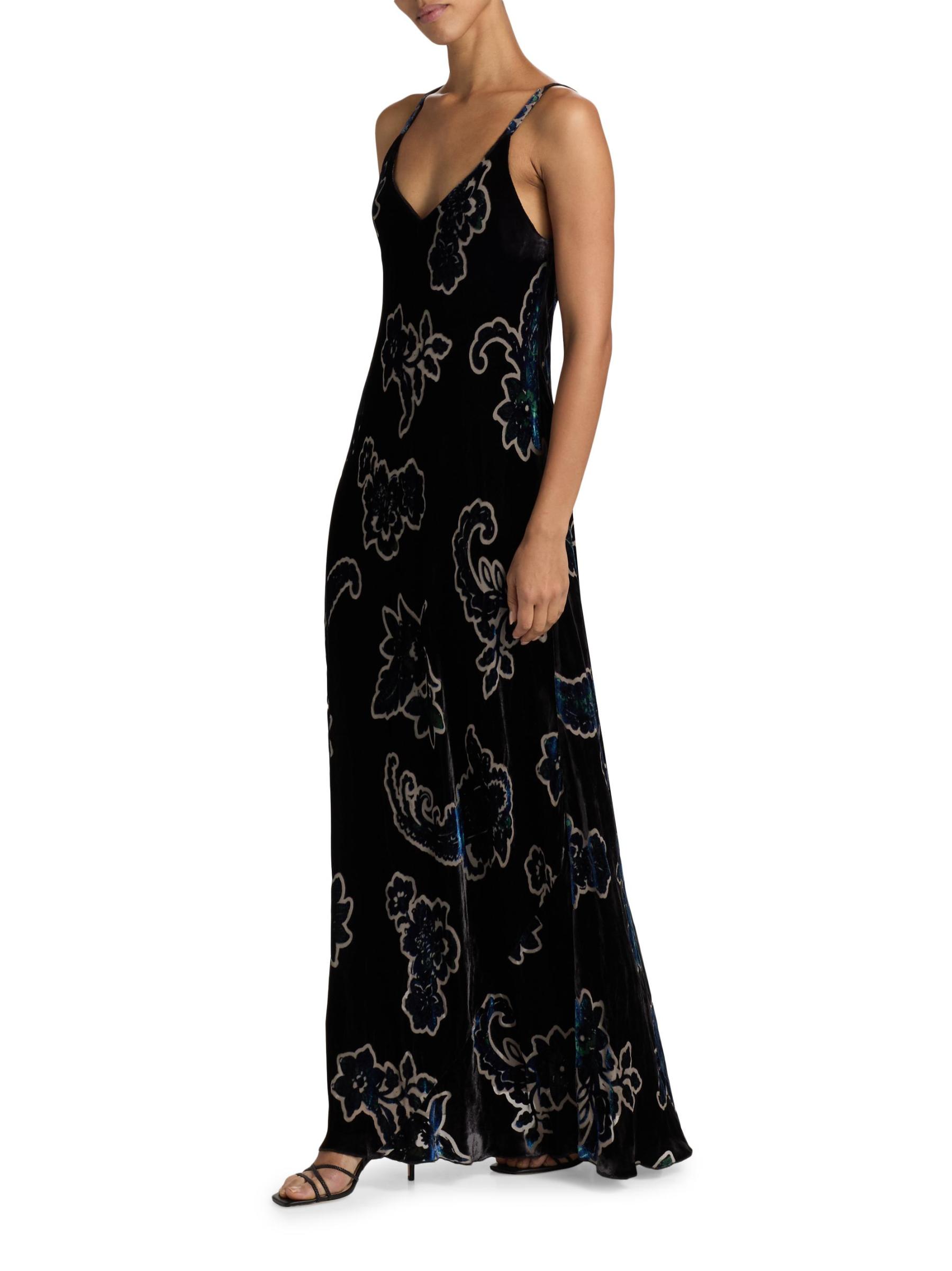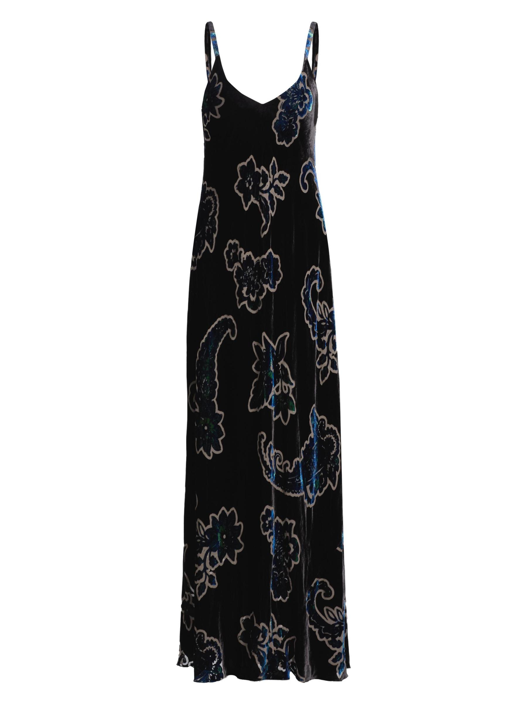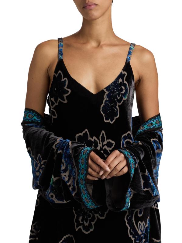 يتميز فستان كاناكو ماكسي من جوني واس بلمسة نهائية من المخمل الناعم مع تصميم الأزهار الزاهية. تم تصميم هذه القطعة برقبة على شكل حرف V وأحزمة قابلة للتعديل وزخارف مطرزة عند الحافة.