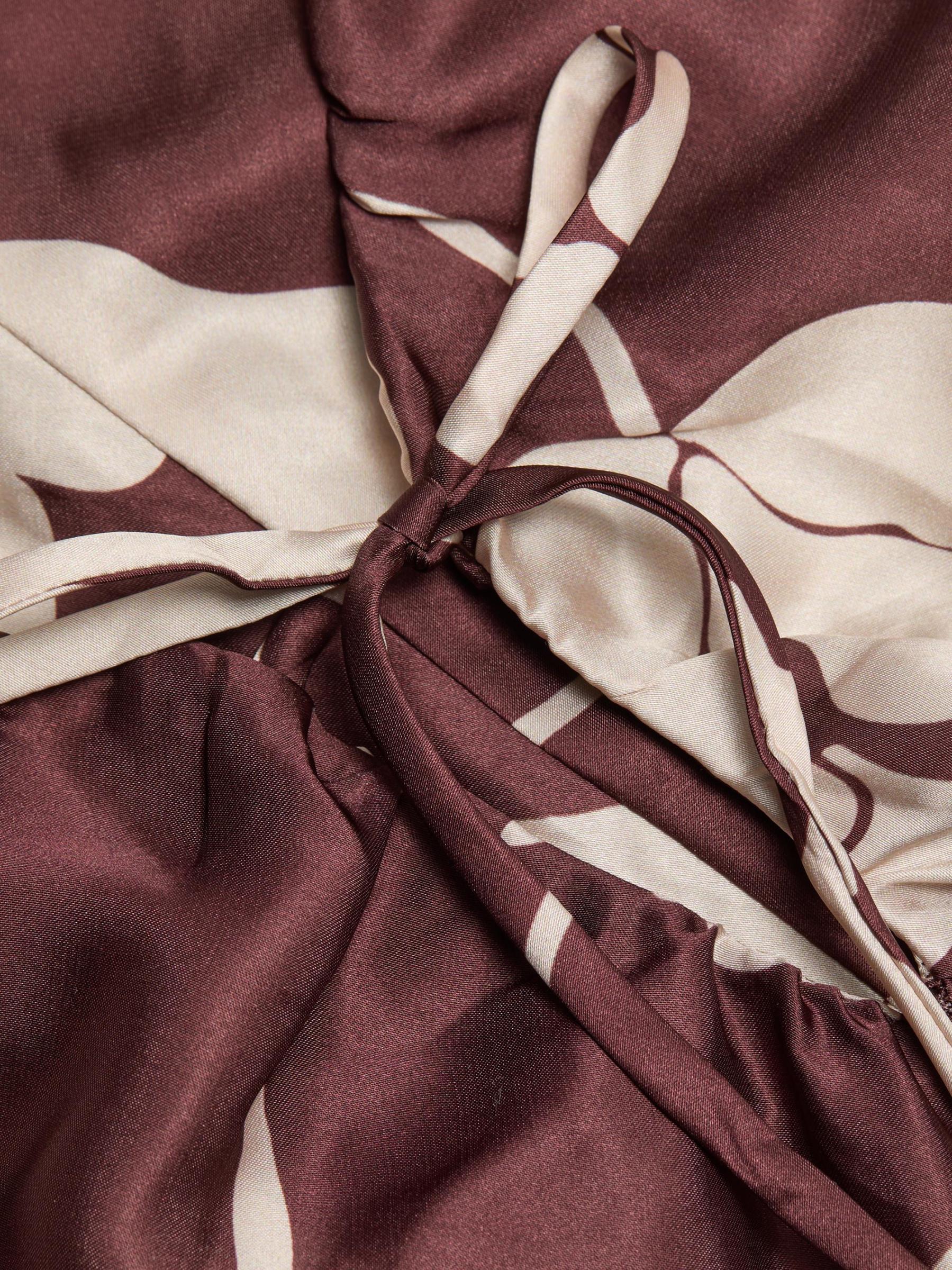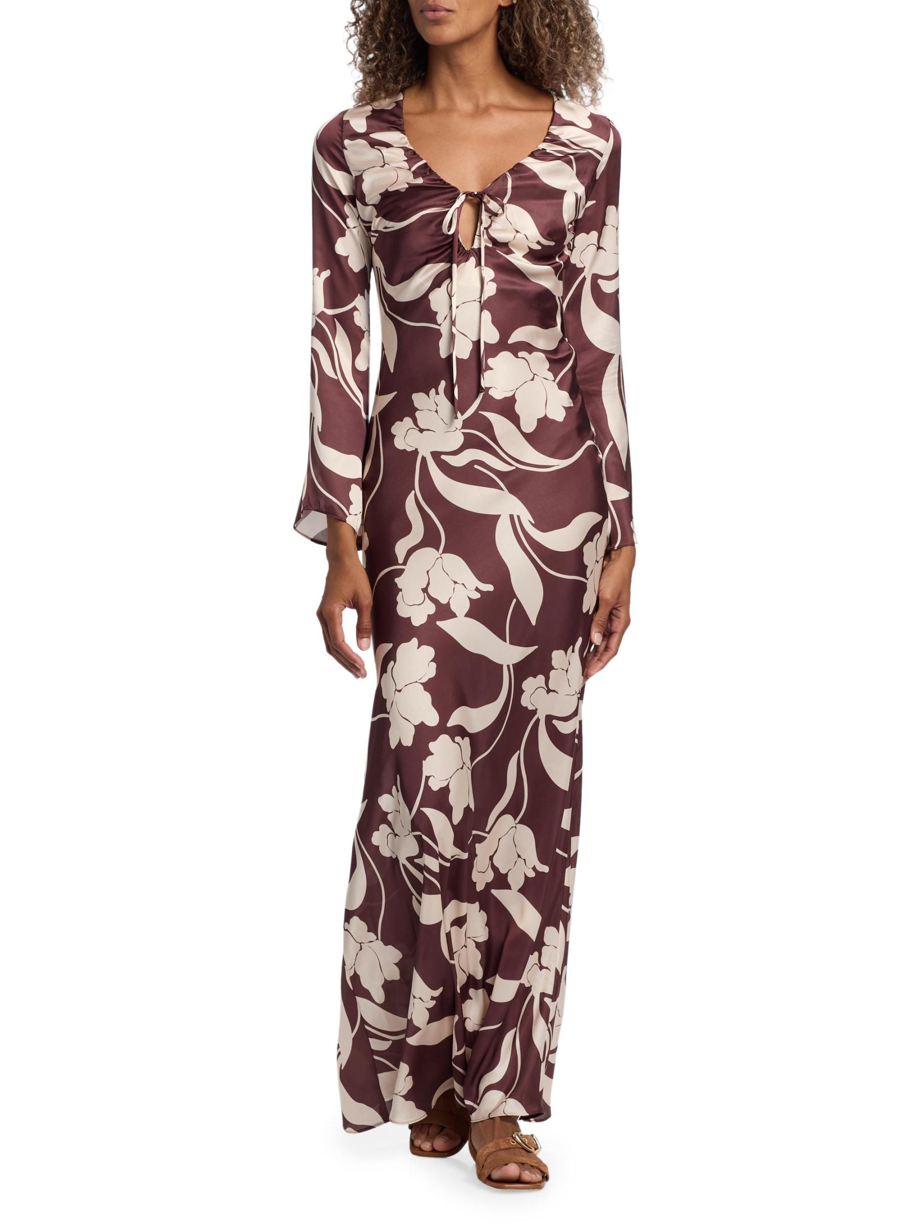 فستان Karla من Misa Los Angeles مصنوع من الساتان المصمم بنقشة الأزهار. تتميز هذه القطعة برقبة دائرية وإغلاق برباط فوق الفتحة.