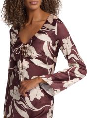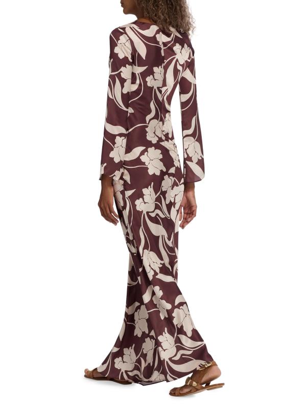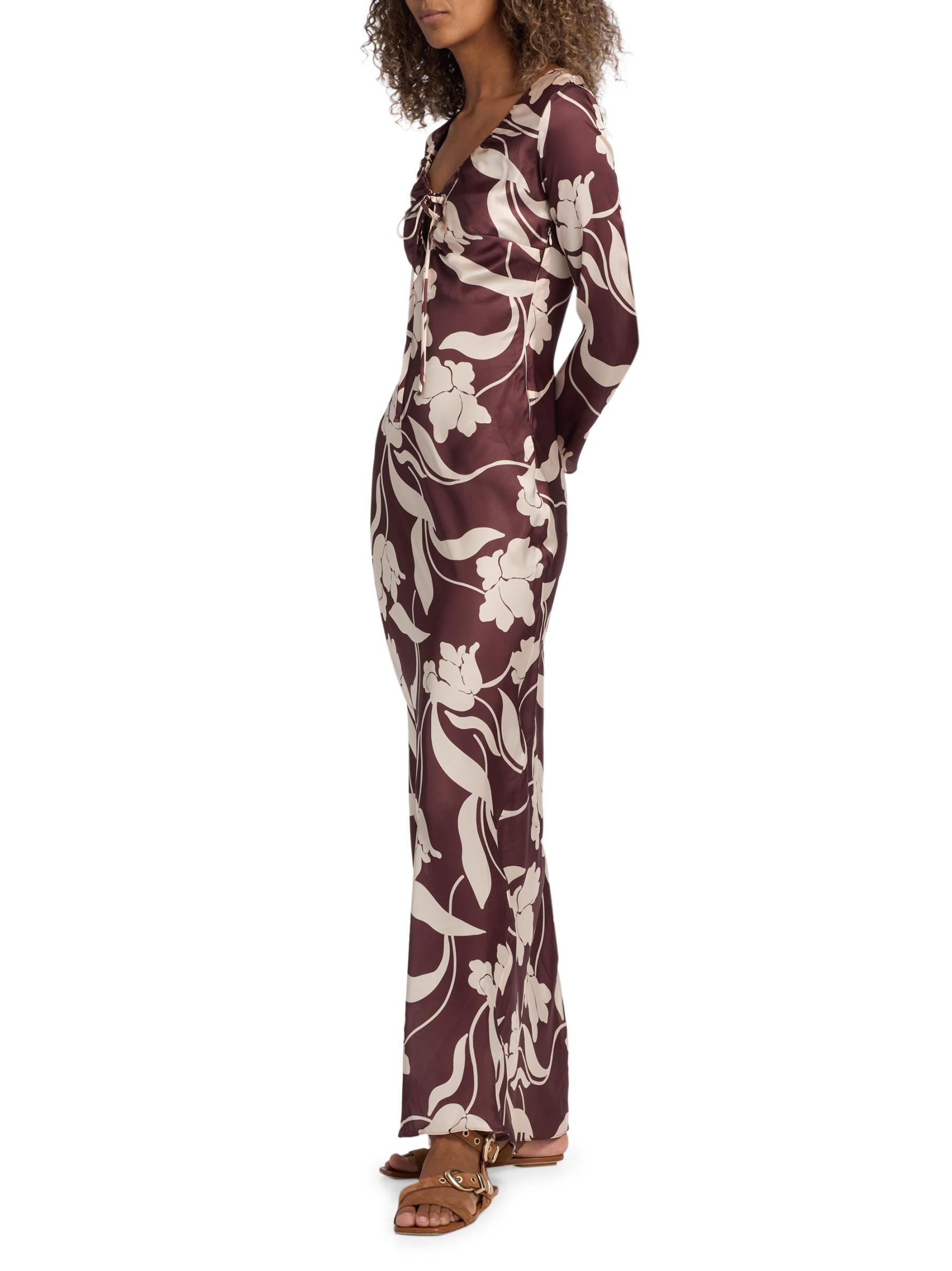 فستان Karla من Misa Los Angeles مصنوع من الساتان المصمم بنقشة الأزهار. تتميز هذه القطعة برقبة دائرية وإغلاق برباط فوق الفتحة.سكوبنك أكمام طويلة فتحة عند الصدّار إغلاق برباط أمامي وسحّاب جانبي 100% بوليستر تنظيف جاف صُنع في الولايات المتحدة الأمريكية