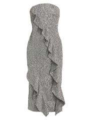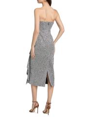 صُمم فستان كاتي كوكتيل من Milly بكشكشة متتالية ليمنحك مظهرًا أنيقًا بدون حمالات ومرصّع بالترتر المعدني المنقوش.
