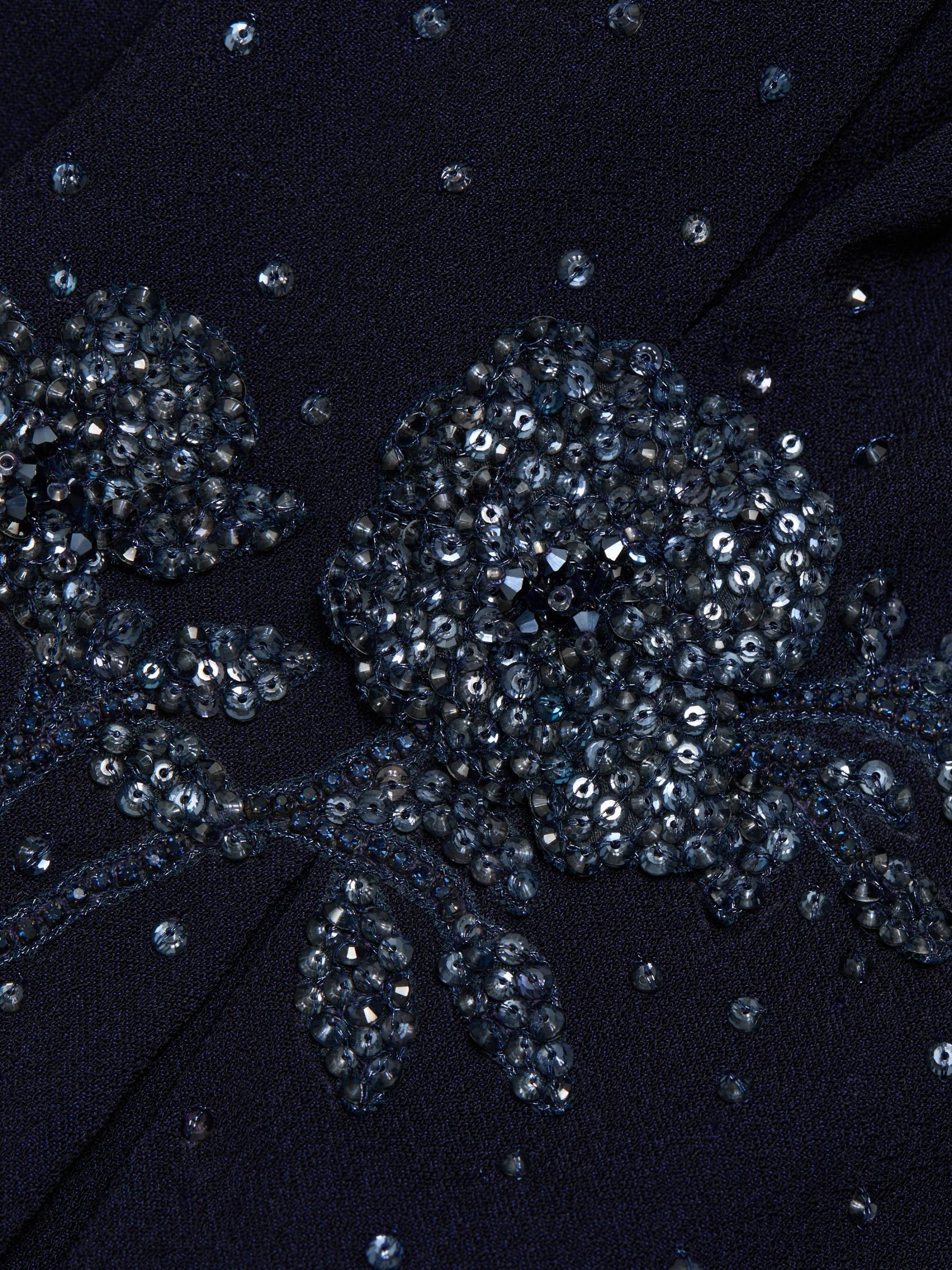 Babi من الكريب المرن، وهو مزين بالترتر والخرز على الكتف.