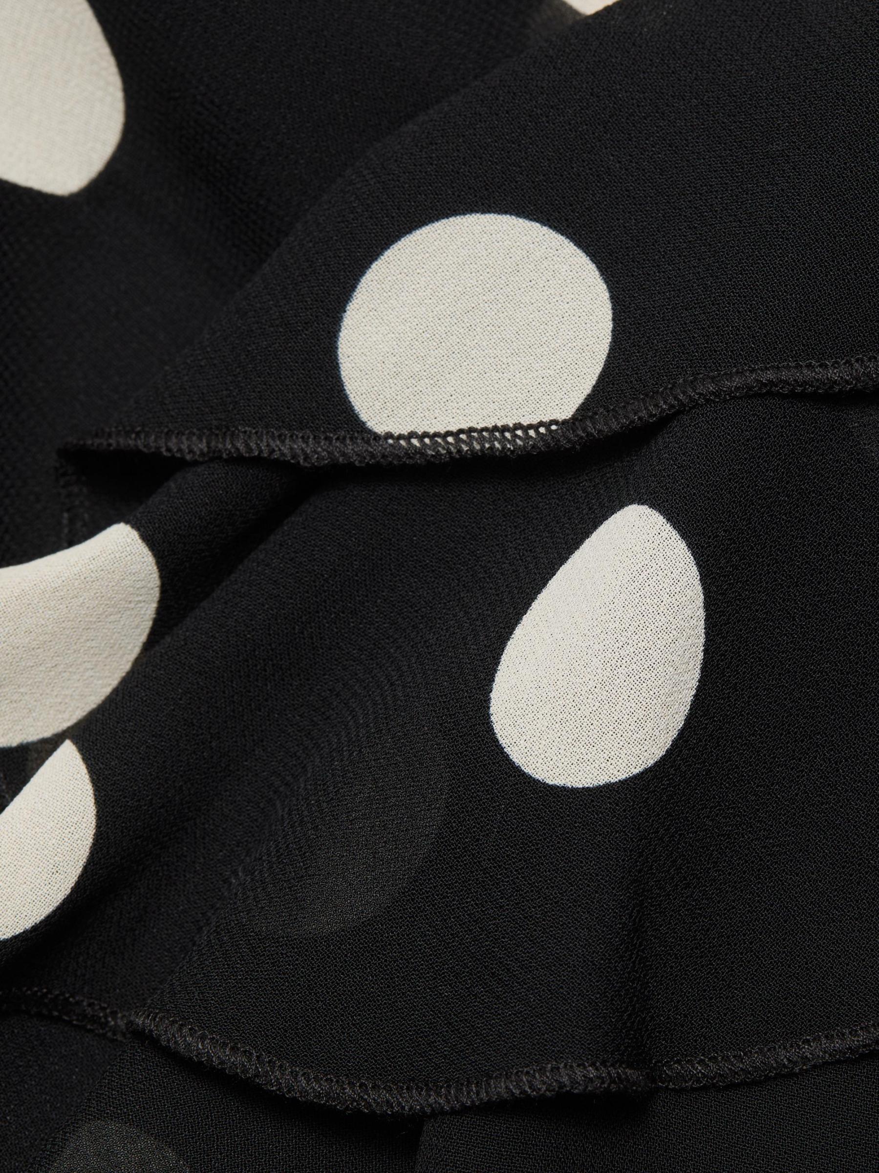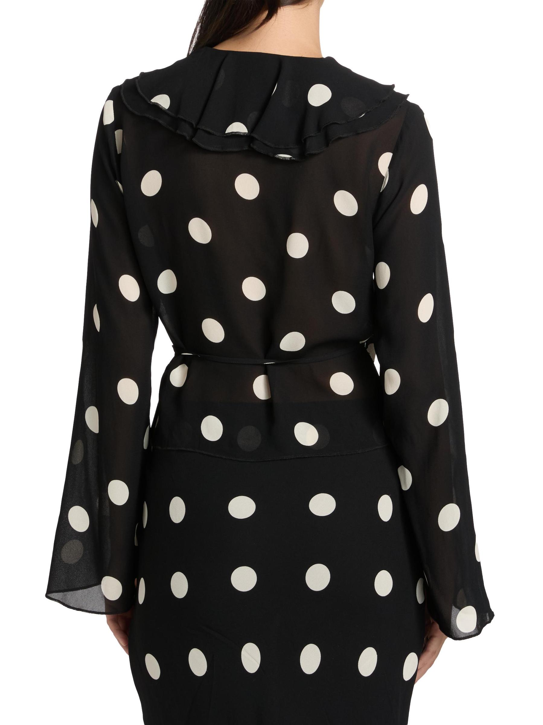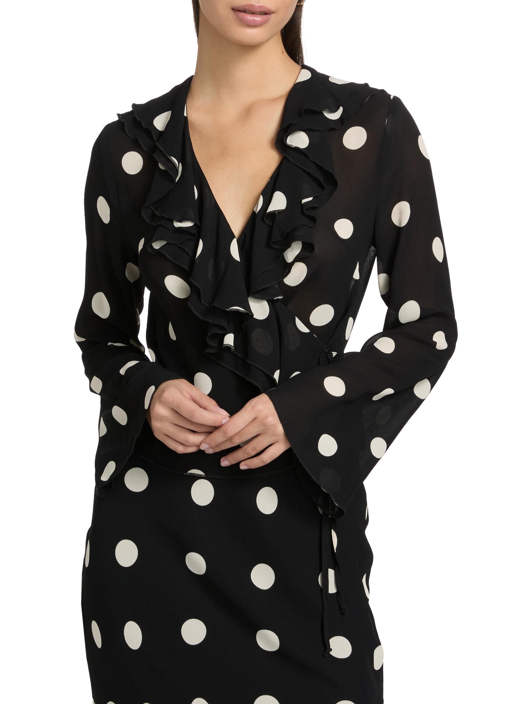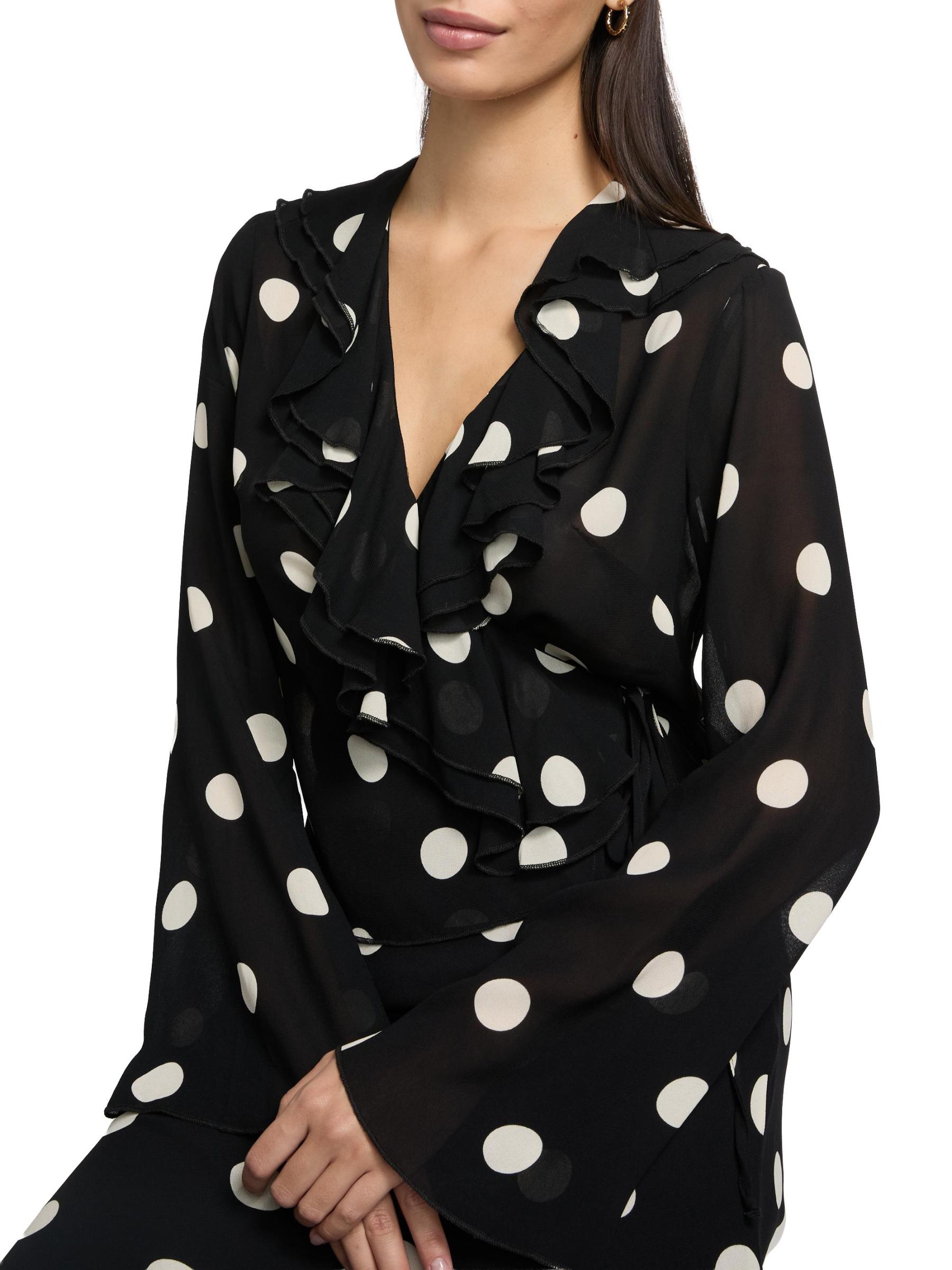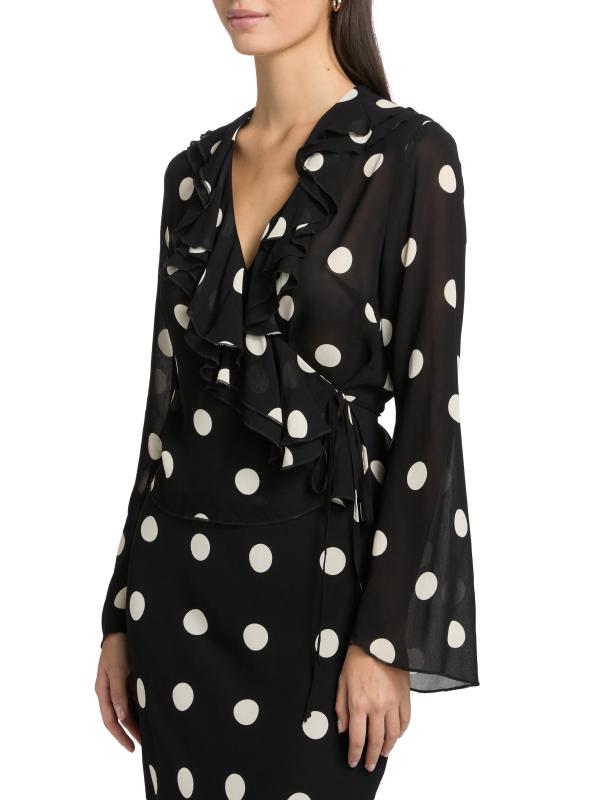 تتميّز بلوزة Kilah الملفوفة من ريفورميشن المصنوعة من قماش جورجيت خفيف الوزن بتقويرة منسدلة مكشكشة وأكمام طويلة على شكل جرس ونقشة منقّطة.