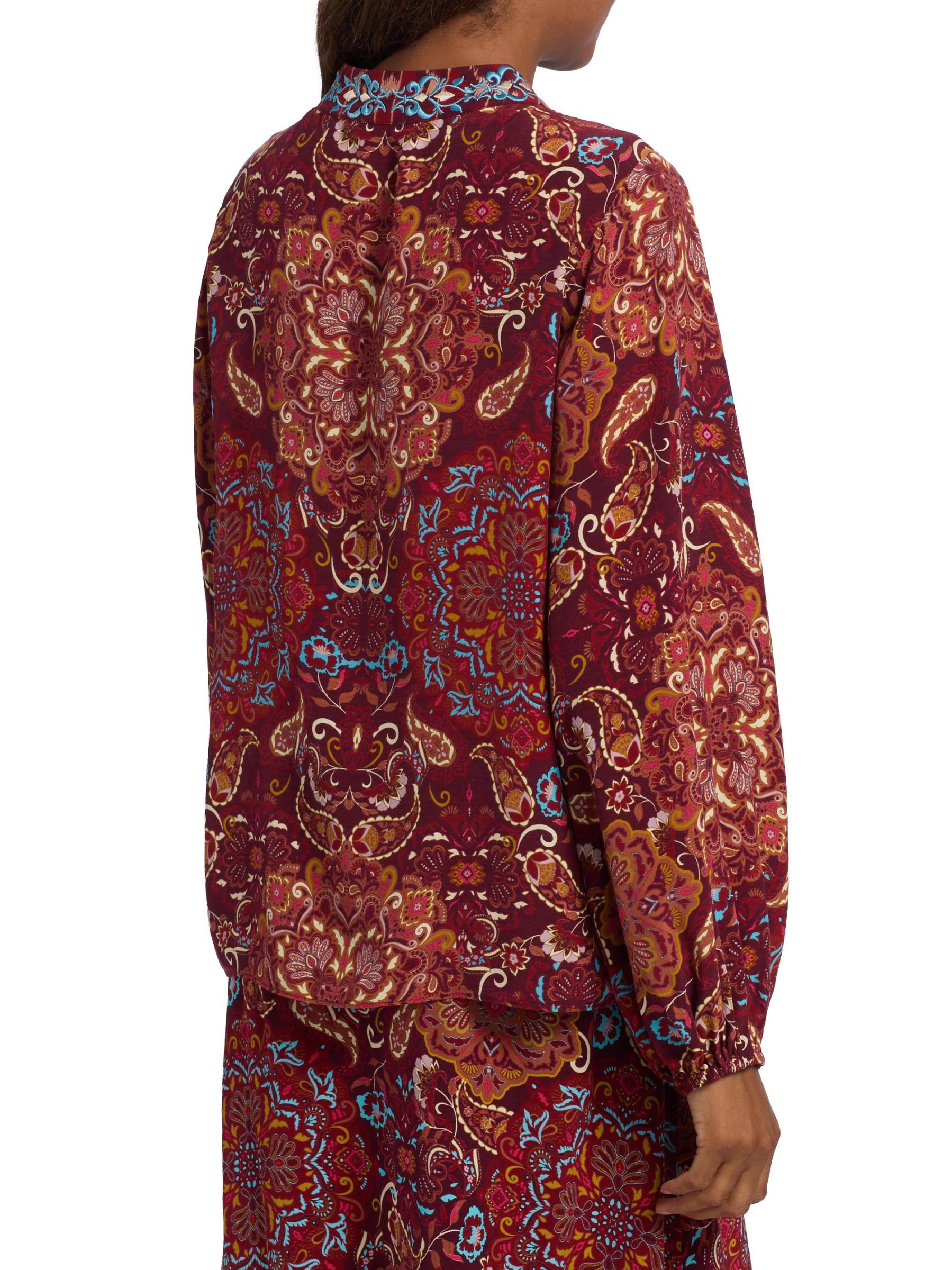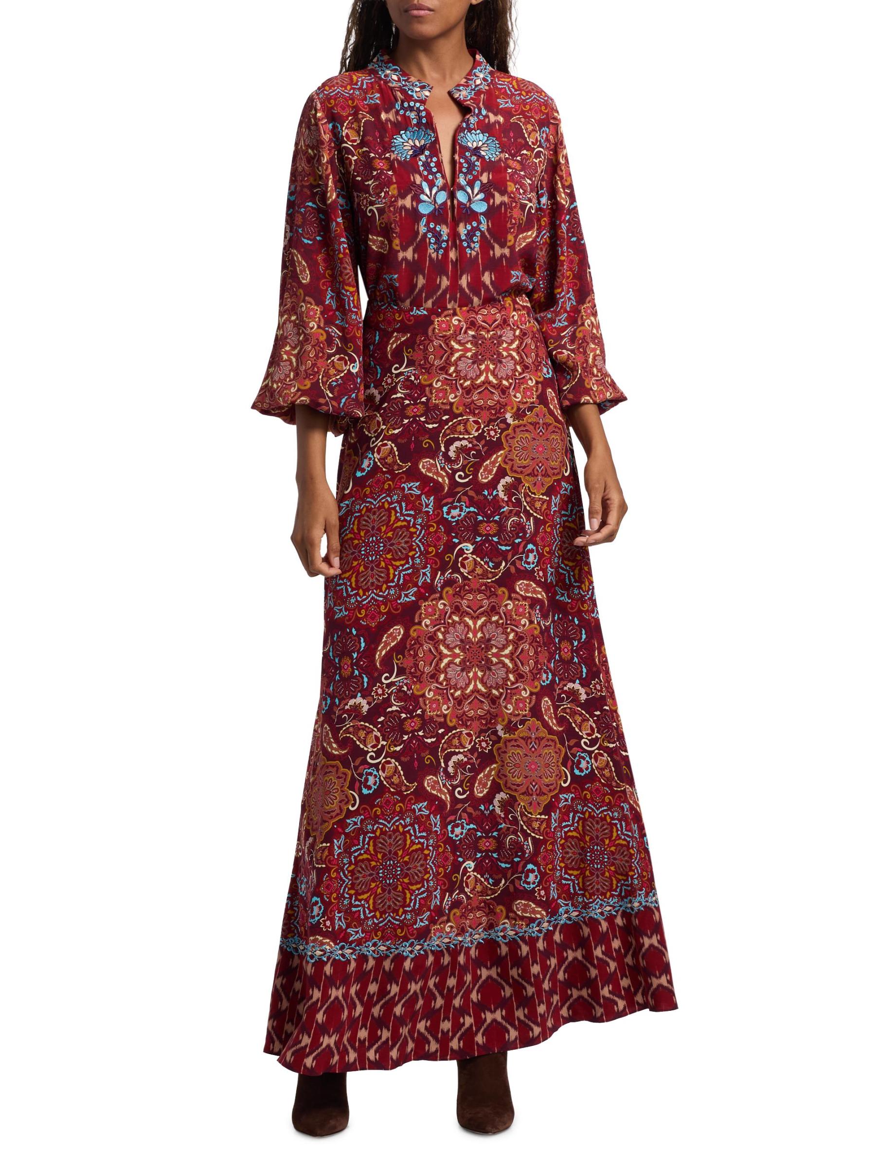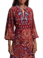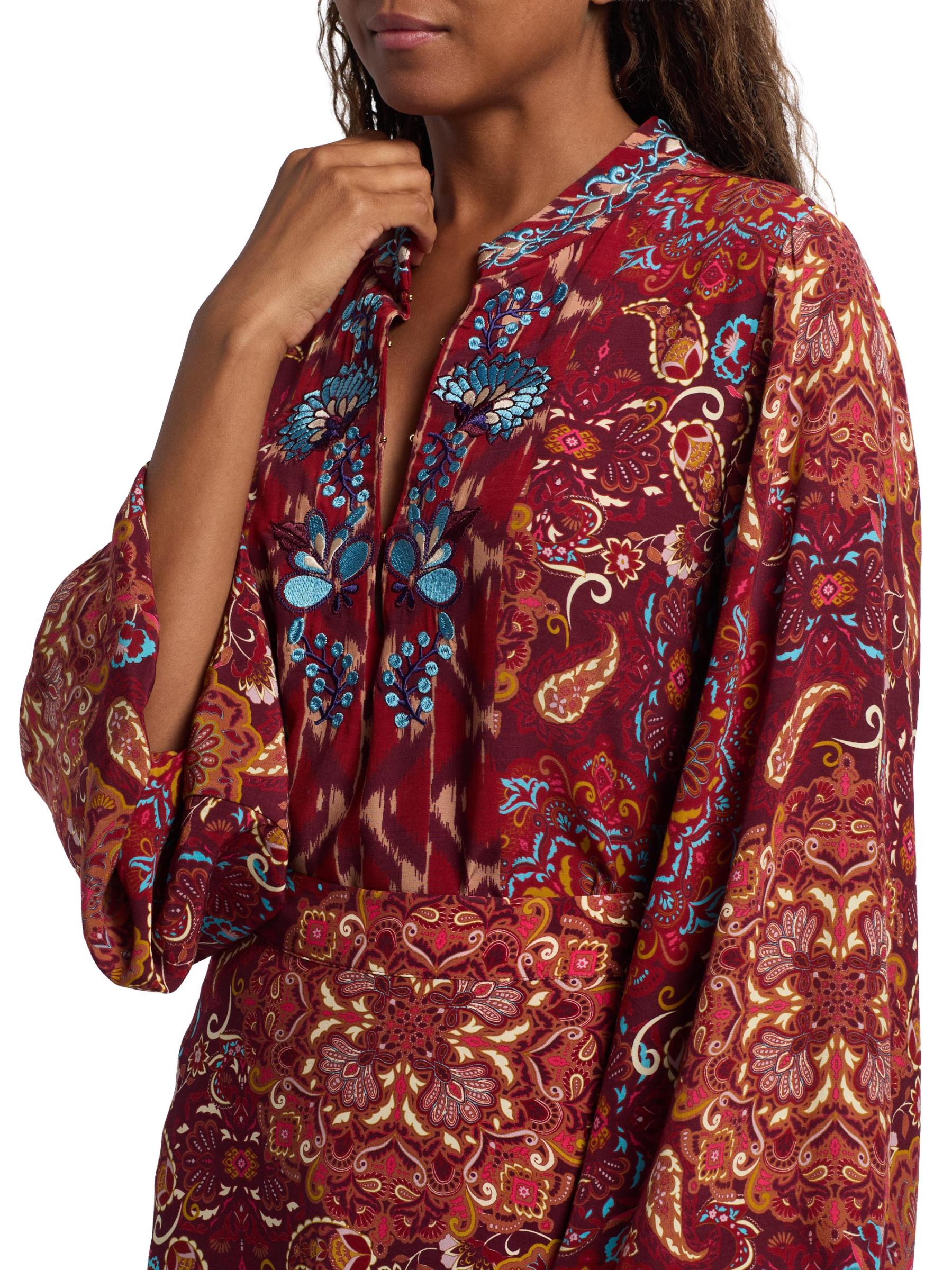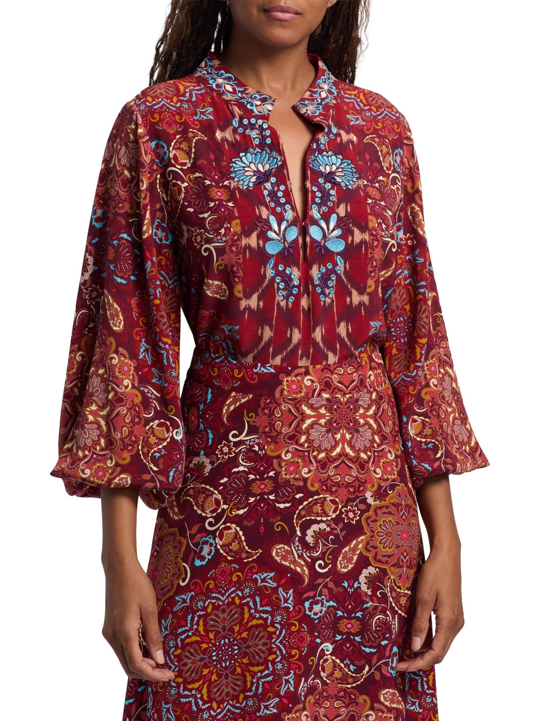 تتميز بلوزة Kit المطرزة من Figue بطبعة مستوحاة من Ikat مزينة بتطريز الأزهار المعقدة.رقبة مستديرة أكمام طويلة وأساور مطاطية إغلاق بخطاف وعيون فيسكوز 100% تنظيف جاف مستوردة