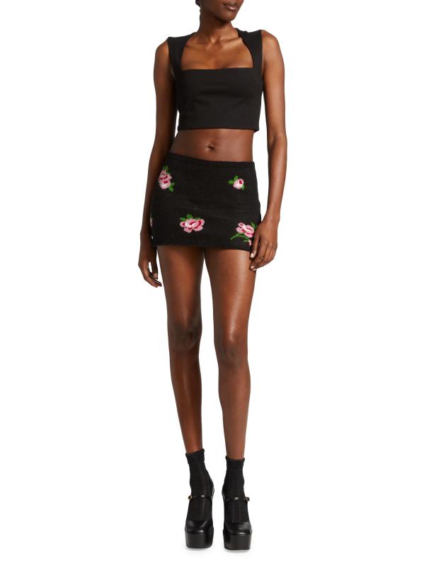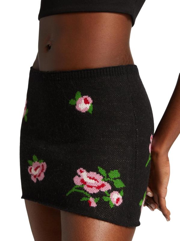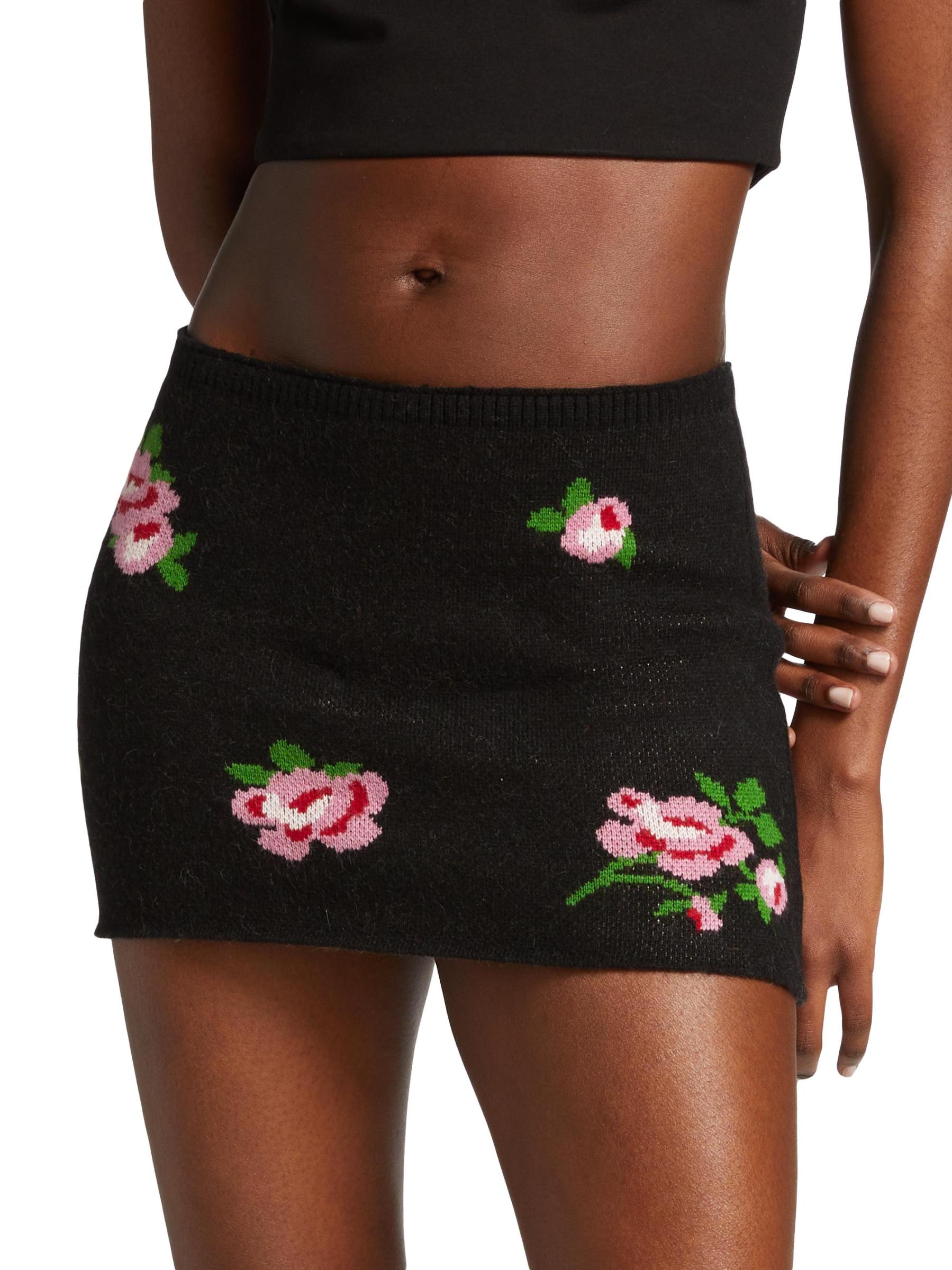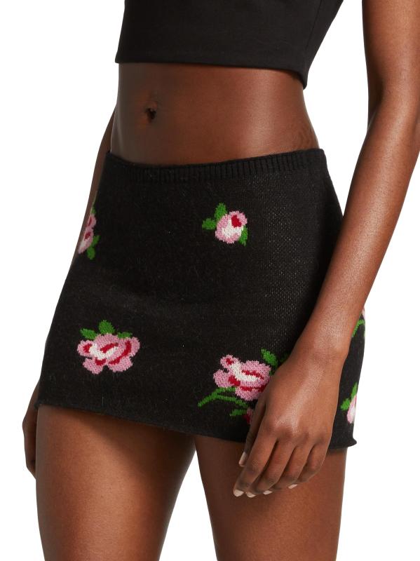 تم تصميم هذه التنورة القصيرة المحبوكة من GUIZIO في صورة ظلية بالقلم الرصاص، وهي مزينة بزخرفة وردة الجاكار.
