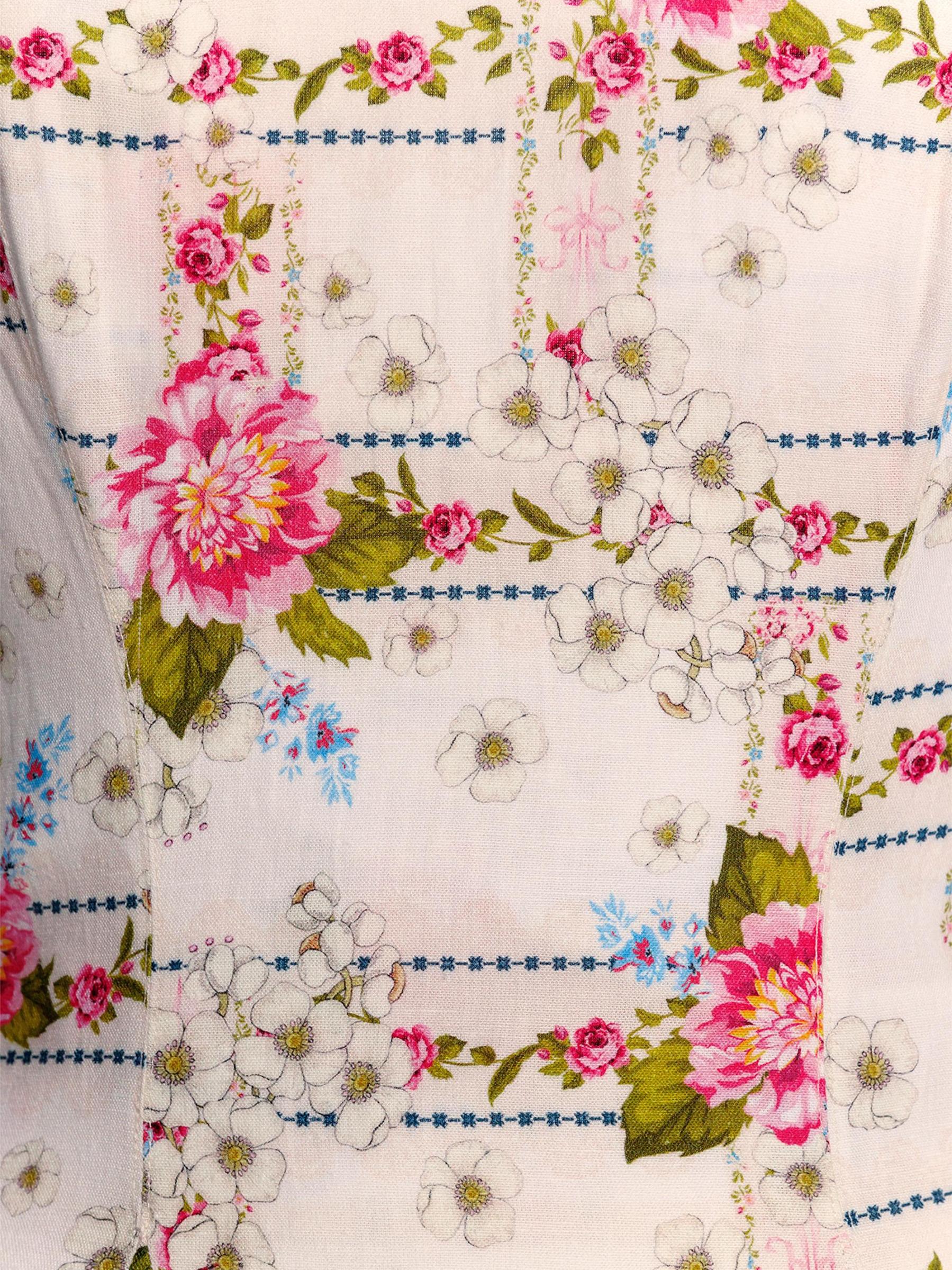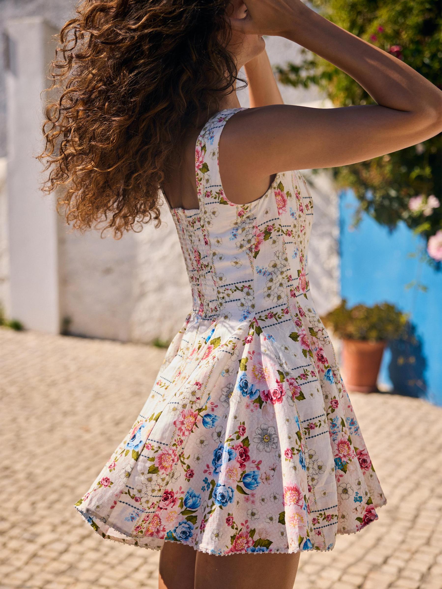 يتميز فستان كريستين ميراكي الصغير من Agua Bendita بنقشة الأزهار ويتميز بتنورة ذات ثنيات وظهر مطرز.