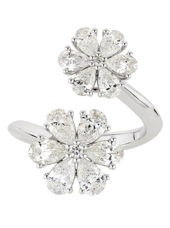من مجموعة L'Heure du Diamant. يتألق خاتم شوبارد الرائع المصنوع من الذهب الأبيض عيار 18 قيراطًا بشكل جميل مع الماس المستدير والمقطع على شكل كمثرى.