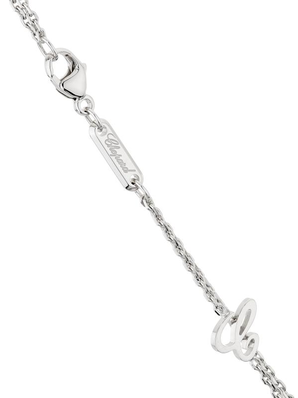 من مجموعة L'Heure du Diamant. تتميّز قلادة شوبارد، المصنوعة من الذهب الأبيض عيار 18 قيراطًا، بقلادة على شكل قلب مفتوح مرصّعة بأحجار ألماس مستديرة متلألئة. تم تعليق هذا السحر المبهر من سلسلة مزدوجة رائعة تتخللها ألماسات صغيرة مرصعة بالحواف.