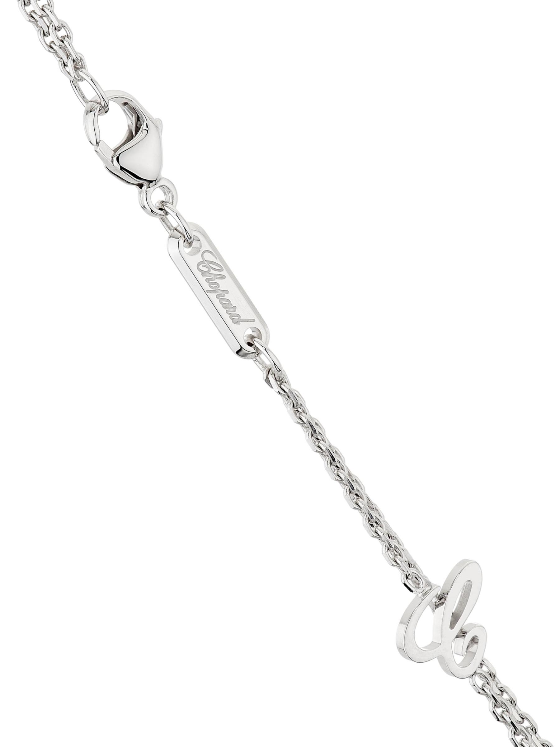من مجموعة L'Heure du Diamant. تتميّز قلادة شوبارد، المصنوعة من الذهب الأبيض عيار 18 قيراطًا، بقلادة على شكل قلب مفتوح مرصّعة بأحجار ألماس مستديرة متلألئة. تم تعليق هذا السحر المبهر من سلسلة مزدوجة رائعة تتخللها ألماسات صغيرة مرصعة بالحواف.الماس، 3.70 طن مكعب درجة لون الماس: F-G درجة وضوح الماس: IF-VVS ذهب أبيض عيار 18 قيراط مشبك لوبستر صُنع في ألمانيا