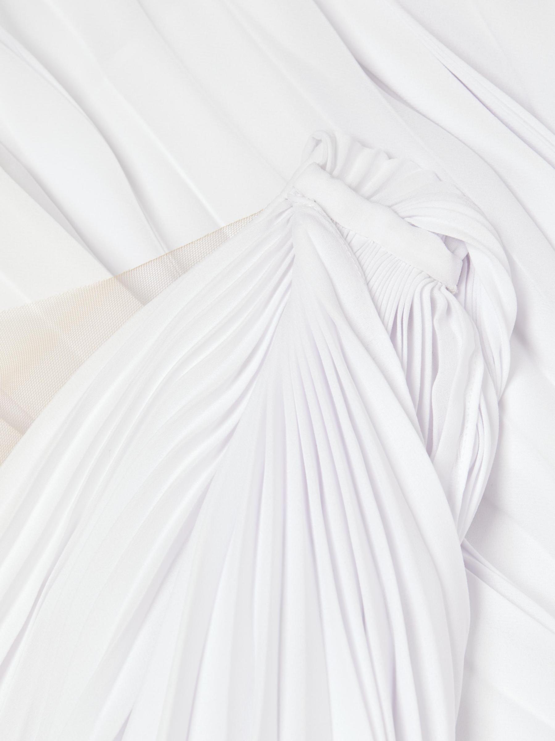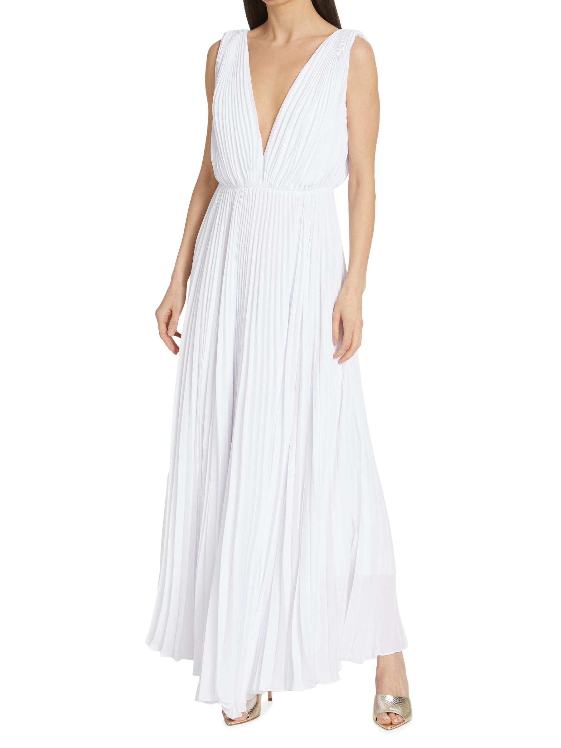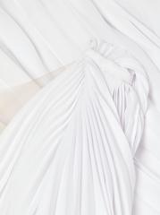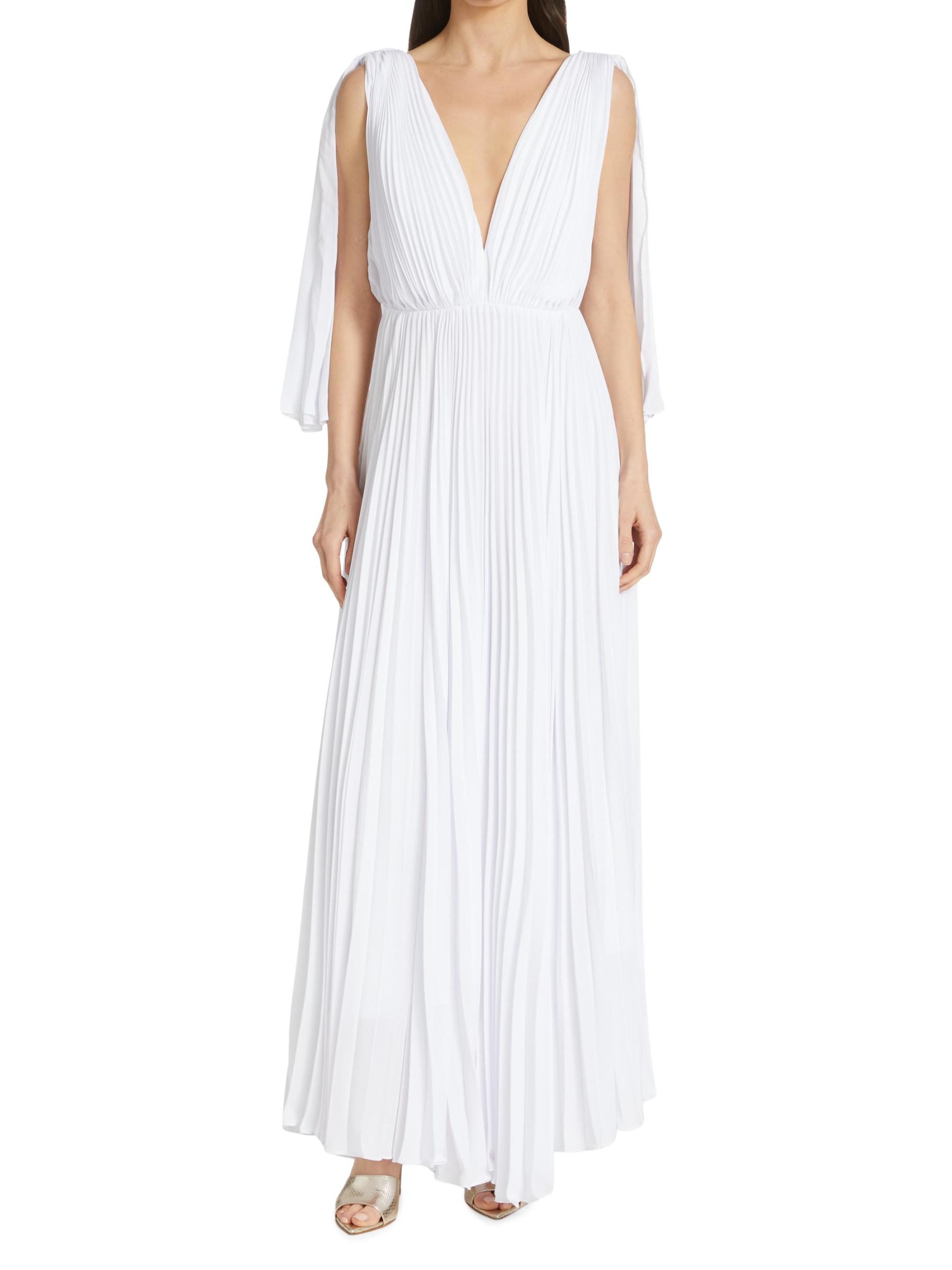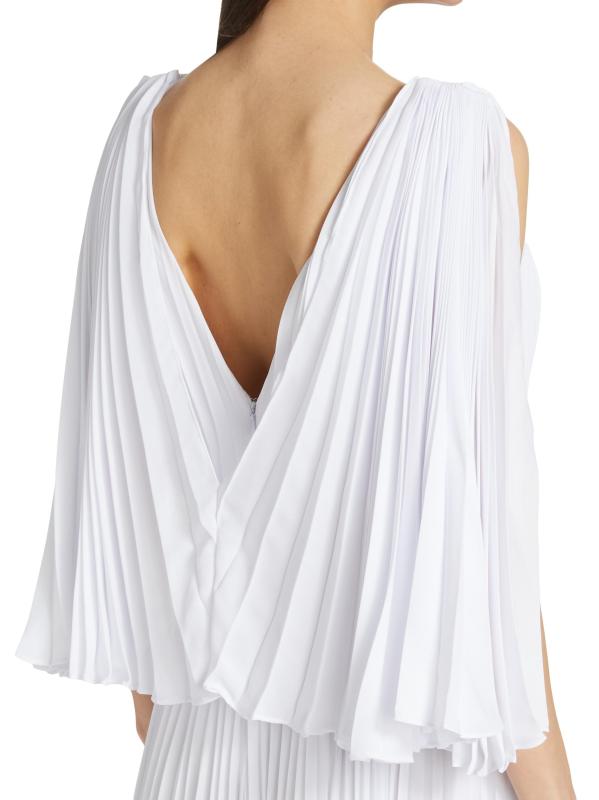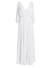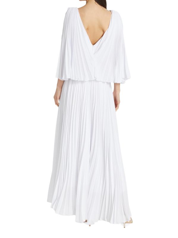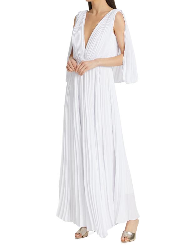 تم تصميم هذا الفستان المصمم على الطراز اليوناني بأسلوب بليسي، مع فتحة رقبة واسعة على شكل حرف V مدعومة بتفاصيل كابيليت.