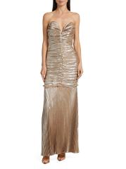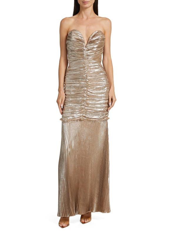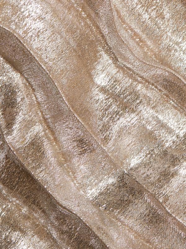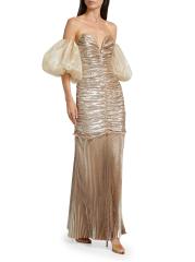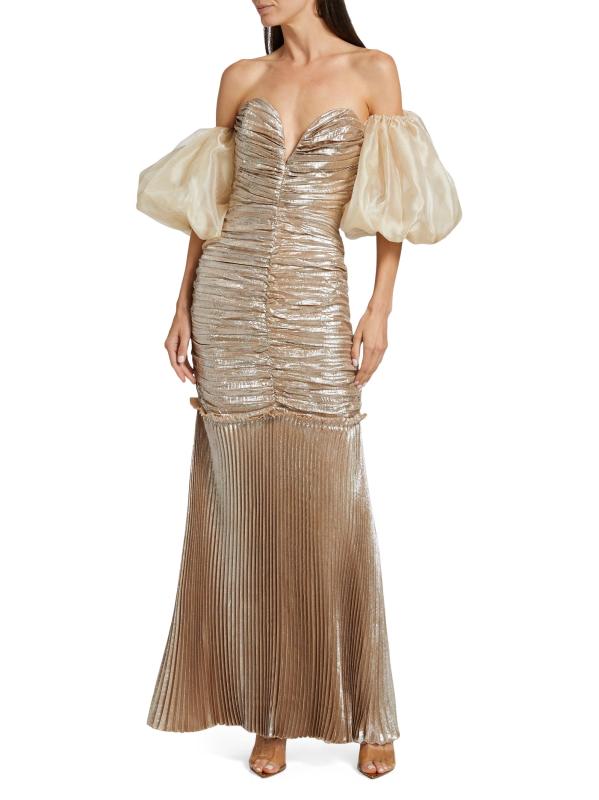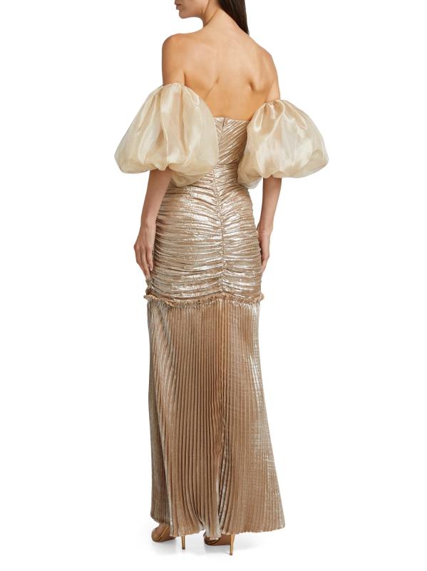 من مجموعة La Fete. يتميّز فستان Parlor المعدني المزركش والمثنيات من L'Idée برقبة رومنسية وأكمام بالون قصيرة.