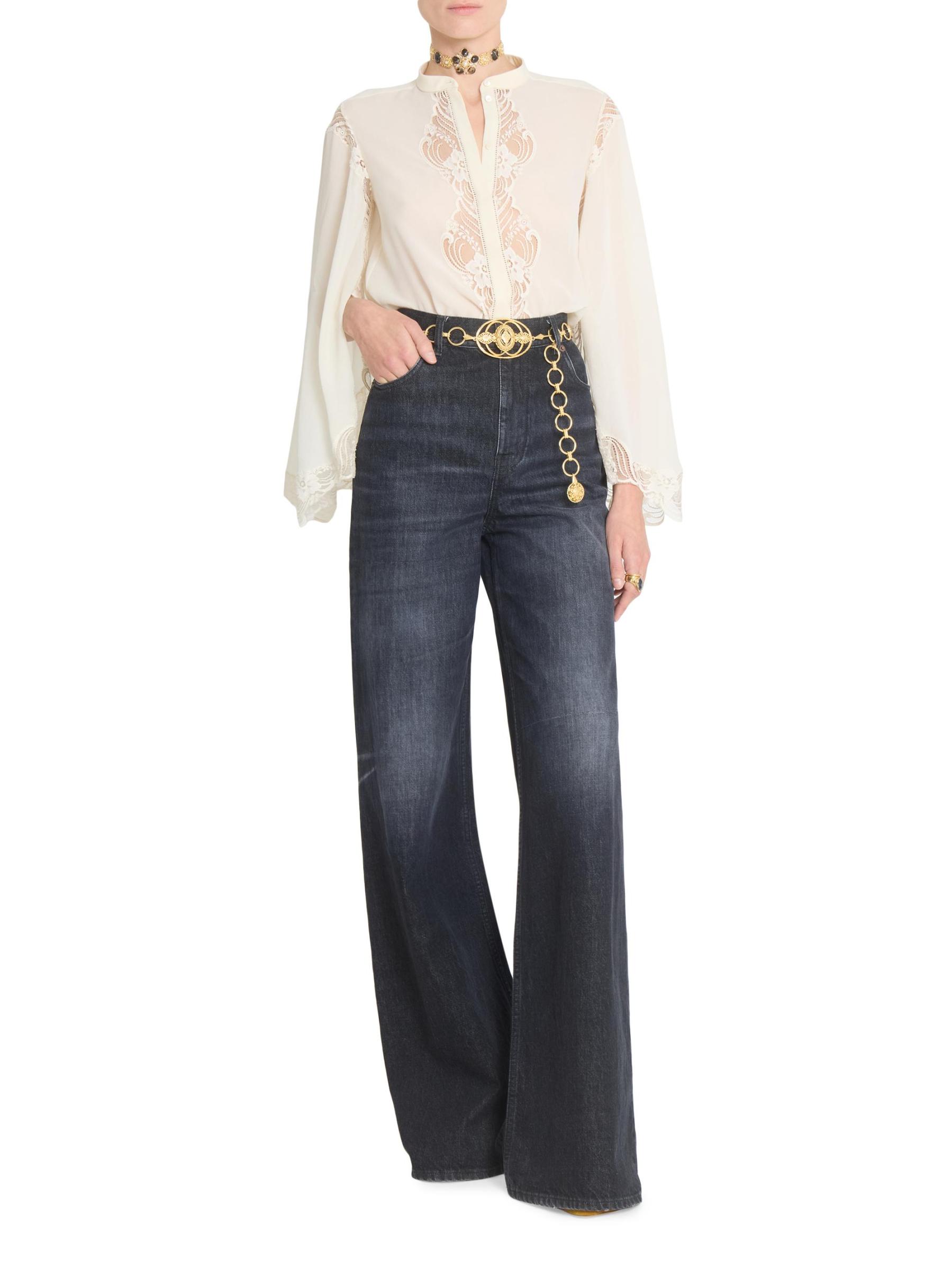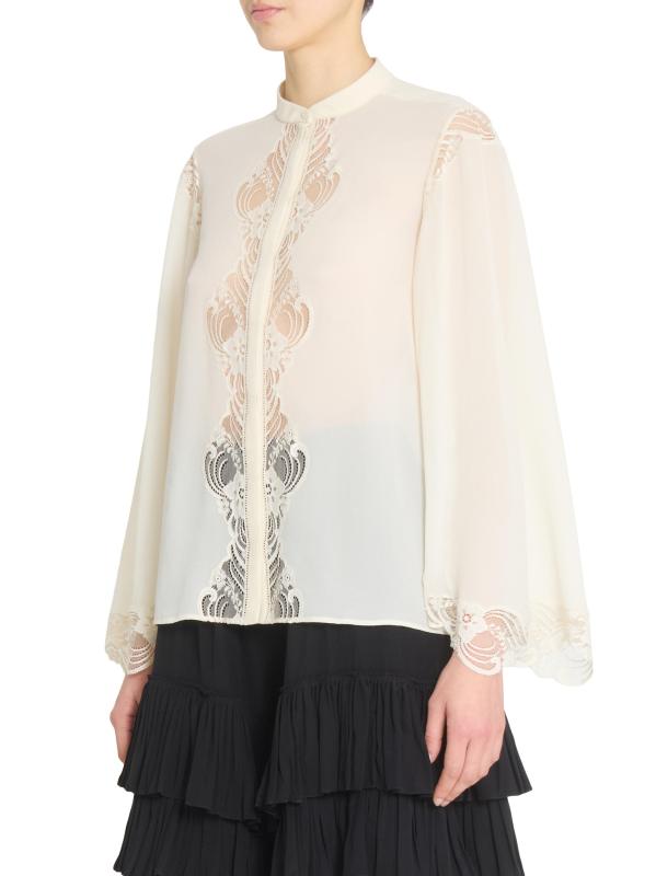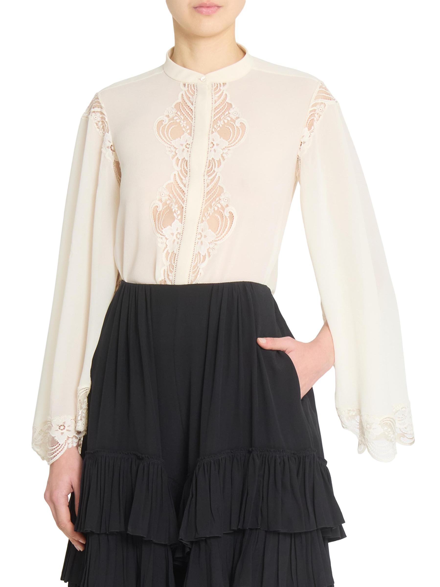 تتميّز بلوزة Chloé المصنوعة من الحرير بأزرار عرق اللؤلؤ التي تزيّنها تفاصيل الدانتيل الرقيقة وأكمام الرأس الطويلة.