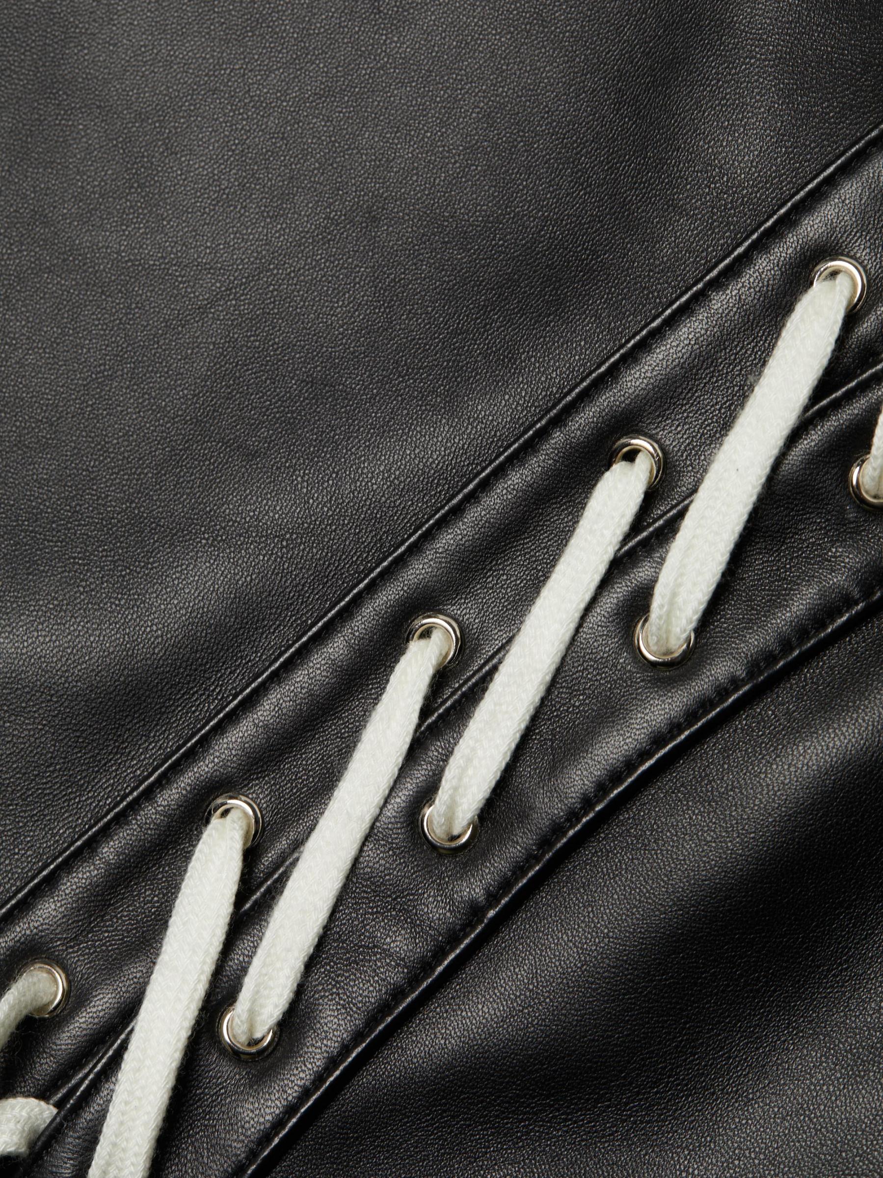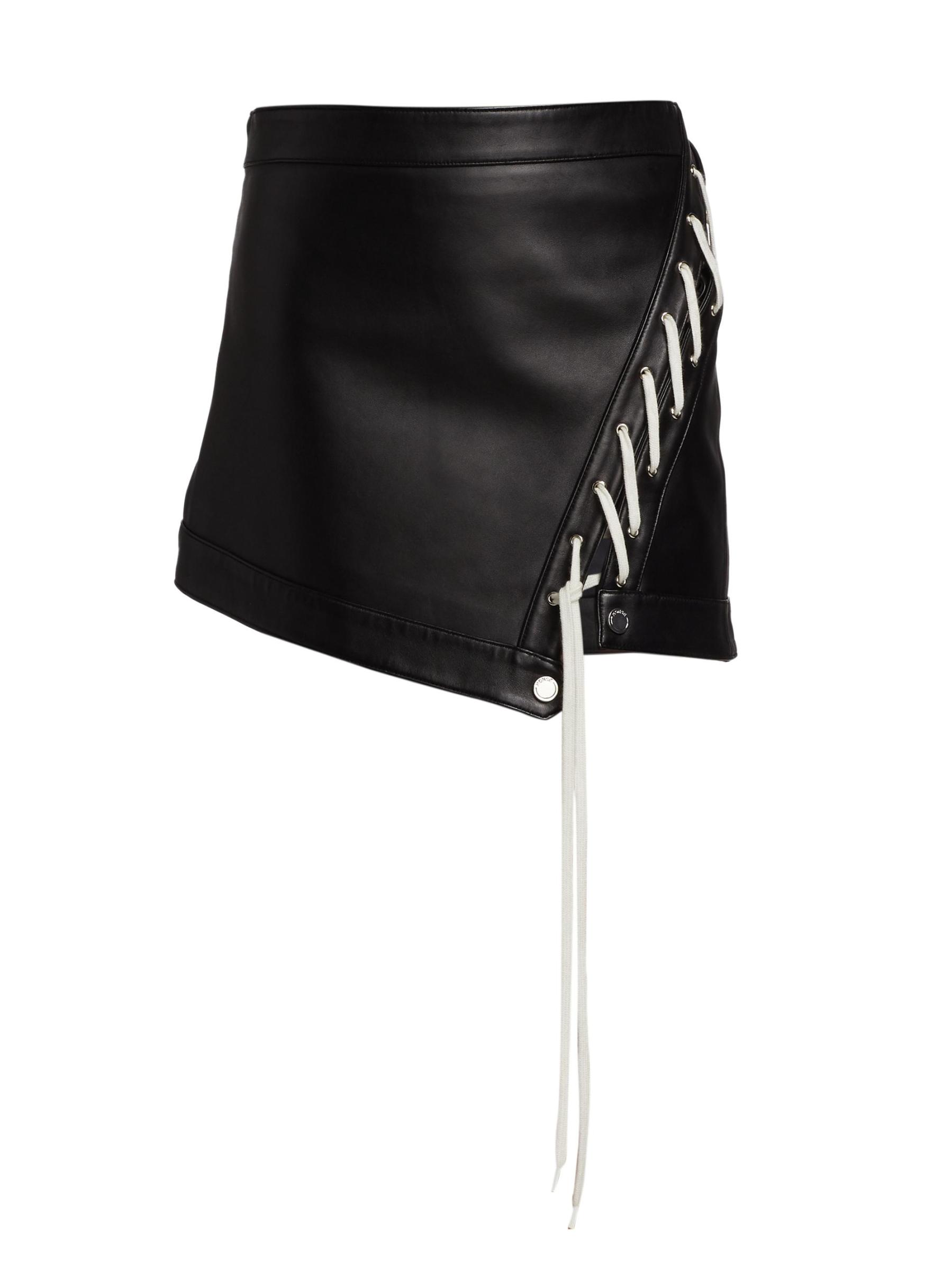 من مجموعة خريف 2021. تنورة جلدية صغيرة تتميز بتفاصيل جانبية من الدانتيل الأبيض الملتوي.