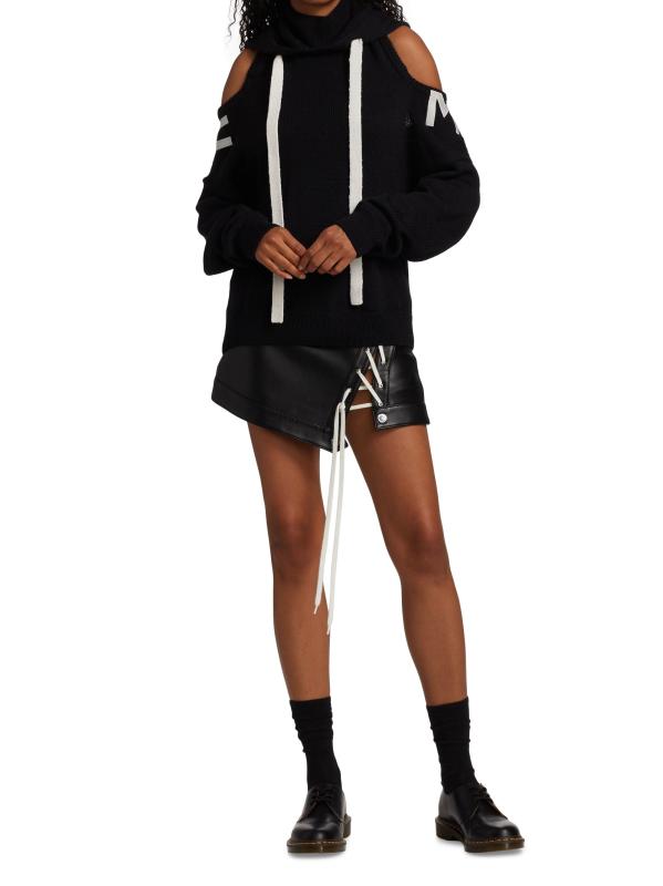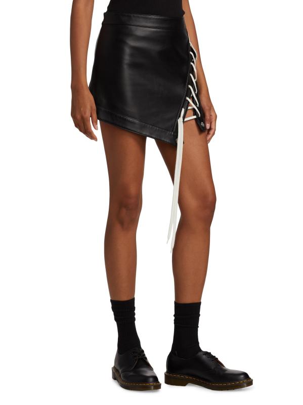 من مجموعة خريف 2021. تنورة جلدية صغيرة تتميز بتفاصيل جانبية من الدانتيل الأبيض الملتوي.سحّاب جانبي مخفي إغلاق بأزرار كبس عند الحافة حافة غير متماثلة البطانة: 100% أسيتات جلد خروف 100% تنظيف جاف مستوردة