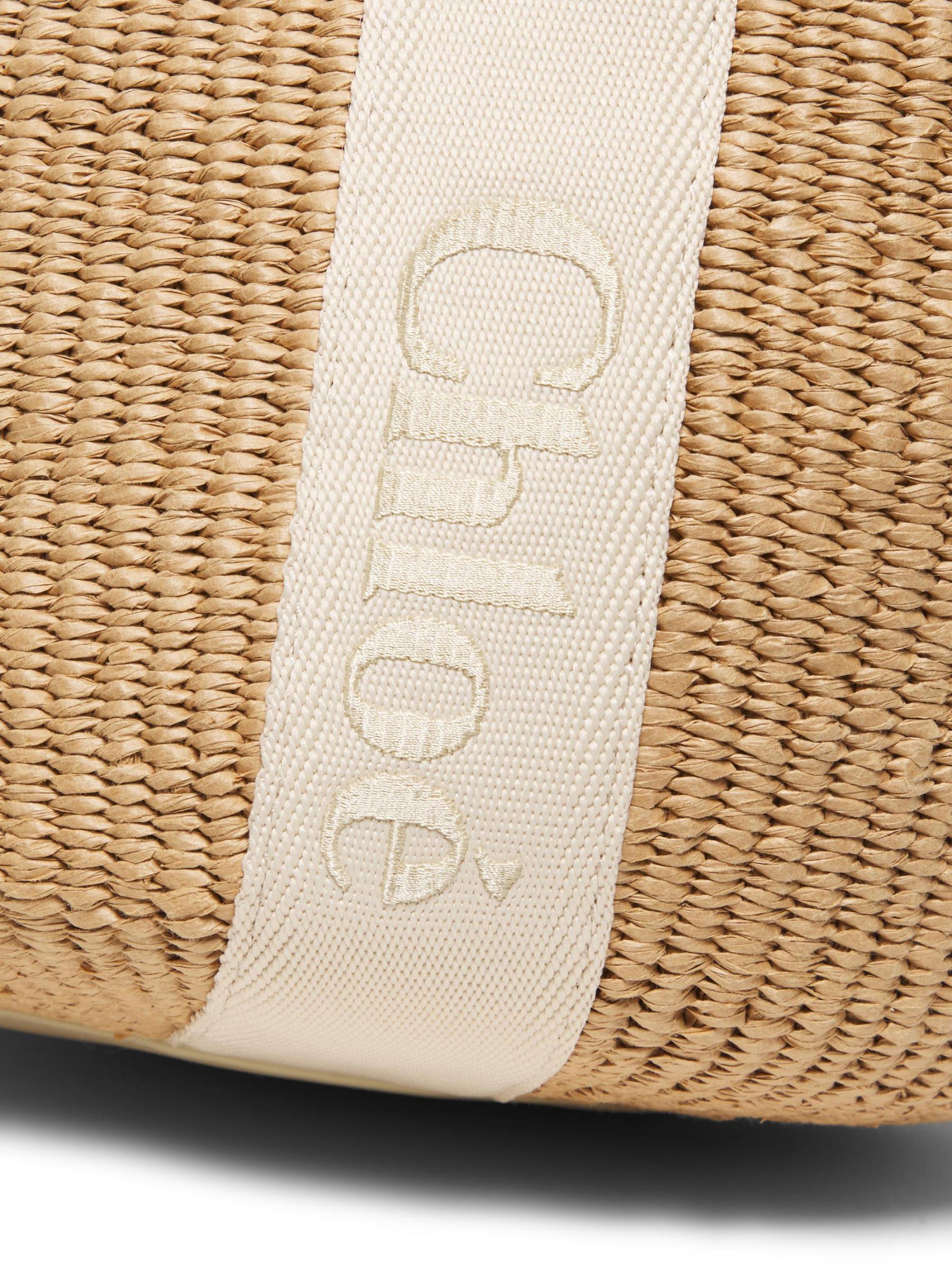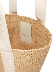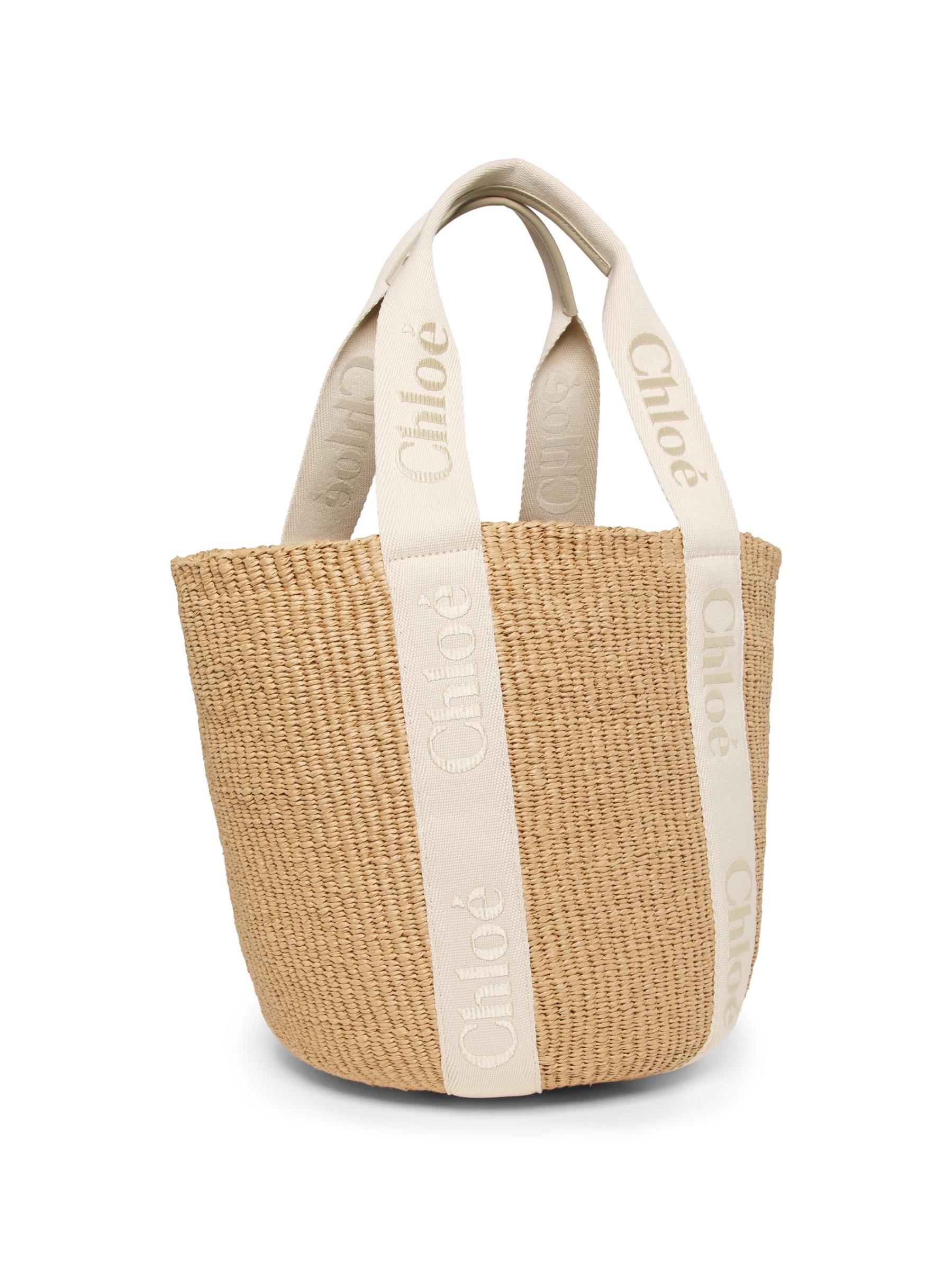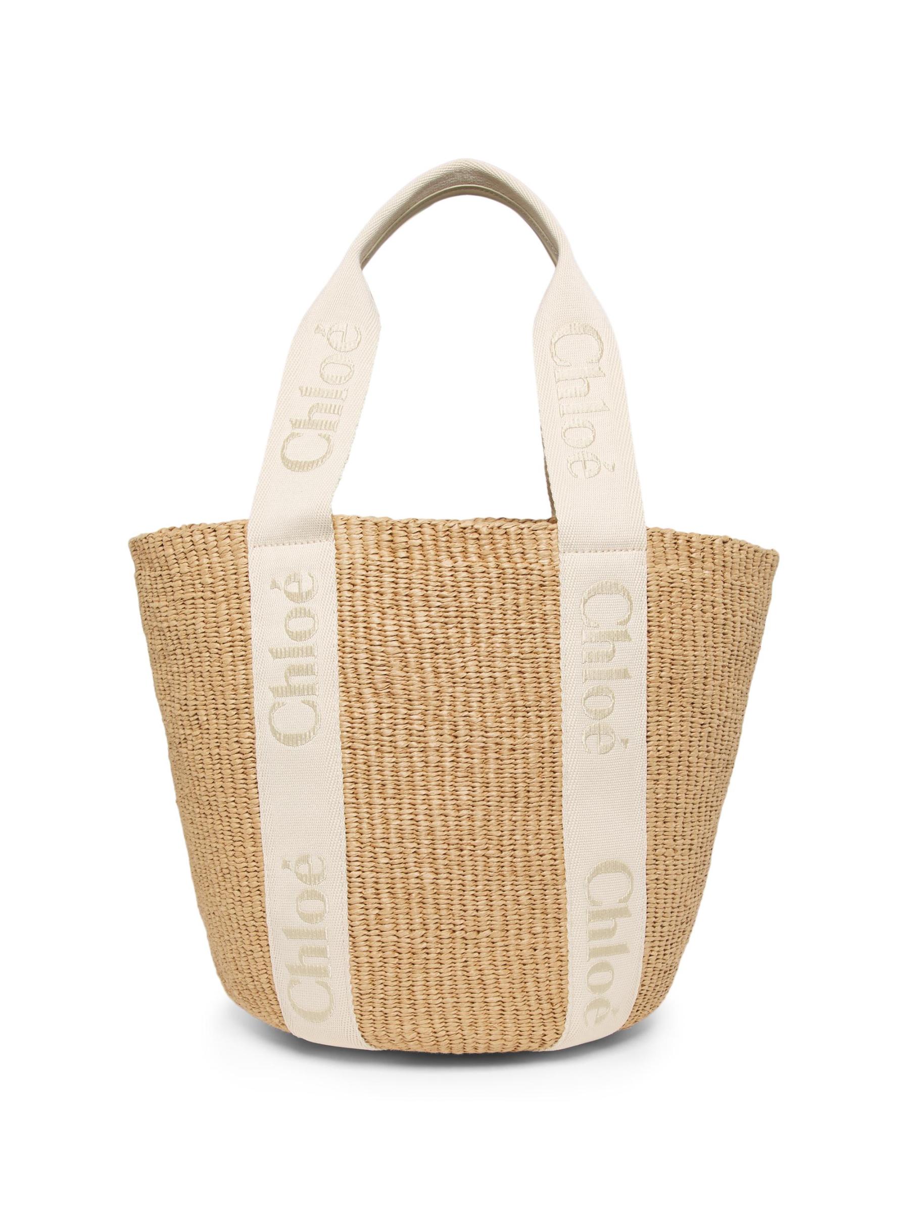 تتميز حقيبة السلة الخشبية الكبيرة بهيكل منسوج واسع. تُكمل الأحزمة ذات العلامات التجارية المتباينة واللمسات الجلدية المظهر.