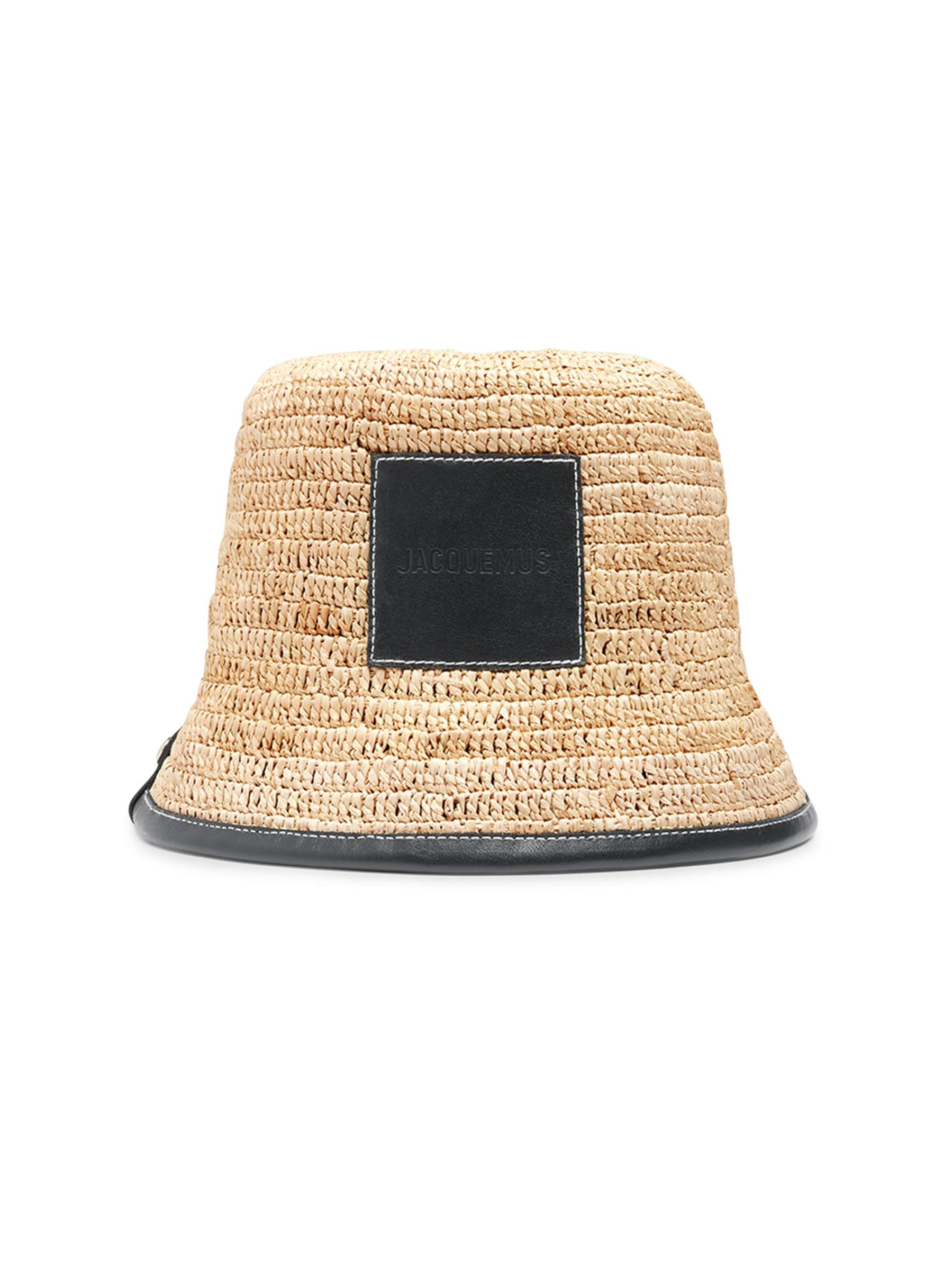 تتميز قبعة Le Bob Soli ذات الدلو هذه من Jacquemus، المصنوعة من الرافيا والجلد، بخياطة متباينة