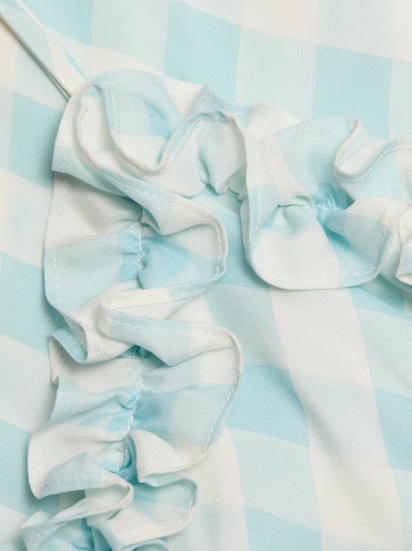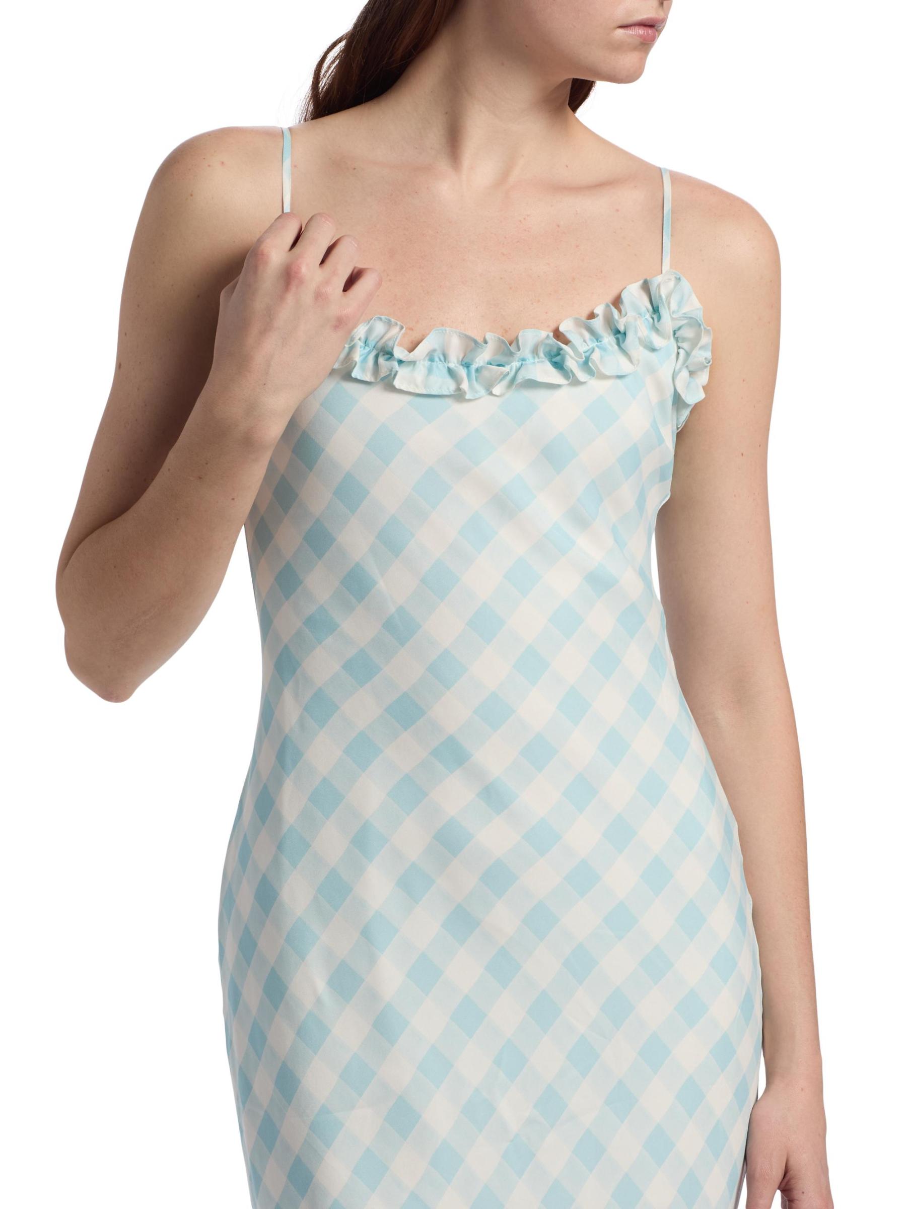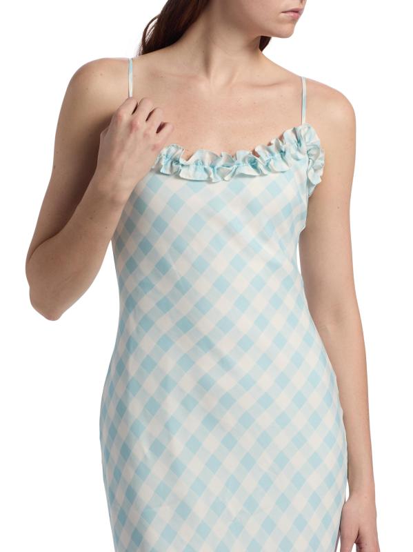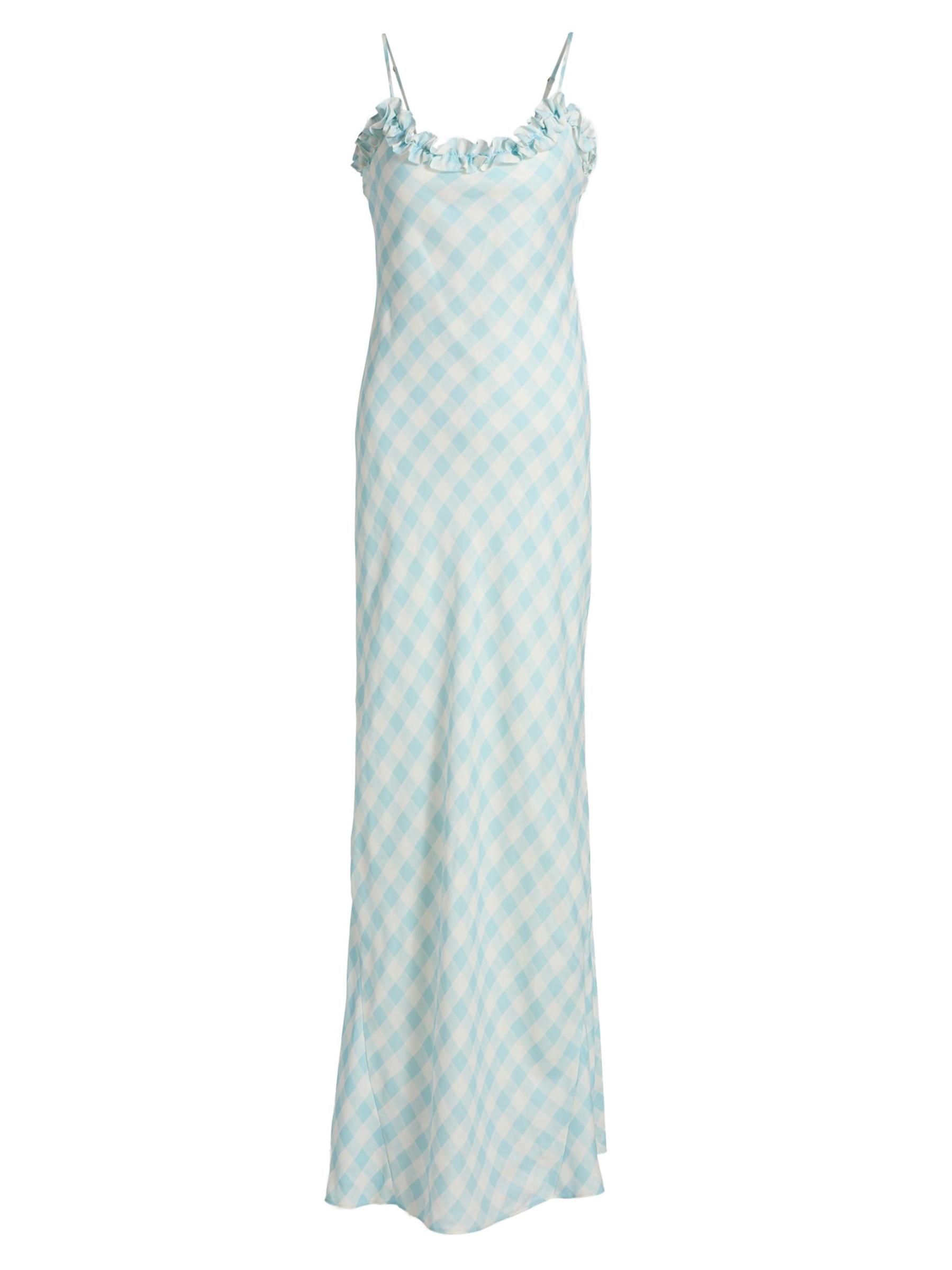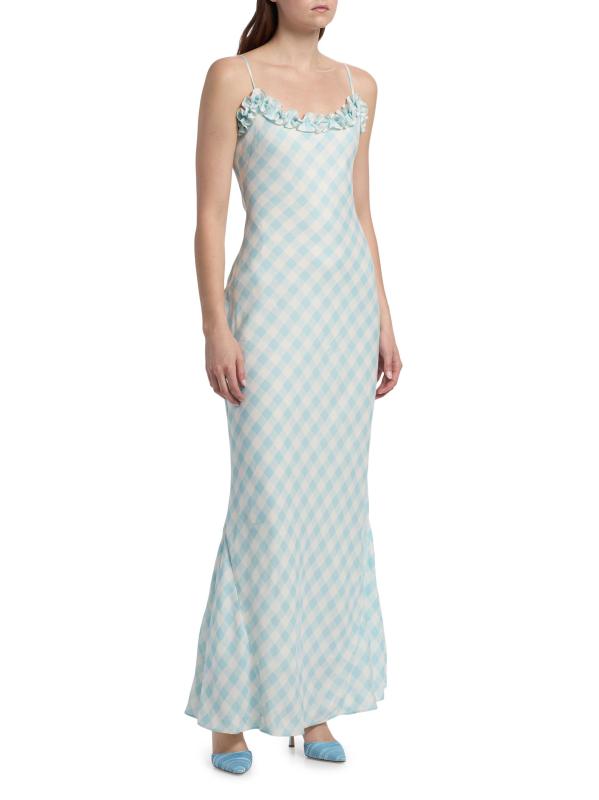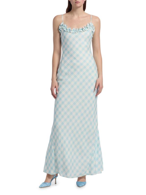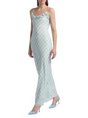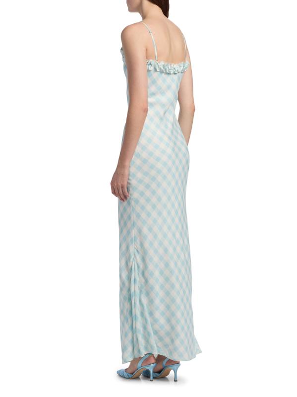 من مجموعة لو فلور. يتميز فستان Posey maxi هذا من أستون ستوديو بتصميم متحيز وطبعة مربعات قطرية وتفاصيل كشكشة.
