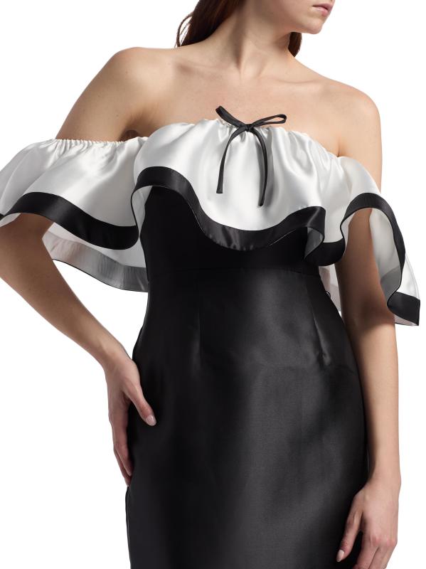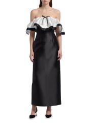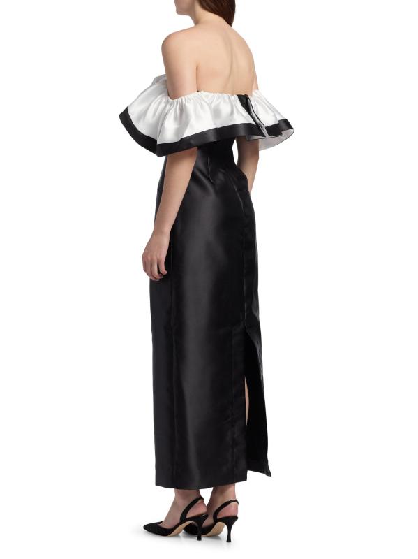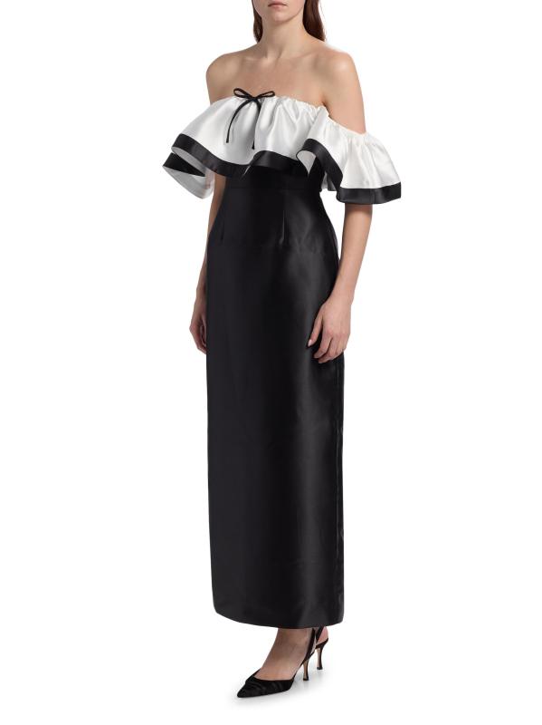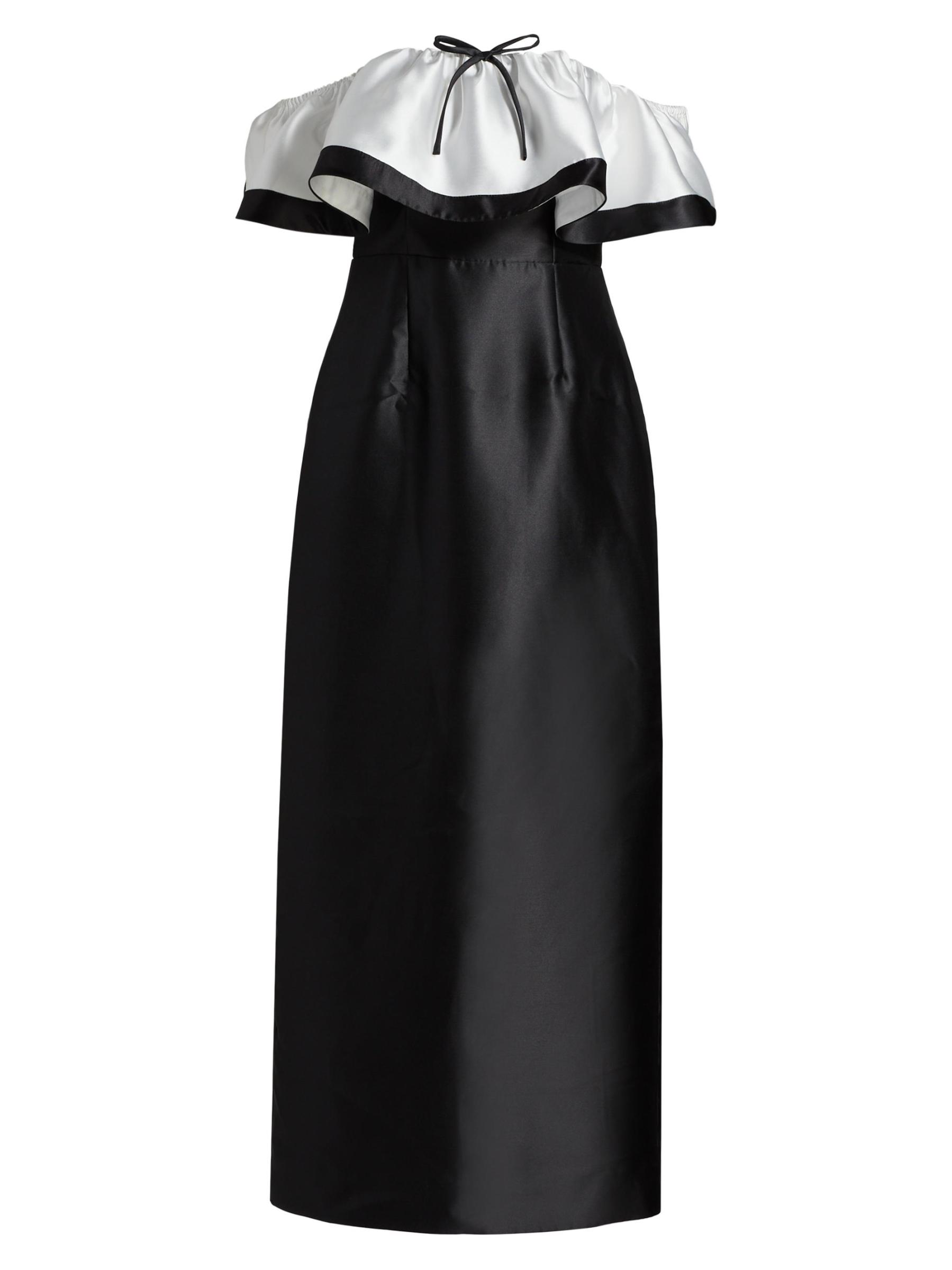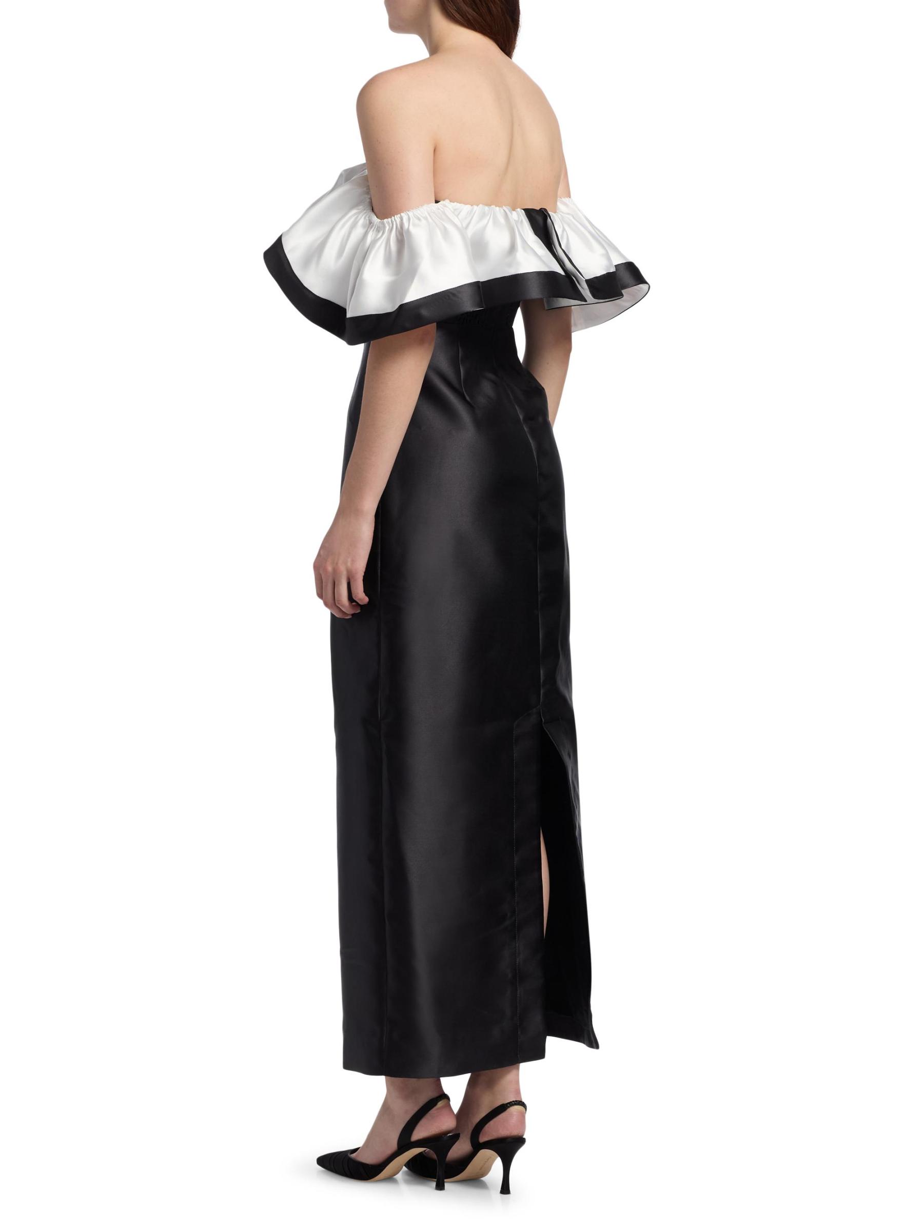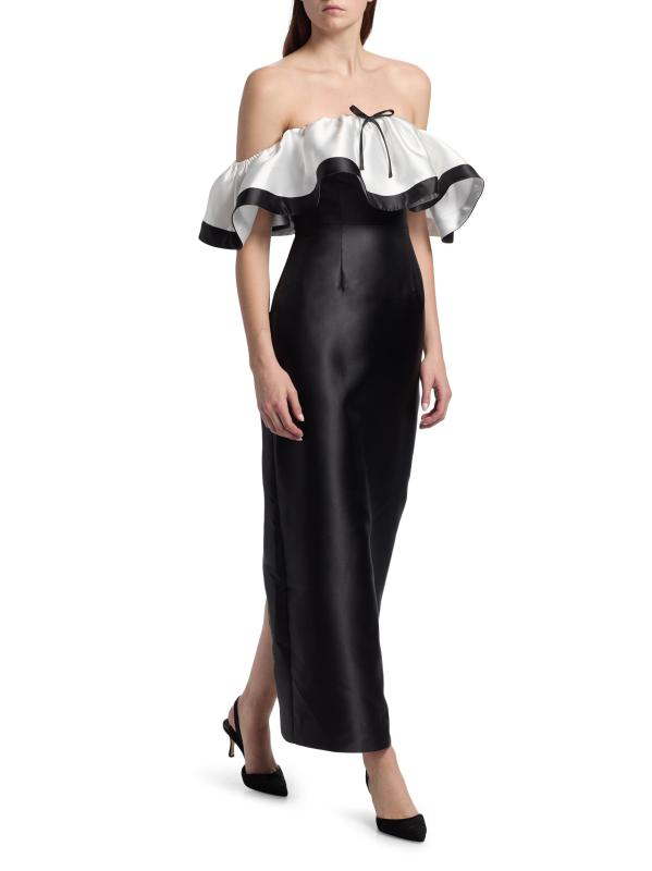من مجموعة لو فلور. تم تصميم فستان Primrose maxi هذا من أستون ستوديو بتقويرة مكشكشة بلون مغاير مكشوف الكتفين وتنورة عمودية.
