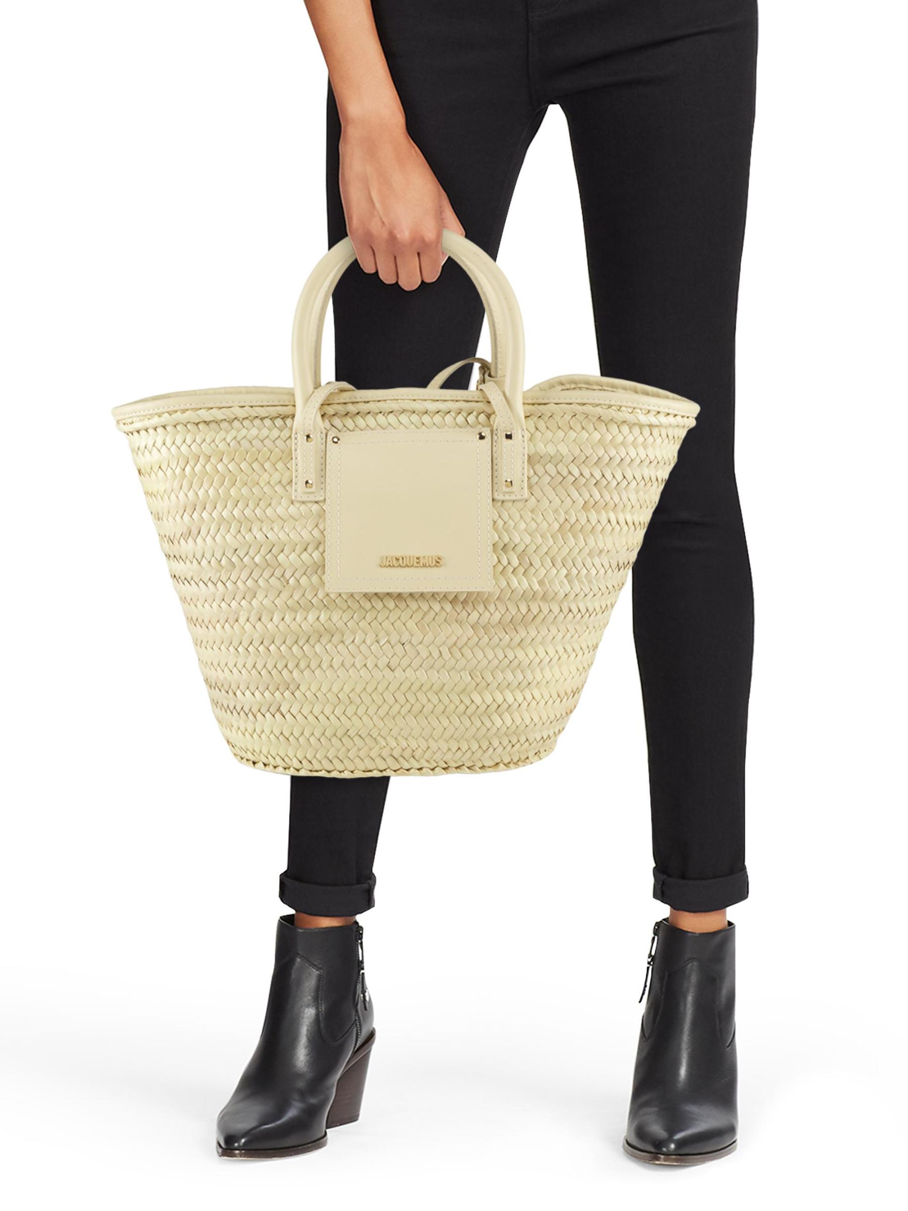 حقيبة Le Panier Soli من Jacquemus مصنوعة من القش المنسوج بتفاصيل جلدية ناعمة. صُنع هذا الطراز الشاطئي في إيطاليا، وتم تفصيله بحروف الشعار باللون الذهبي.