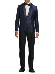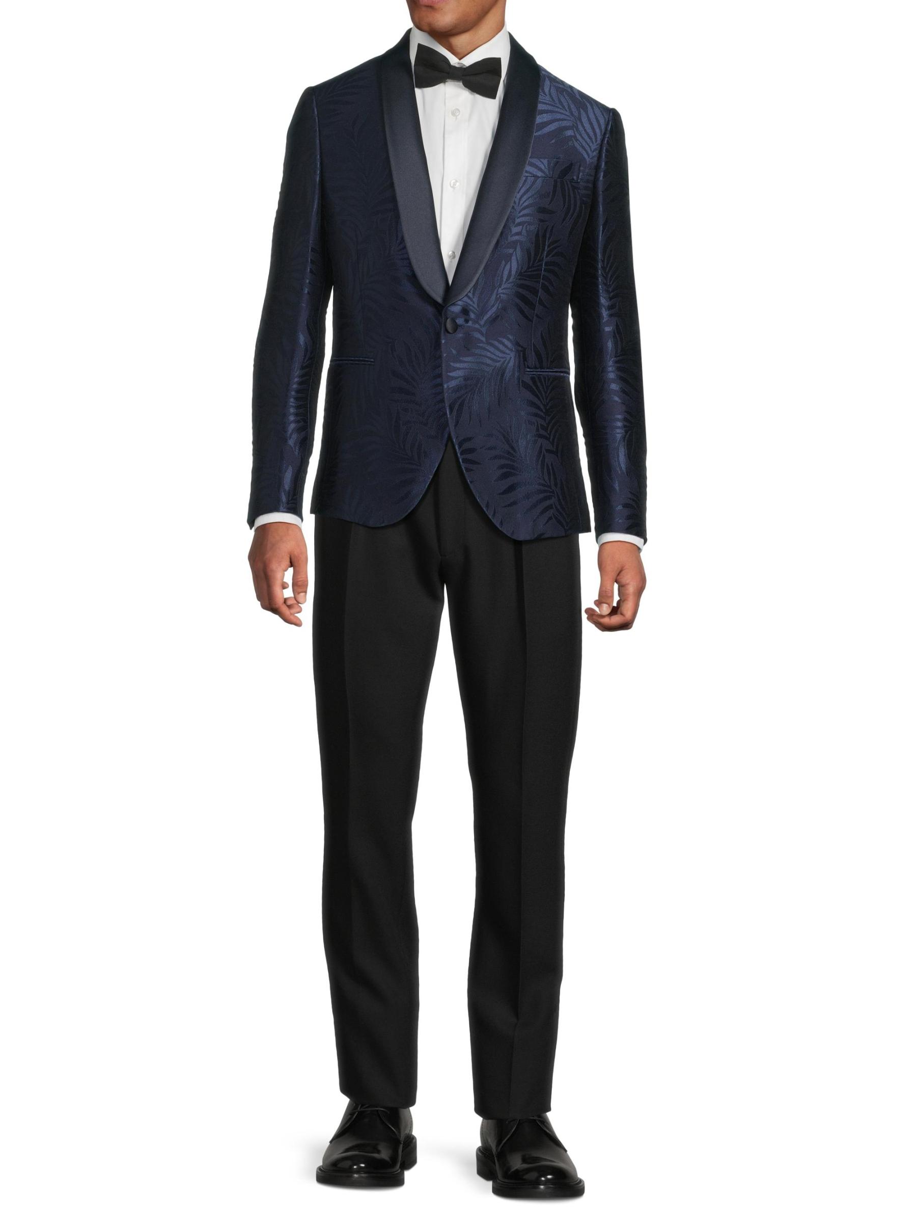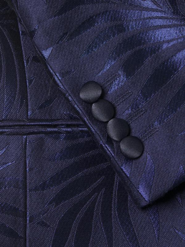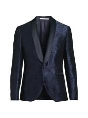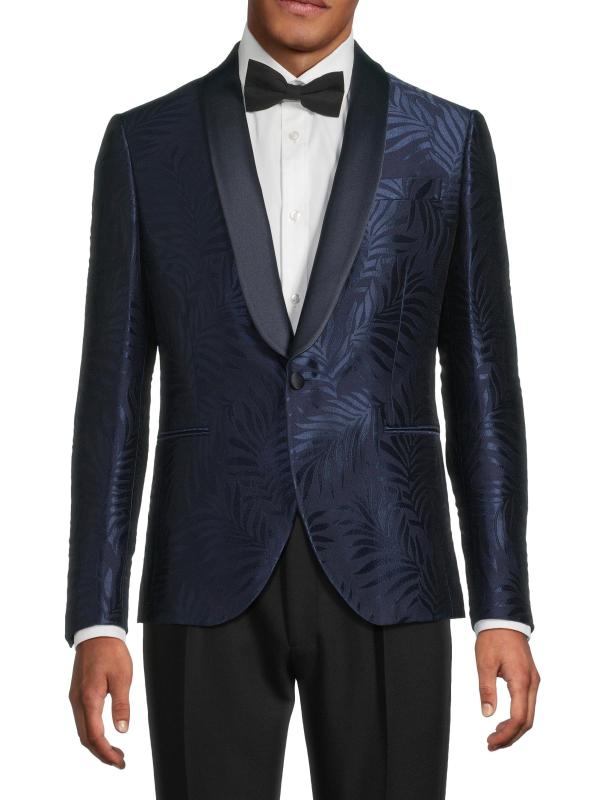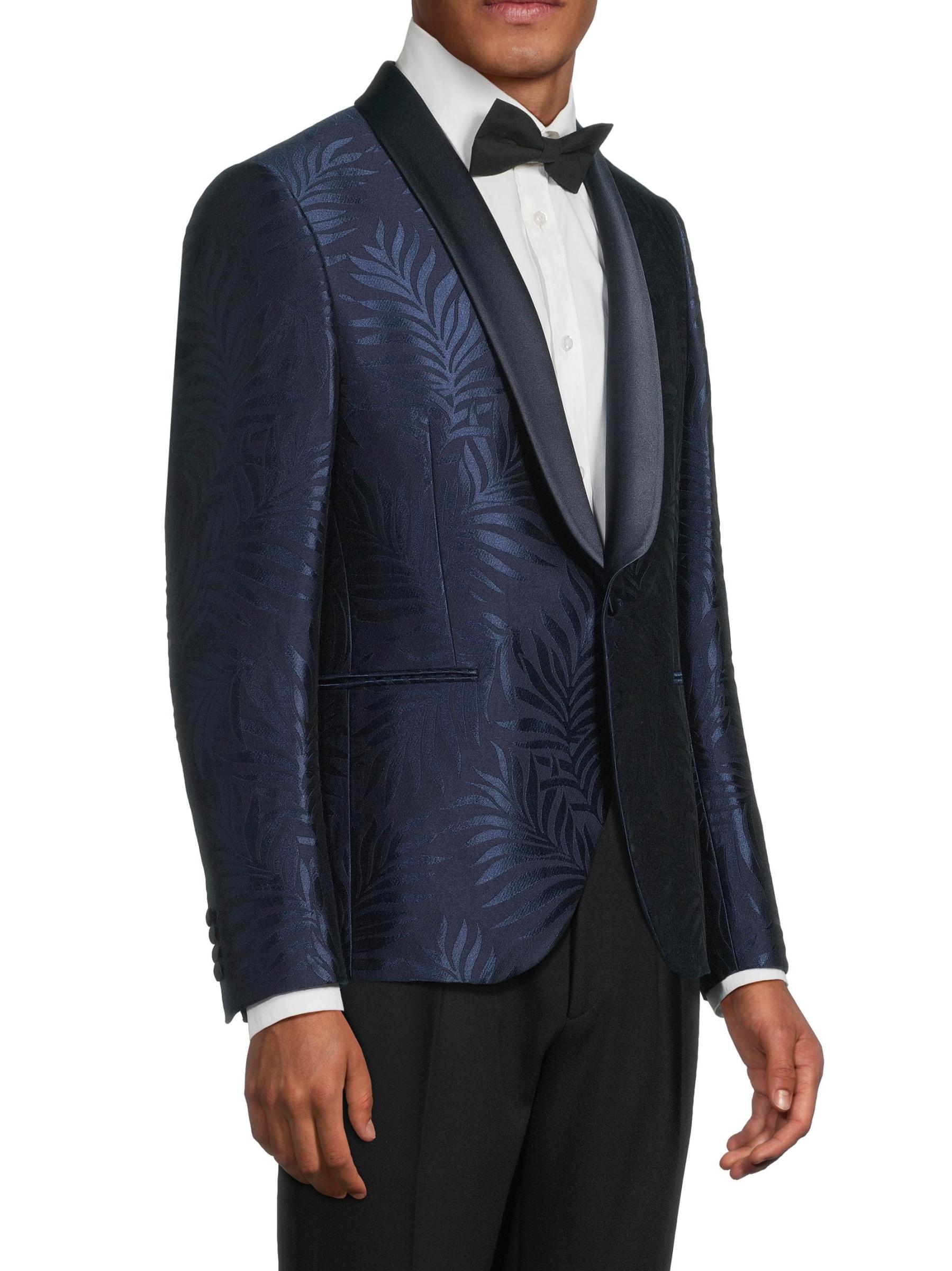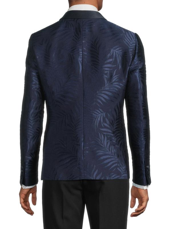 جاكيت العشاء هذا ذو الصدر الواحد من Pal Zileri مصنوع من مزيج من الصوف الساتان ويتميز بطبعة أوراق الشجر وياقة شال من الساتان.