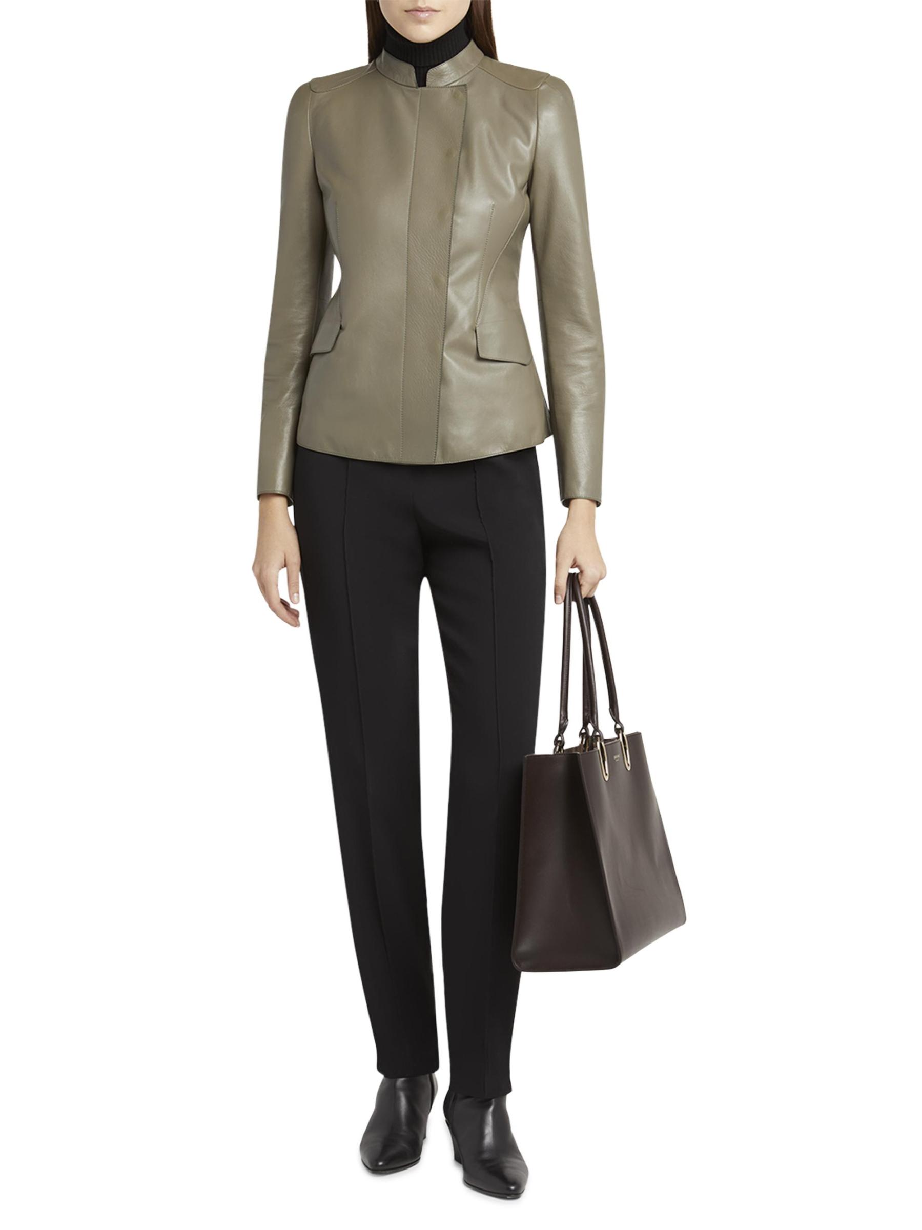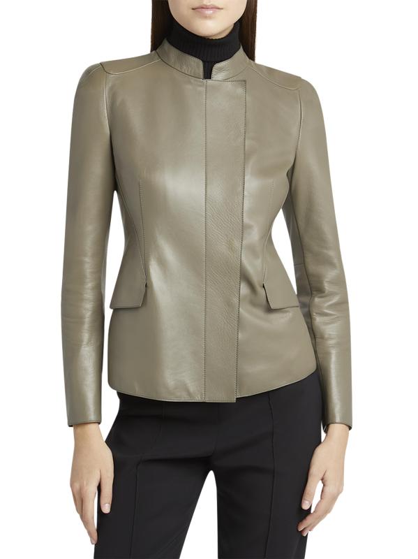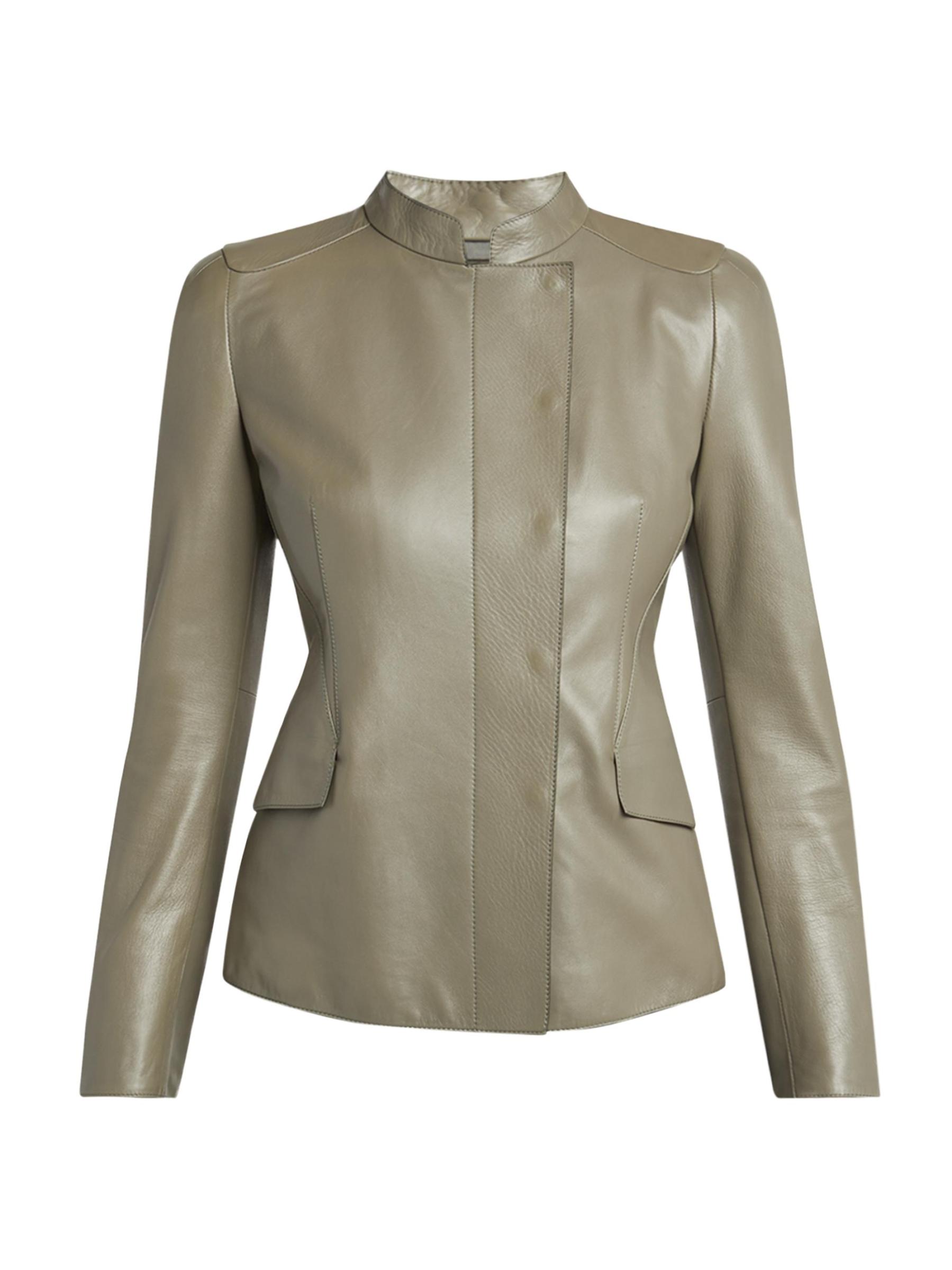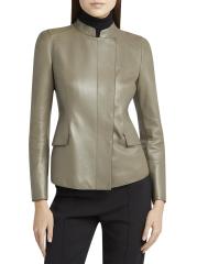 جاكيت جورجيو أرماني مصنوع في إيطاليا من الجلد المرن، ويتميز بياقة عريضة وجيوب رفرف وخصر محكم.
