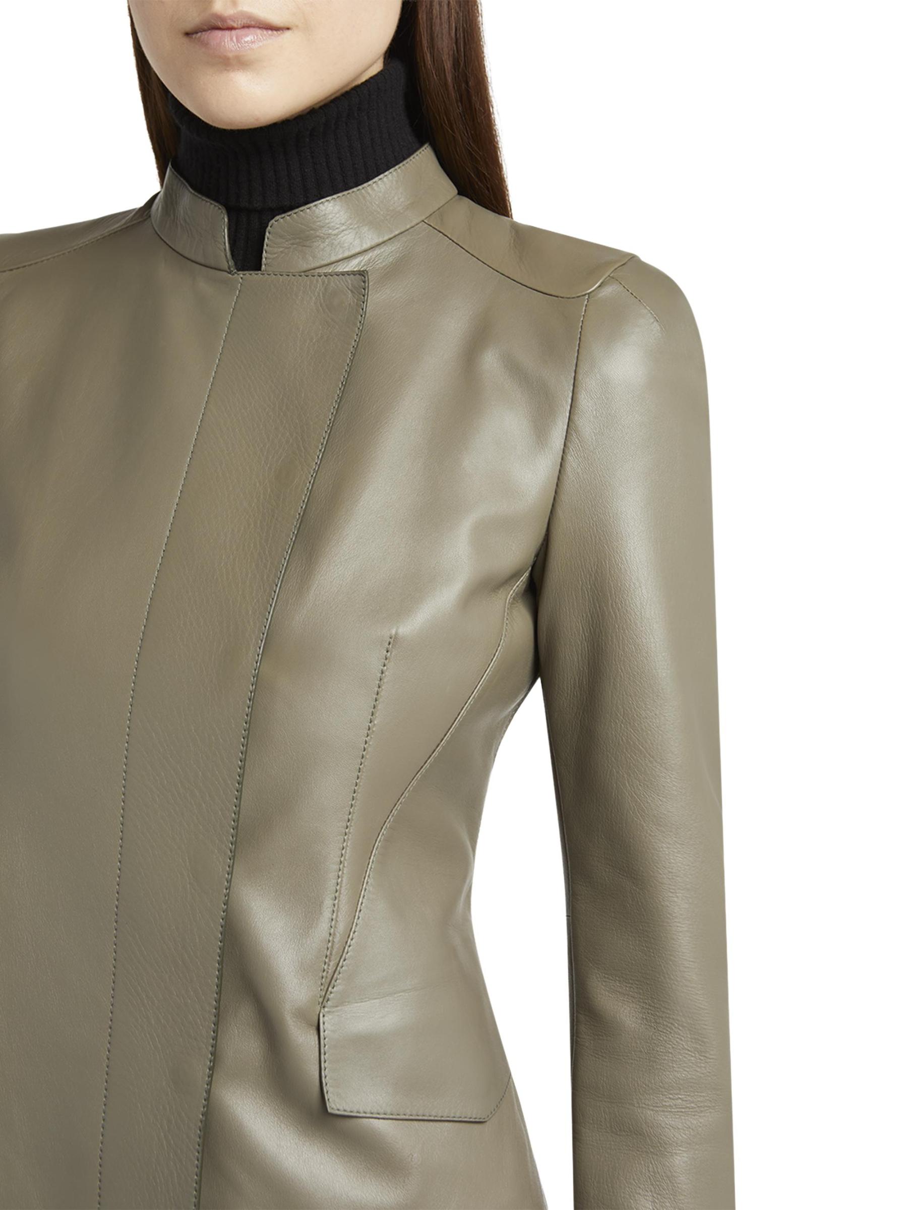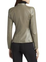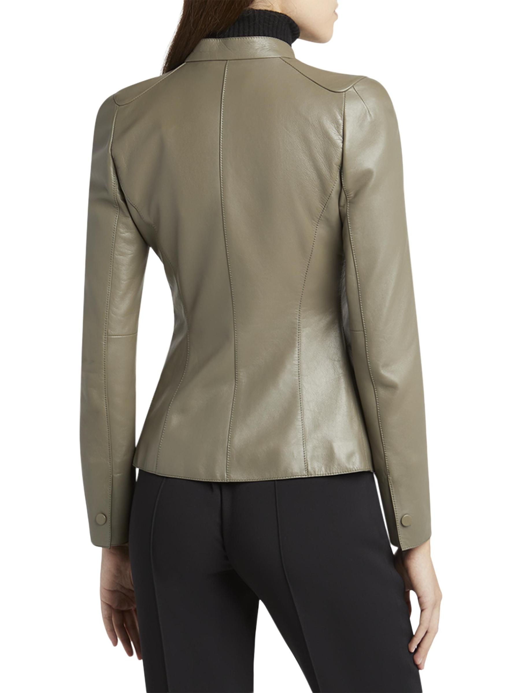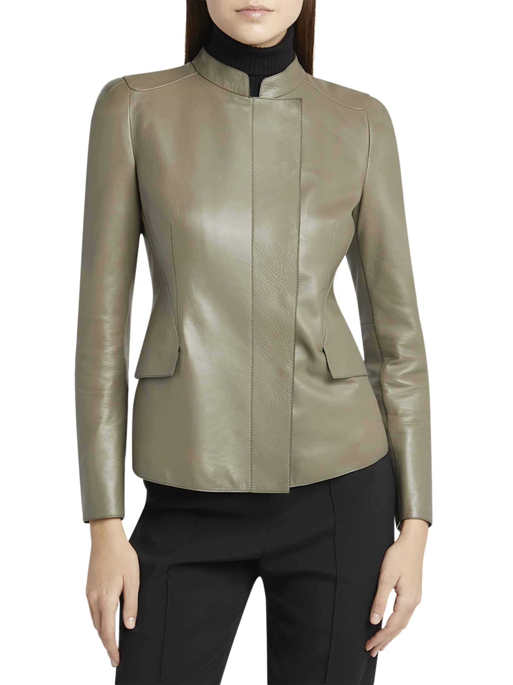 جاكيت جورجيو أرماني مصنوع في إيطاليا من الجلد المرن، ويتميز بياقة عريضة وجيوب رفرف وخصر محكم.