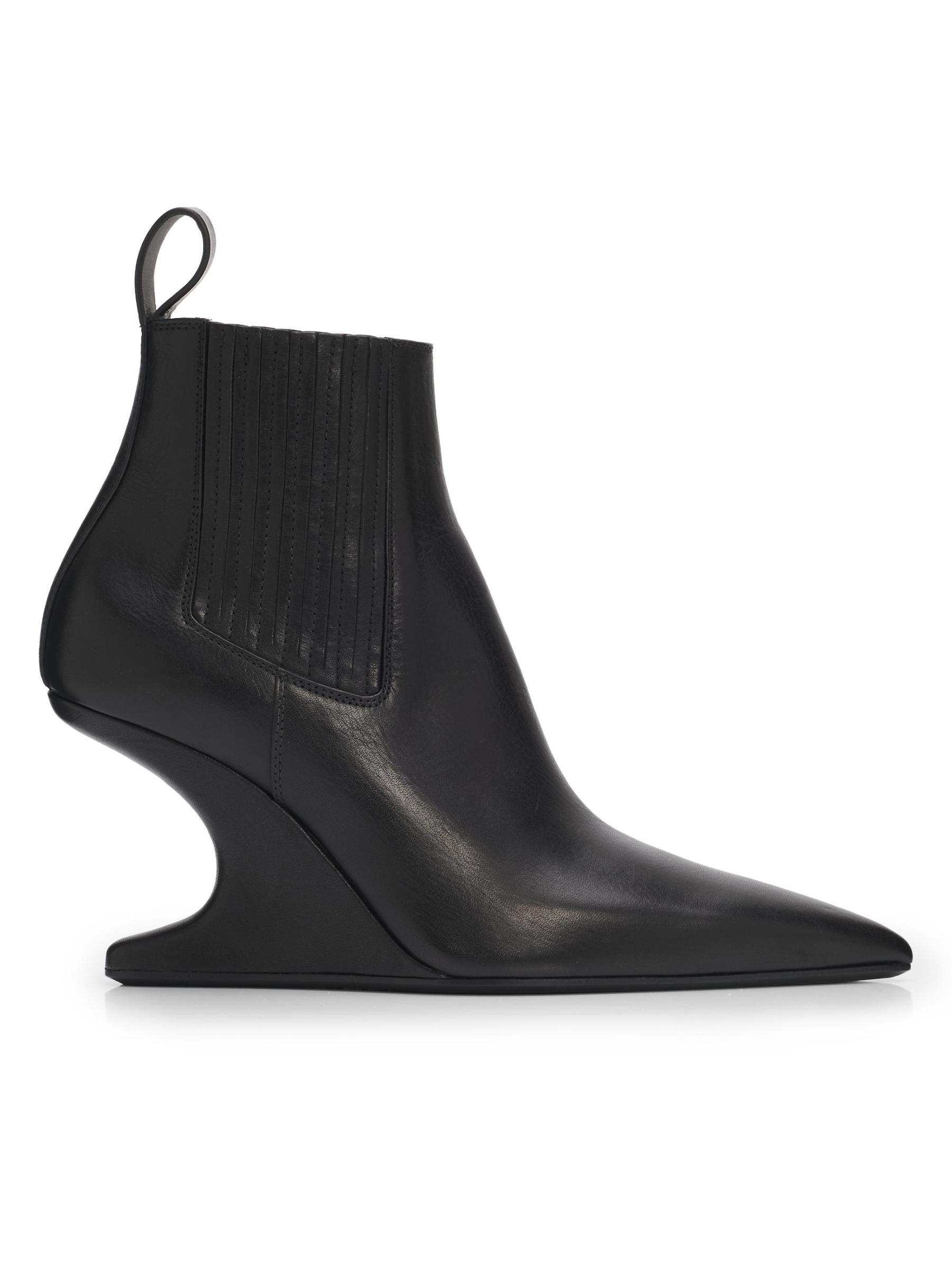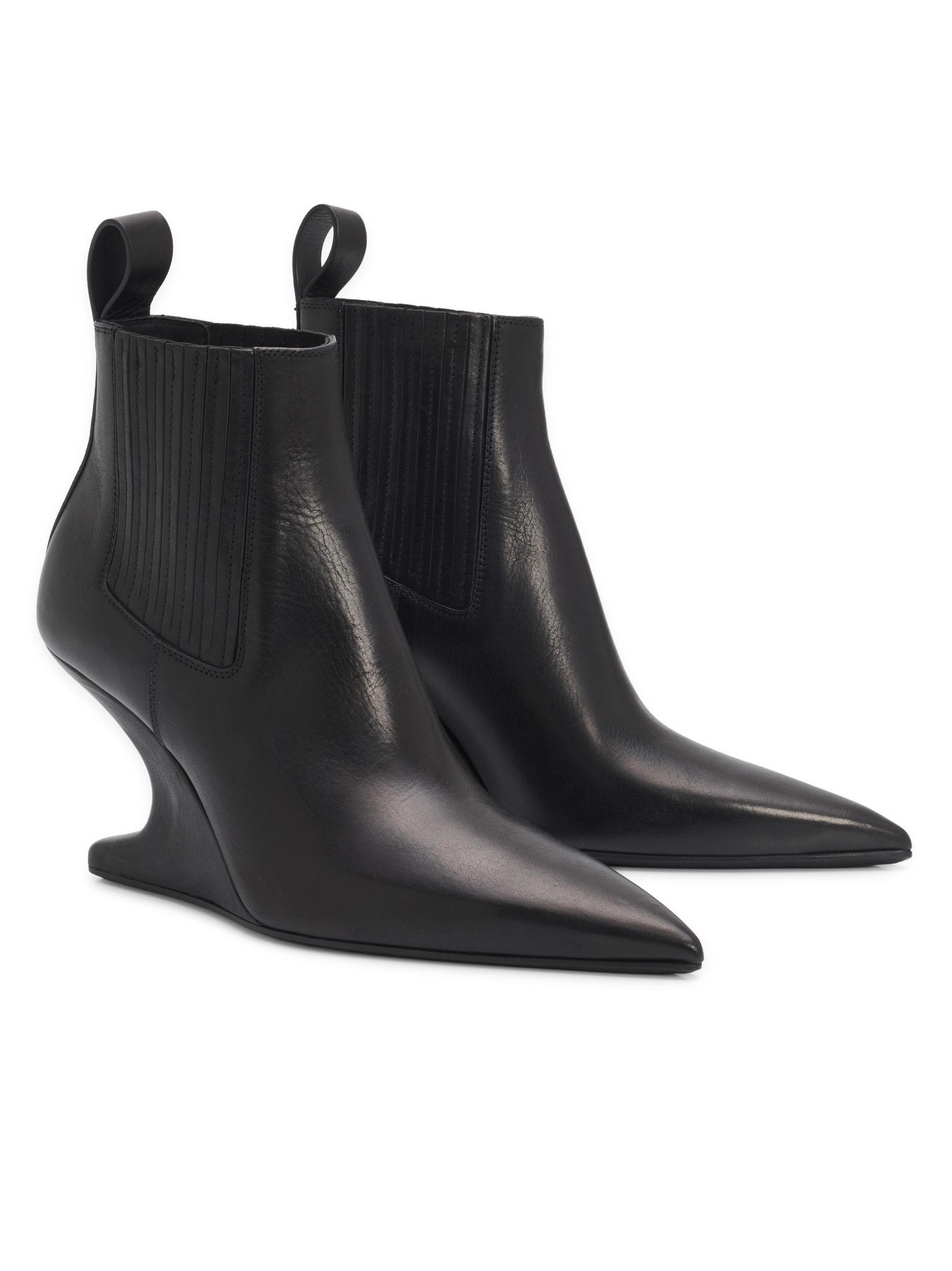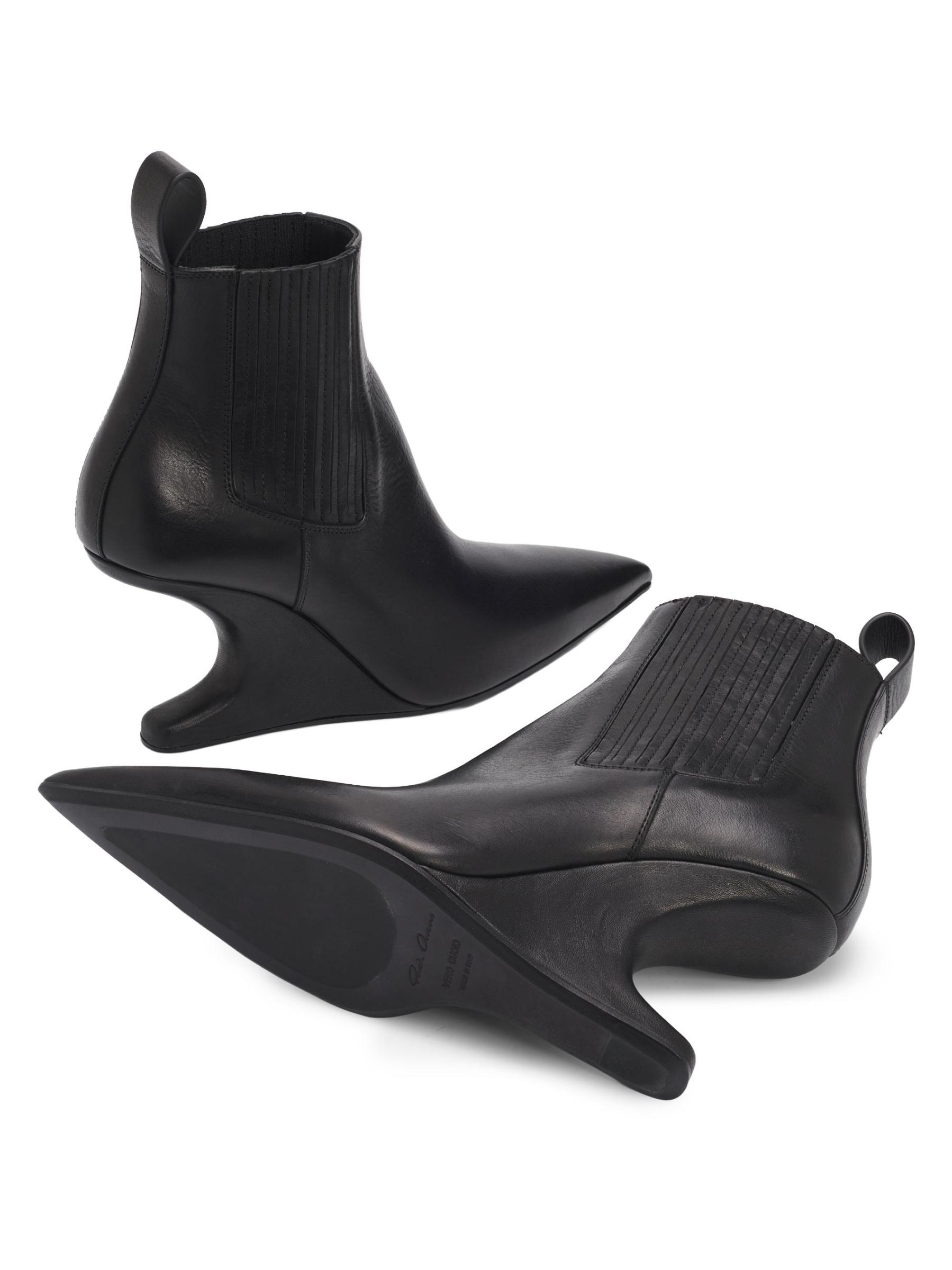 يتميز حذاء Rick Owens المصنوع من الجلد الإيطالي الأنيق بمقدمة مدببة وقماش مطاطي جانبي وكعب مميز.