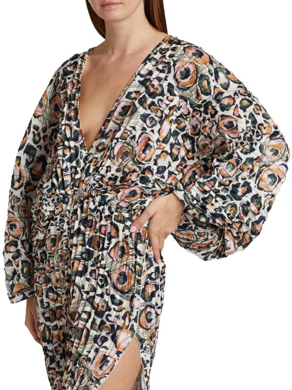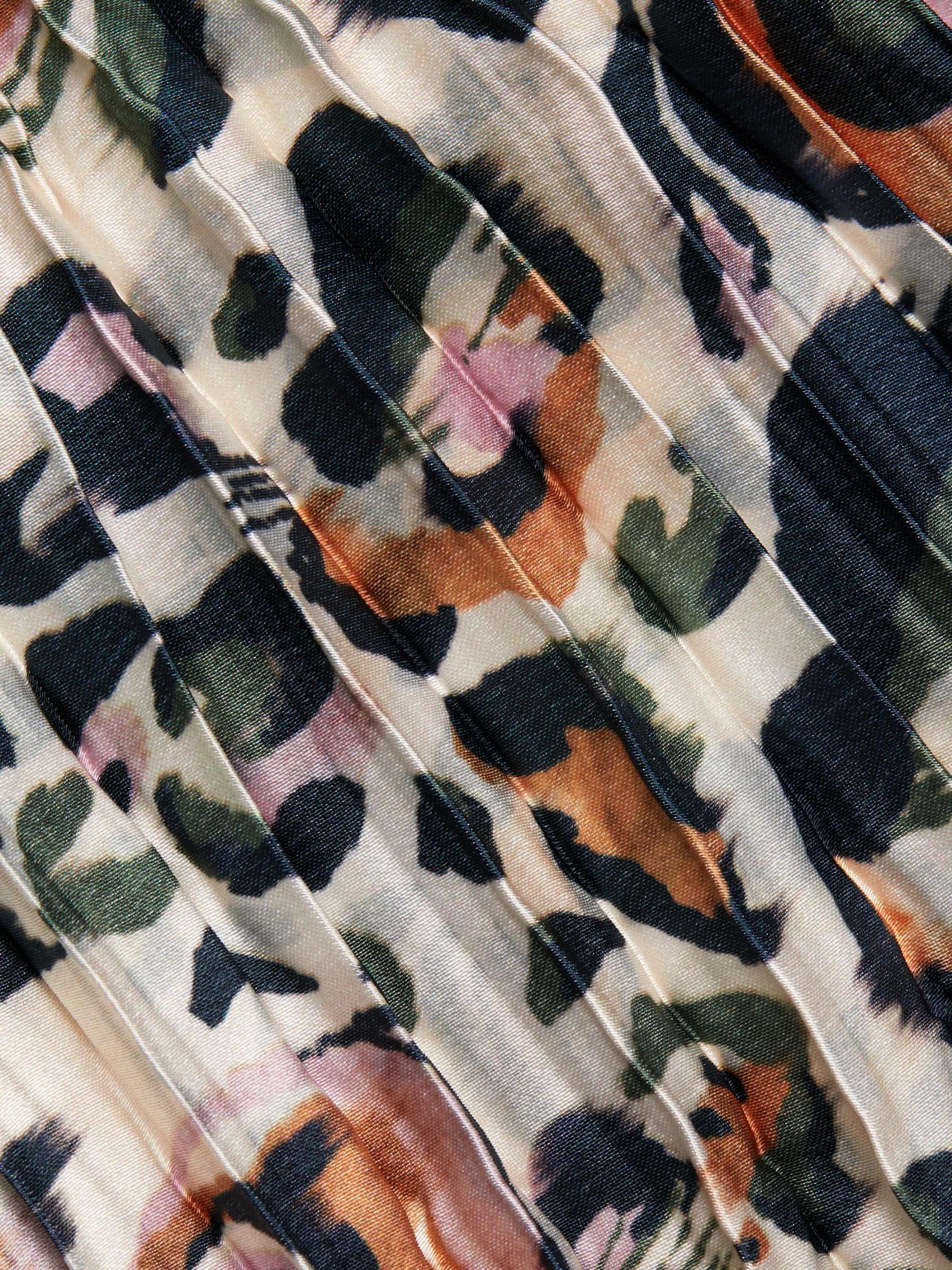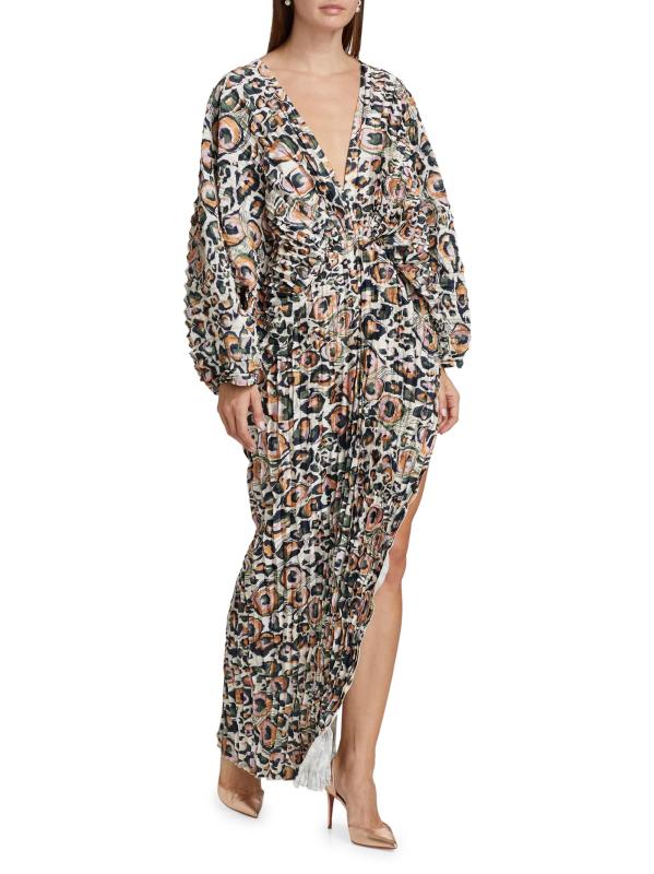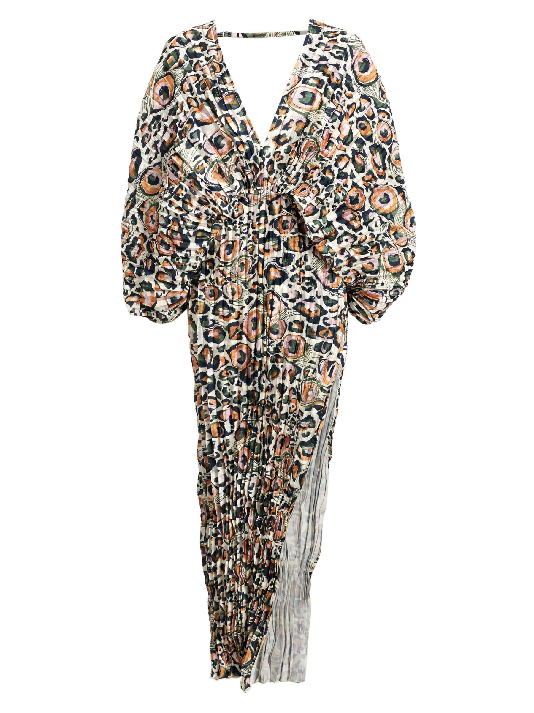 يتميز هذا الفستان ذو الثنيات من L'Idée بنقشة جلد الفهد وياقة على شكل حرف V وأكمام طويلة.