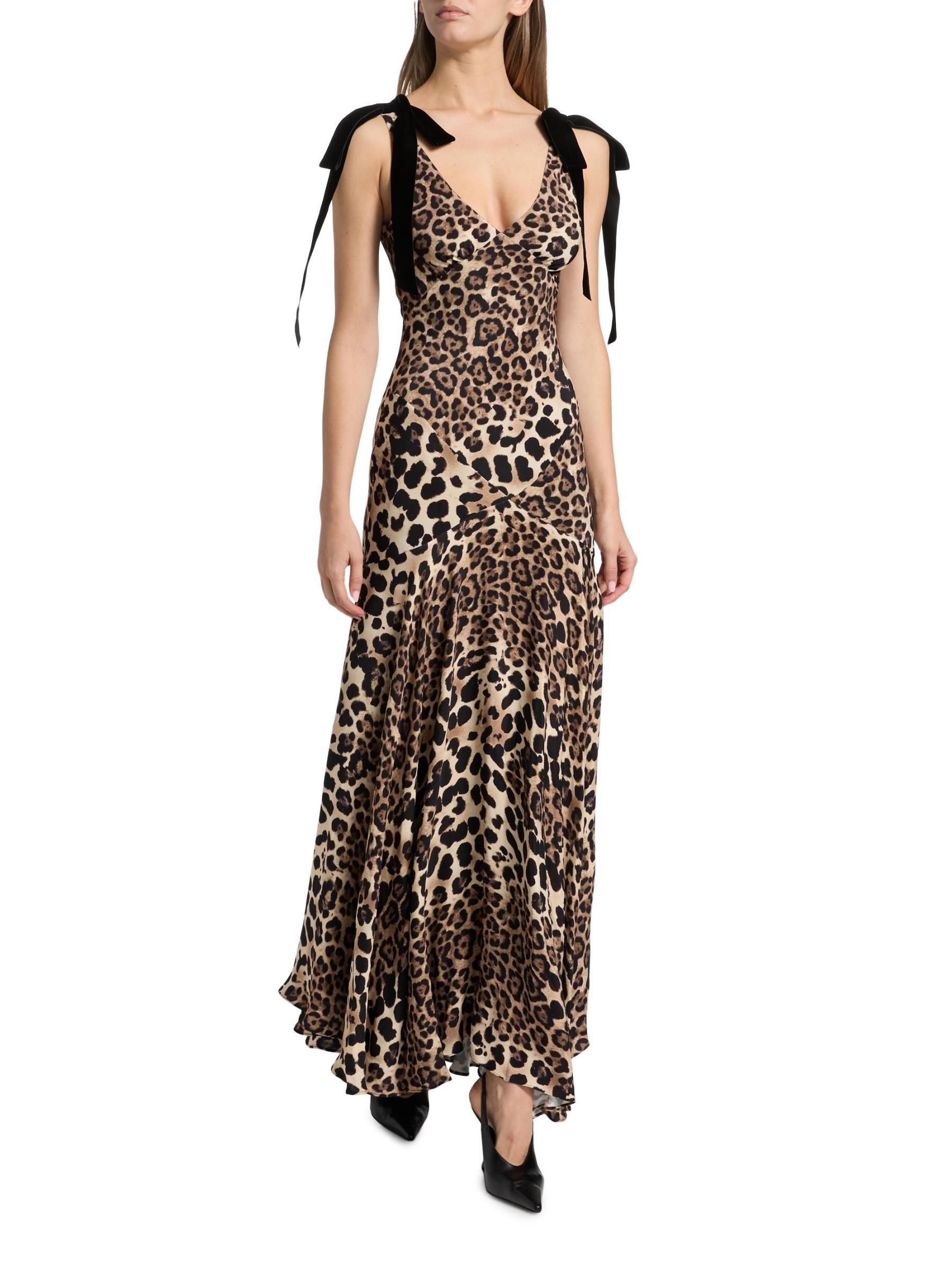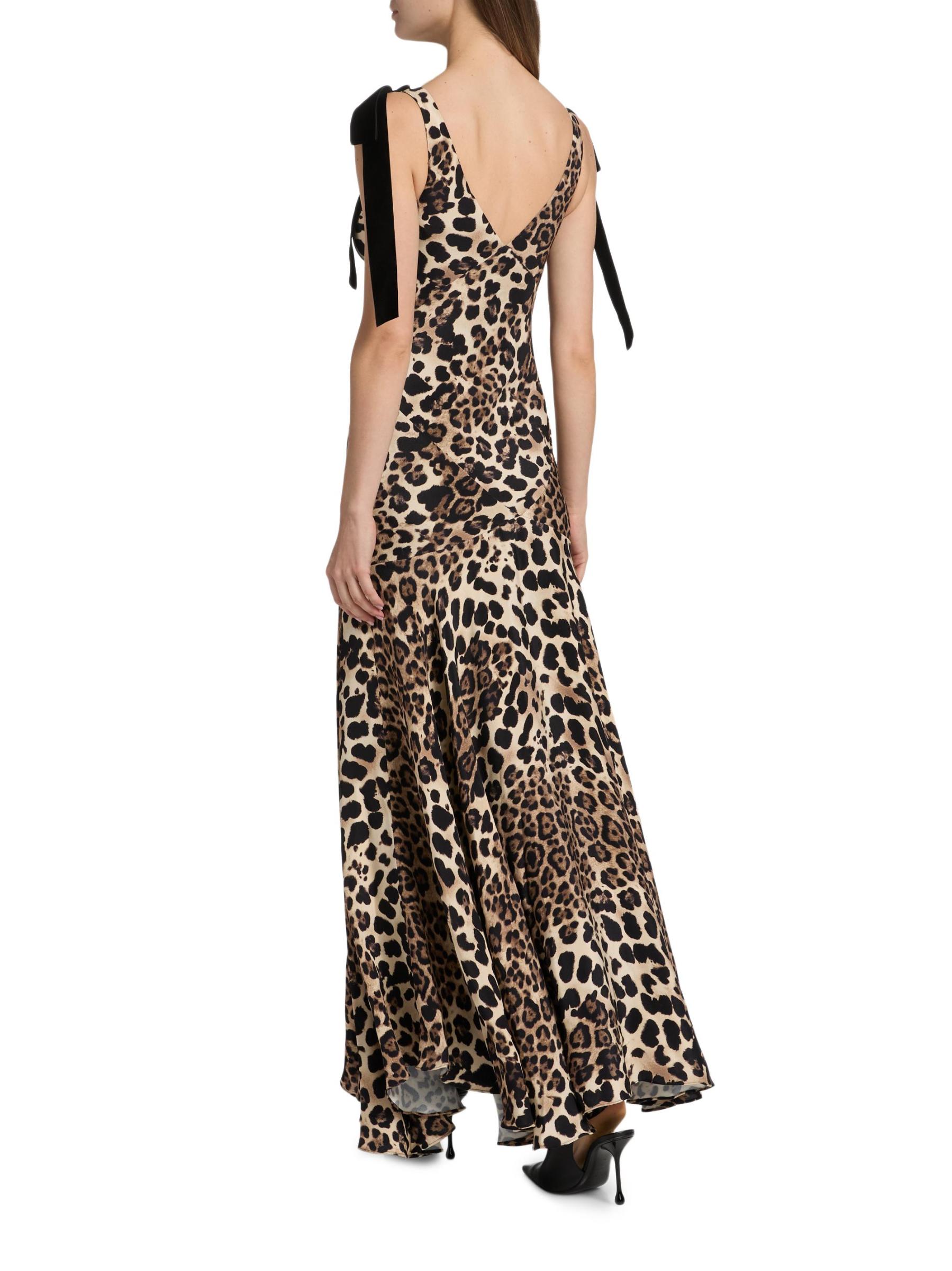 يتميّز فستان Rodarte الحريري ذو القطع المتحيز بنقشة جلد الفهد الديناميكية، بأحزمة مخملية برباط على شكل فيونكة، وخصر إمبراطوري، وخصر منسدل متحيز، مما يخلق صورة ظلية ضيقة وسلسة.