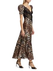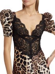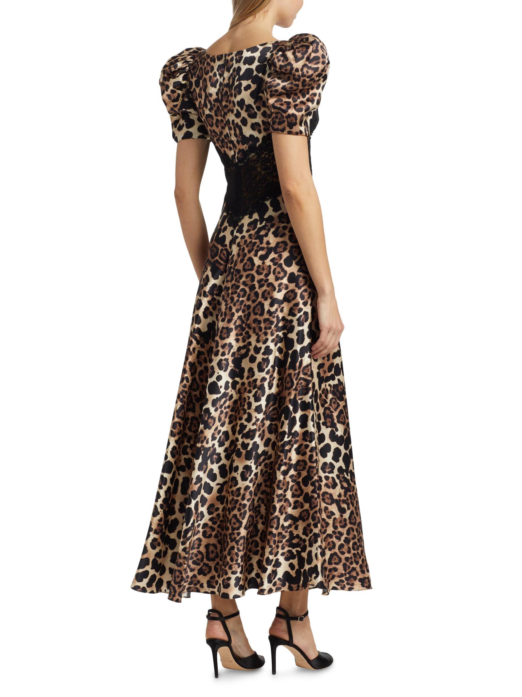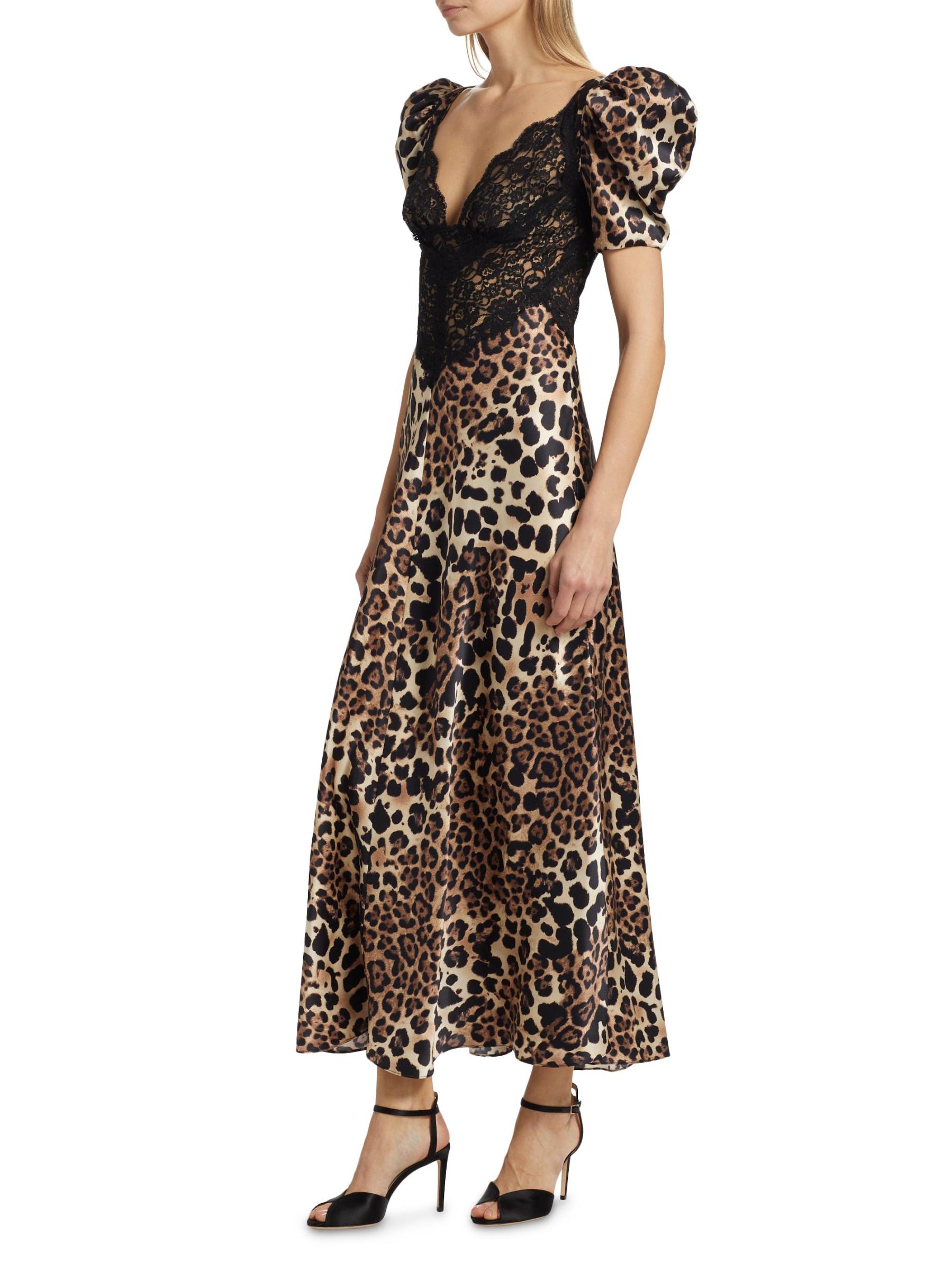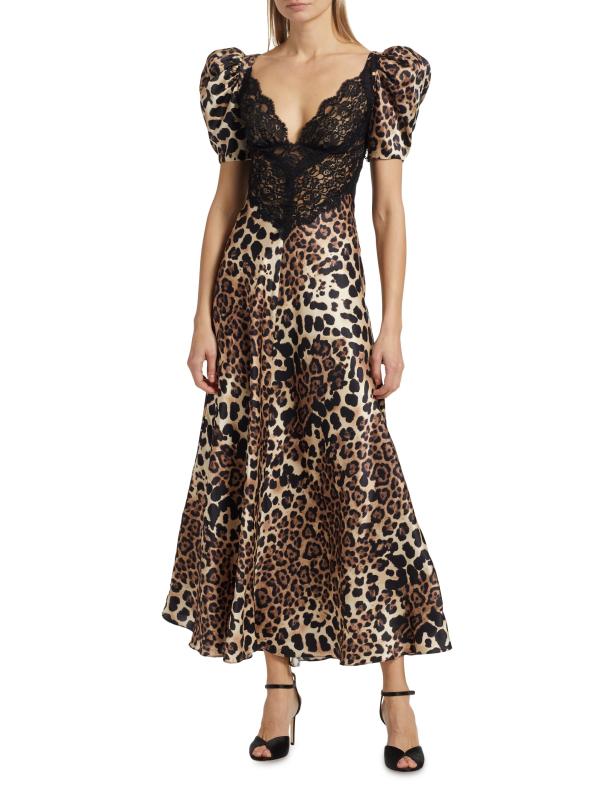 يُزيّن فستان Rodarte الحريري الطويل ذو القطع المتحيز بنقشة جلد الفهد التي تُبرز تصميم الدانتيل الرقيق الذي يبرز الصدّار والأكمام المنفوخة الرومانسية.
