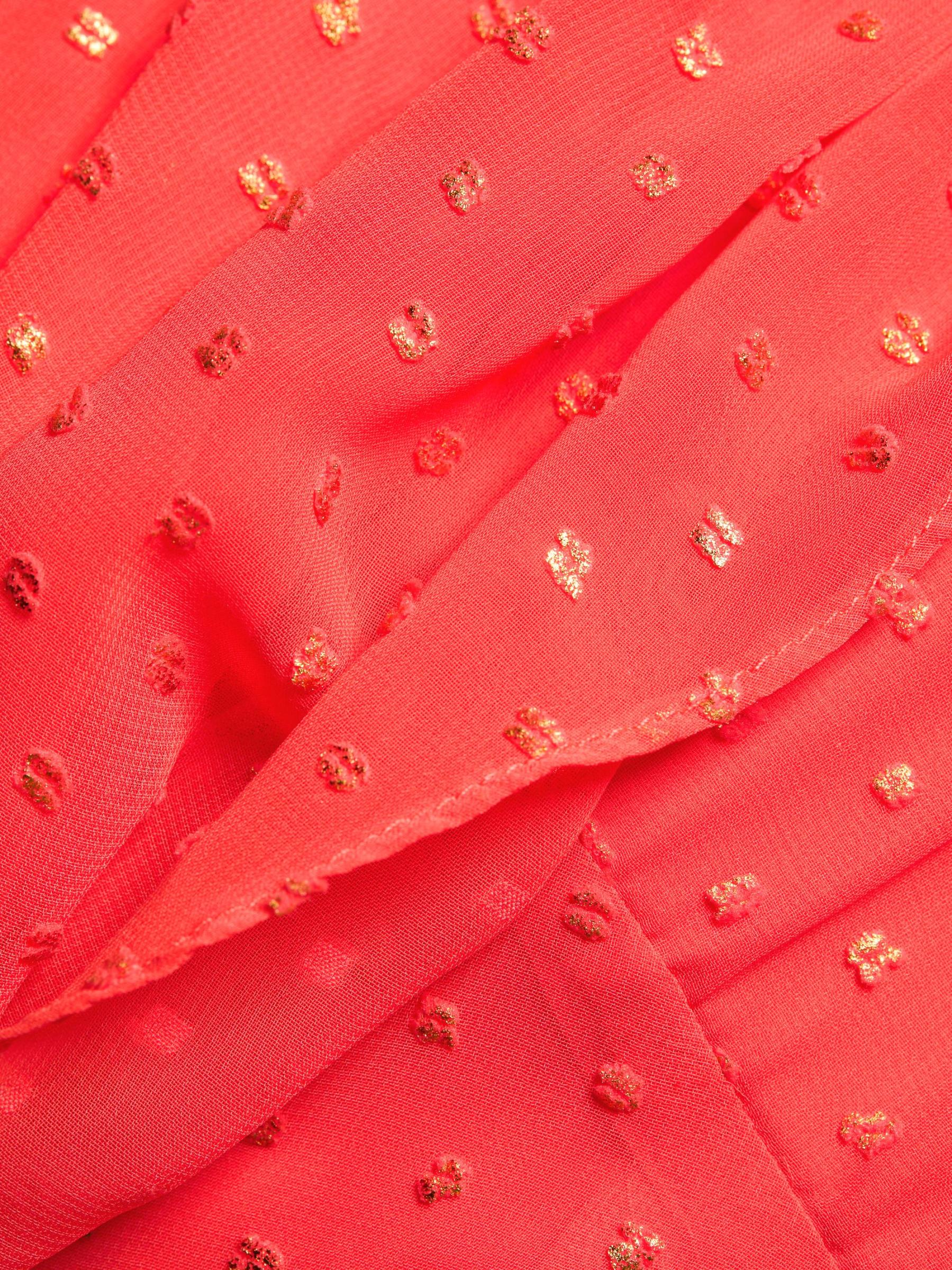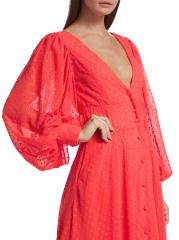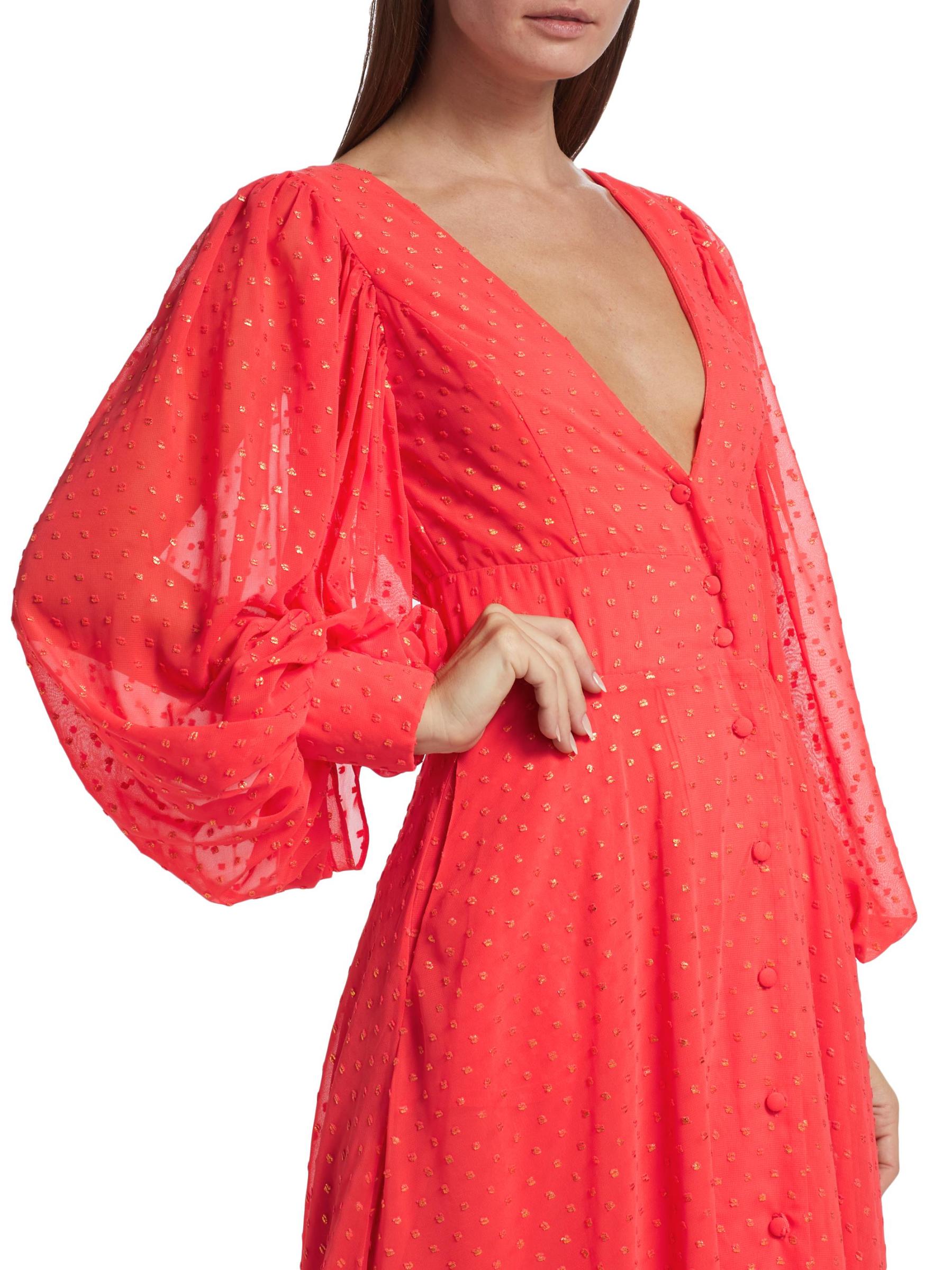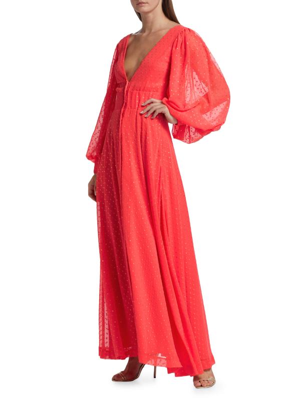 يتميّز فستان ليزلي ماكسي من كيمبرلي غولدسون، المصنوع من الجاكار، برقبة واسعة على شكل حرف V وفتحة ظهر على شكل حرف V وأكمام بلوزة طويلة وإغلاق بأزرار أمامية.