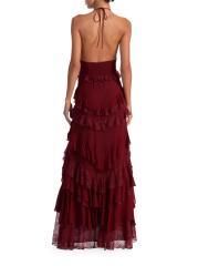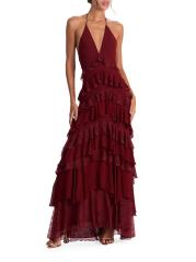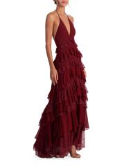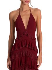 يتميز فستان Liana maxi هذا من Alice + Olivia برقبة دائرية على شكل حرف V وتصميم مكشكش متدرج مع زخرفة من الدانتيل وظهر مفتوح.