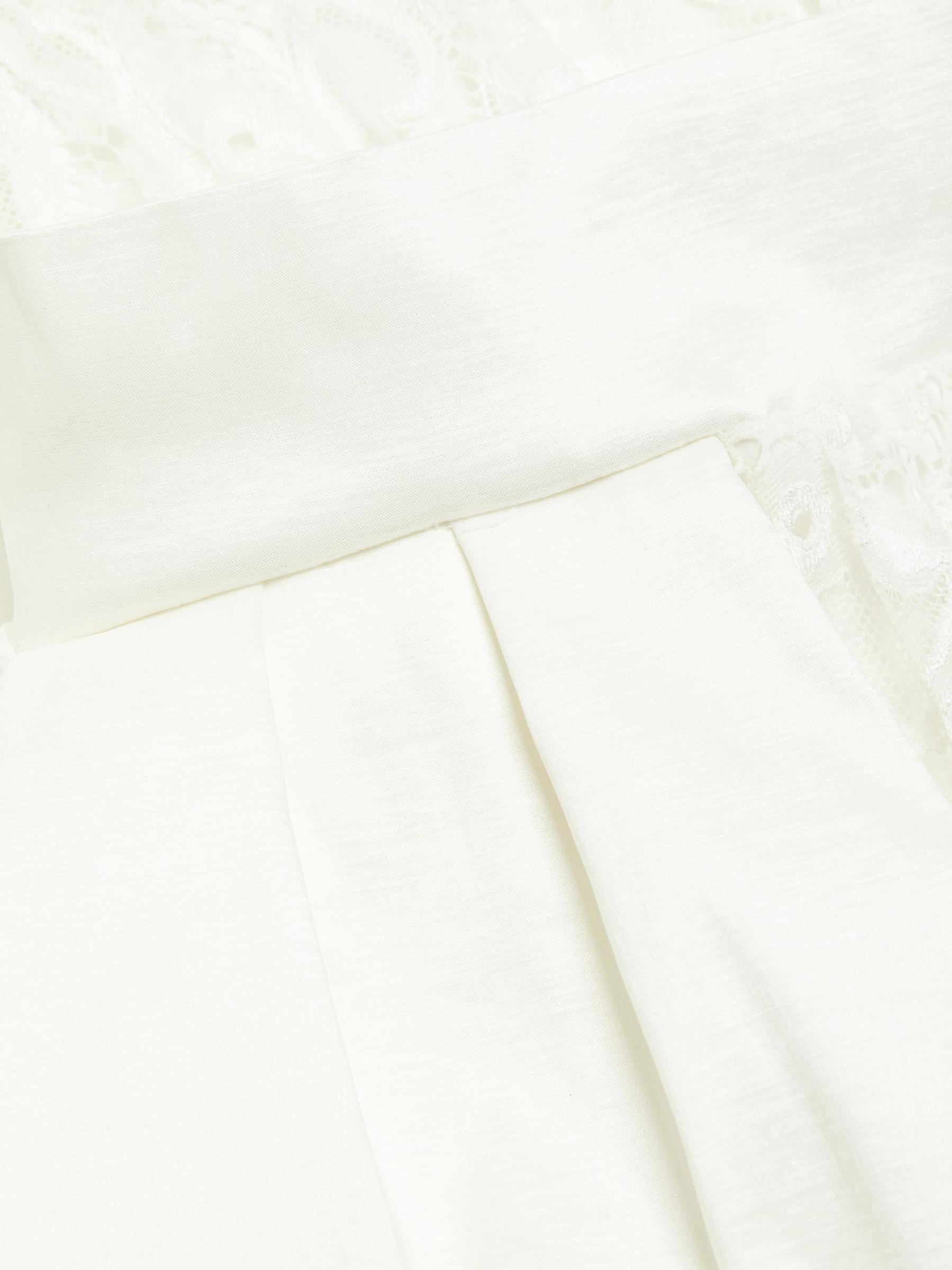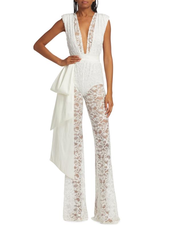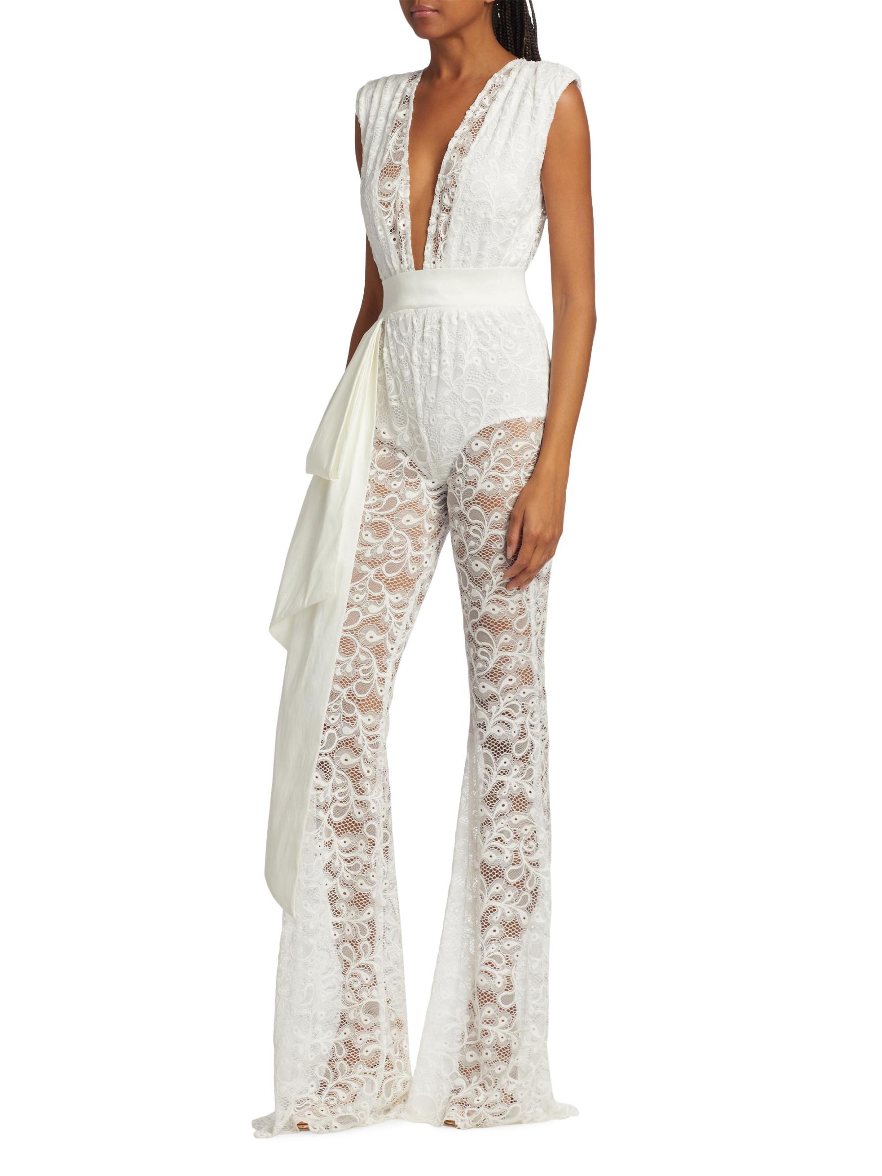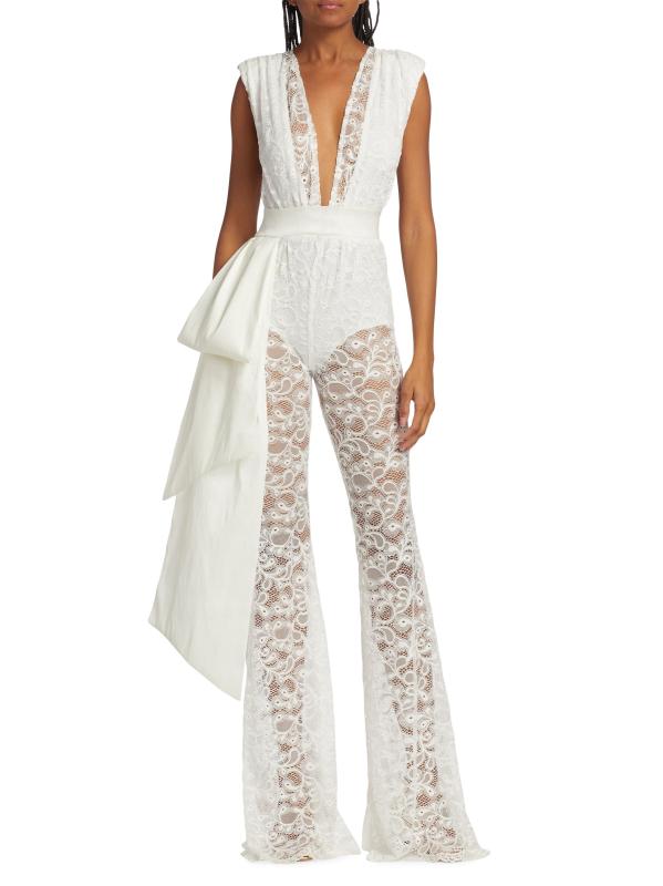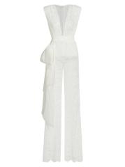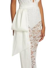 حصري. تتميّز بدلة ليلي بلا أكمام من مجموعة MICHAEL COSTELLO المصنوعة من الدانتيل الشفاف والمعقد بأكتاف مبطنة وتفاصيل فيونكة منسدلة عند الخصر.