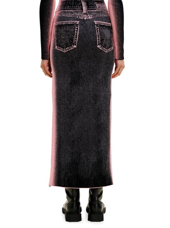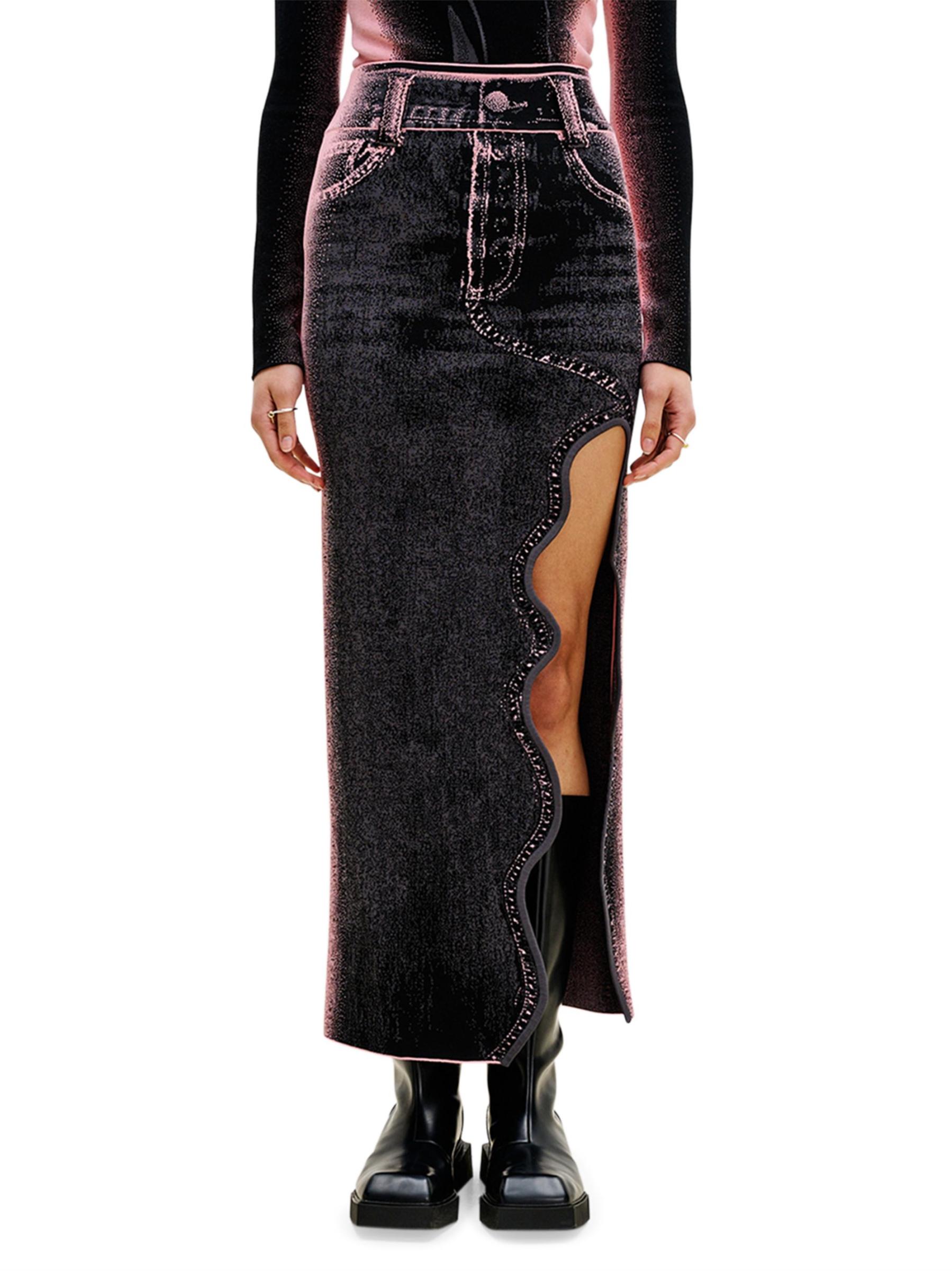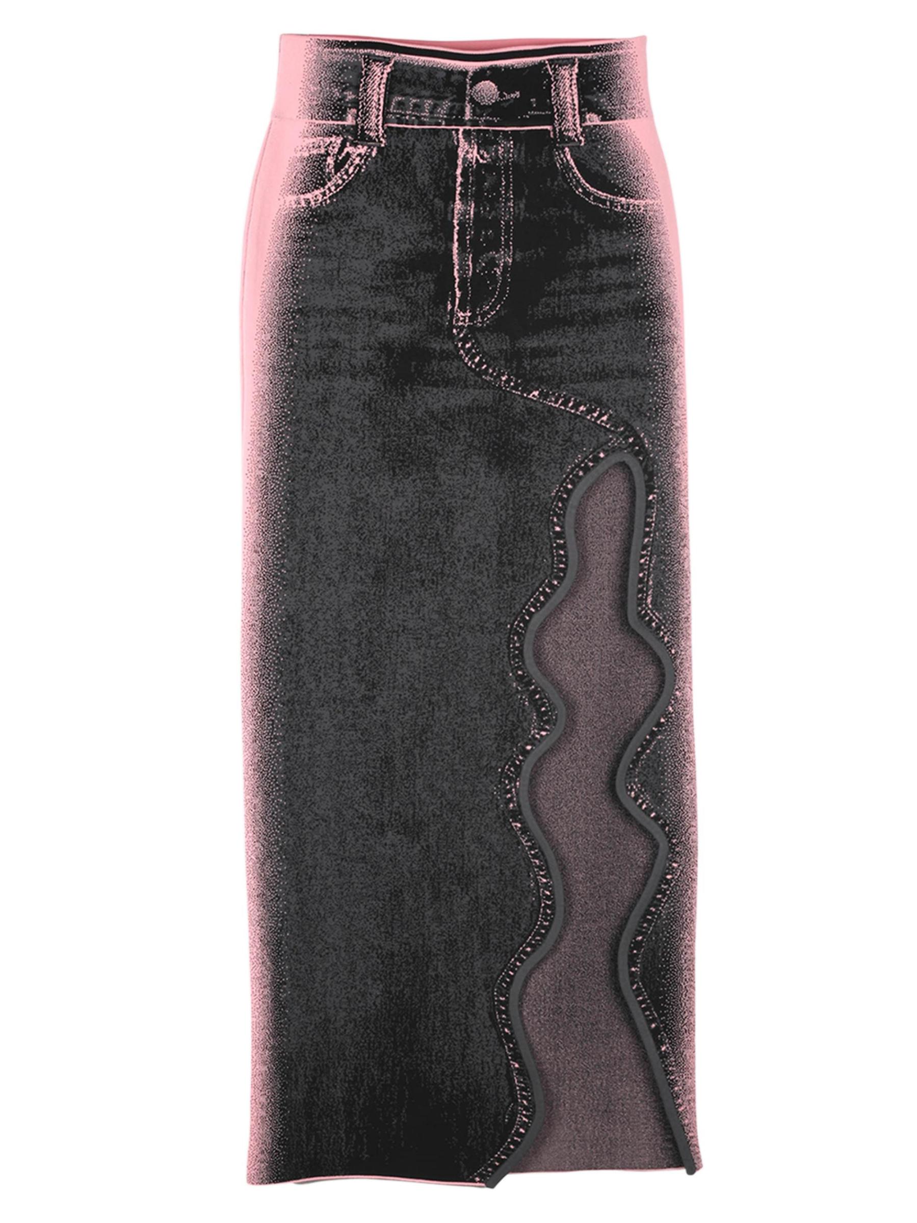 تتميّز تنورة Lily Wavy من PH5، المطبوعة بزخارف مستوحاة من الدنيم، بطول ماكسي مع فتحة أمامية مموجة مميزة.