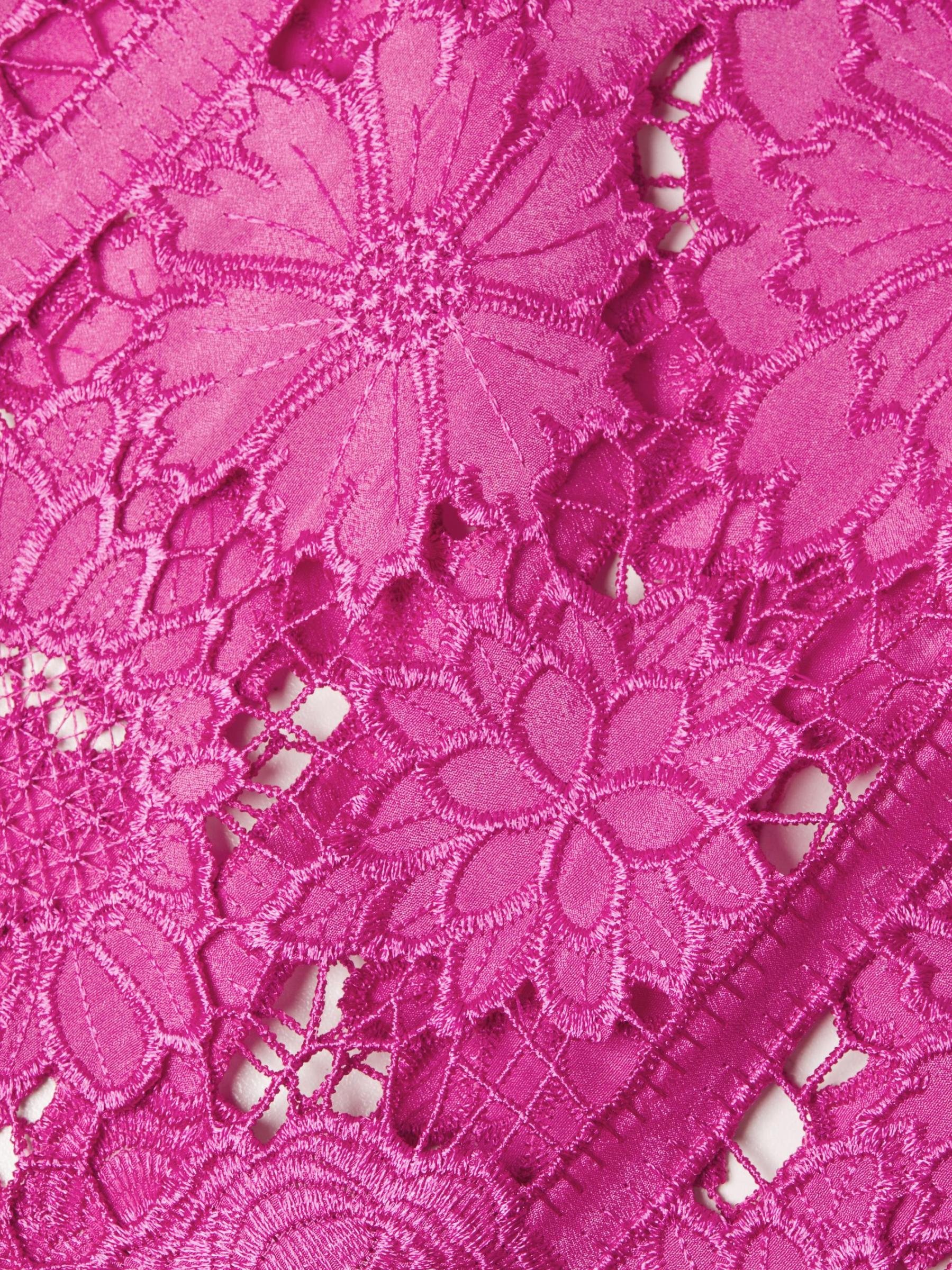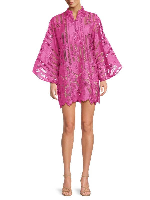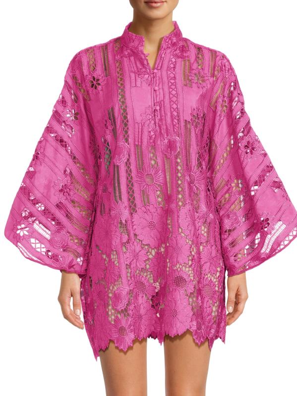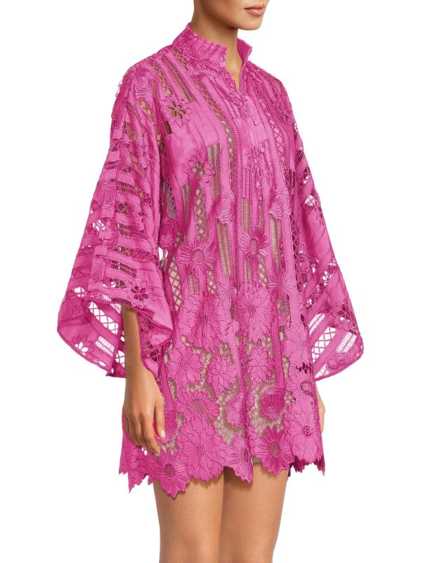 يتميز هذا القفطان الصغير من la Vie Style House، المصنوع من الدانتيل المطرز بشكل خطي بالزهور، بأكمام كاب واسعة وحاشية مزخرفة بنقوش منقوشة.