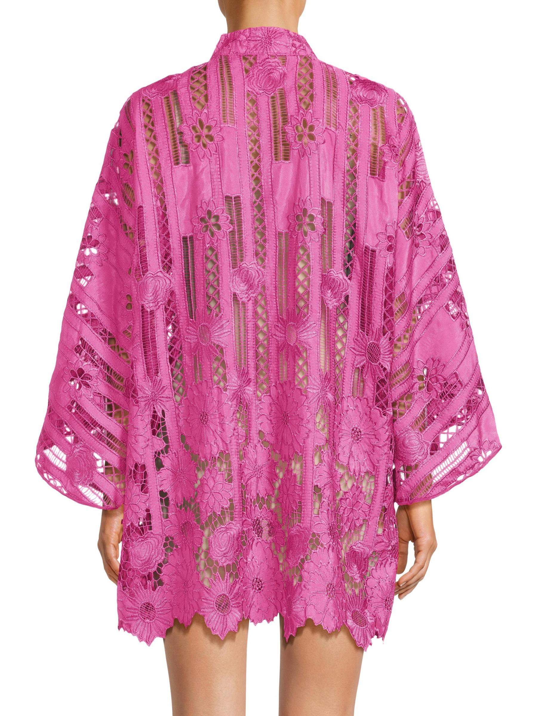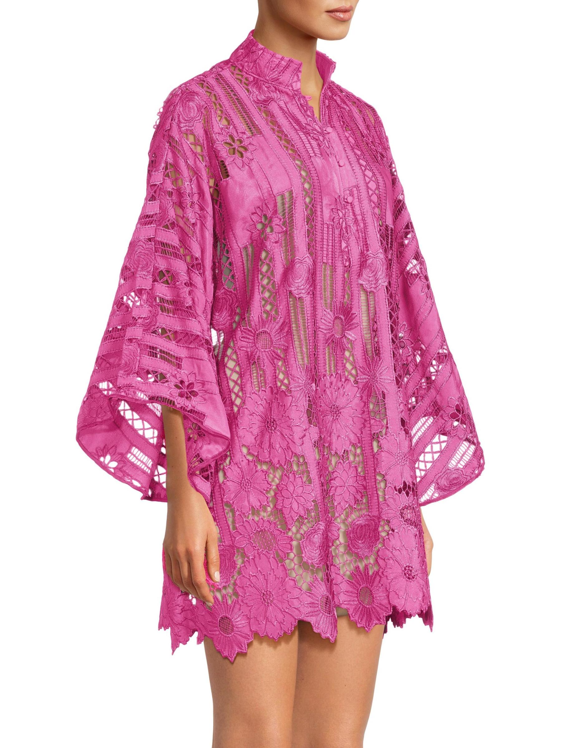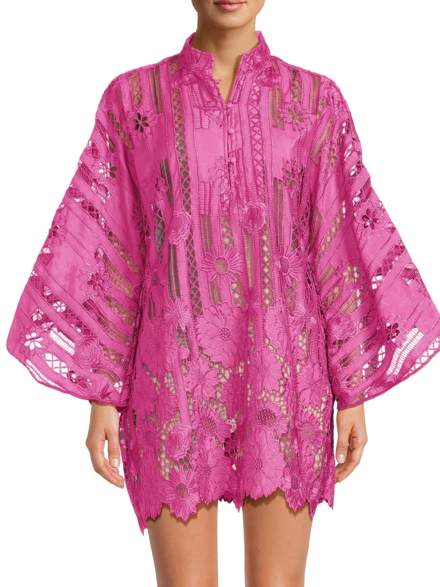 يتميز هذا القفطان الصغير من la Vie Style House، المصنوع من الدانتيل المطرز بشكل خطي بالزهور، بأكمام كاب واسعة وحاشية مزخرفة بنقوش منقوشة.طوق الفرقة أكمام كاب طويلة إغلاق بأزرار وحلقة أمامية قطن بنسبة 100% تنظيف جاف صُنع في الولايات المتحدة الأمريكية