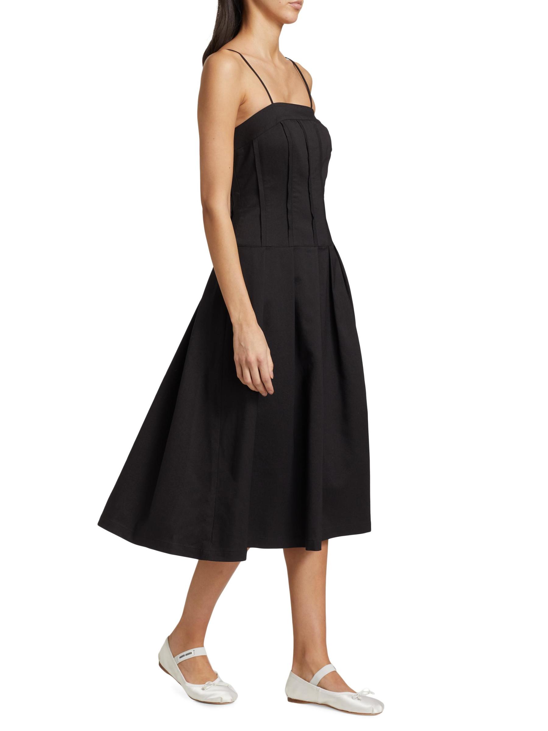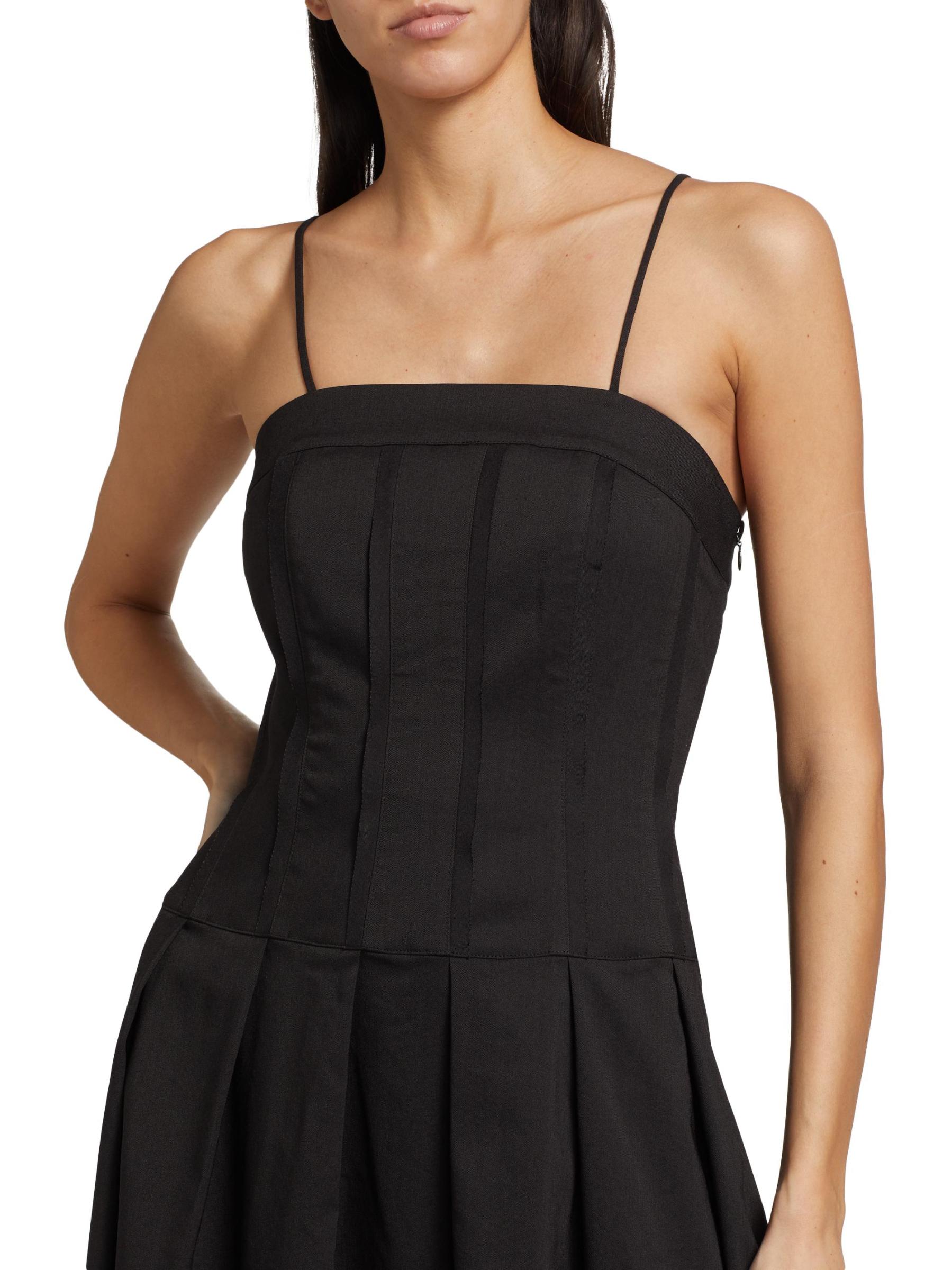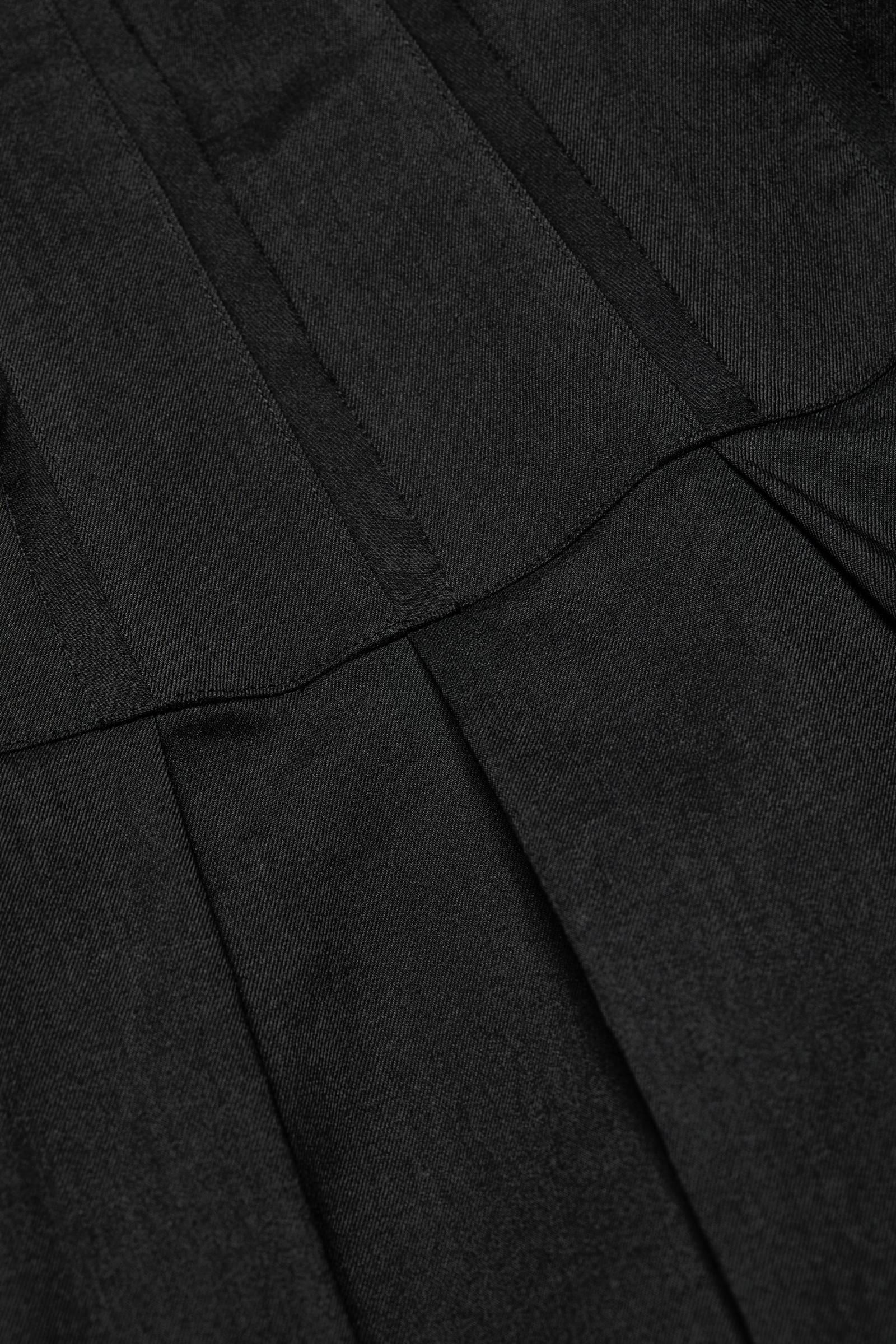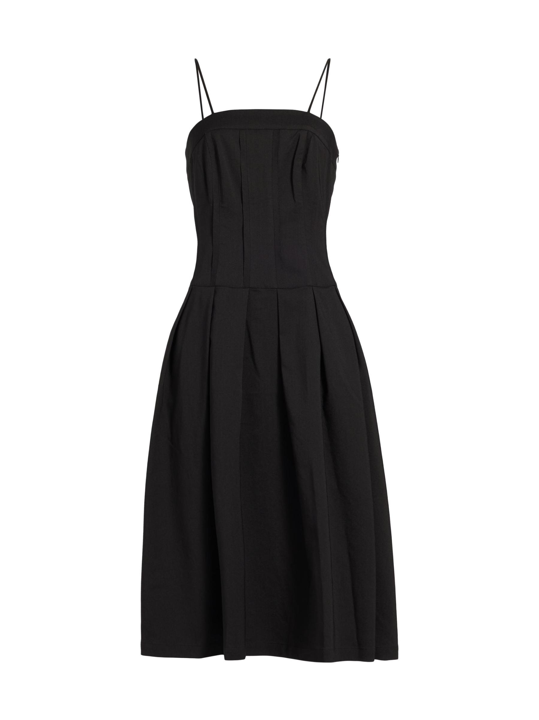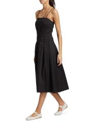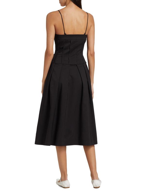 من مجموعة سارتوريال راونس. يتميز هذا الفستان بدون أكمام من Barneys New York، المصنوع من مزيج الكتان، بصدّار فضفاض مستوحى من الكورسيه وتنورة ذات ثنيات. تضفي التفاصيل المكشكشة بُعدًا دقيقًا على هذا النمط الهرمي.
