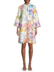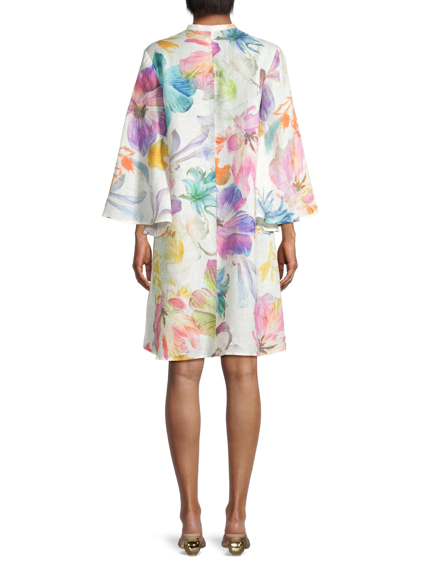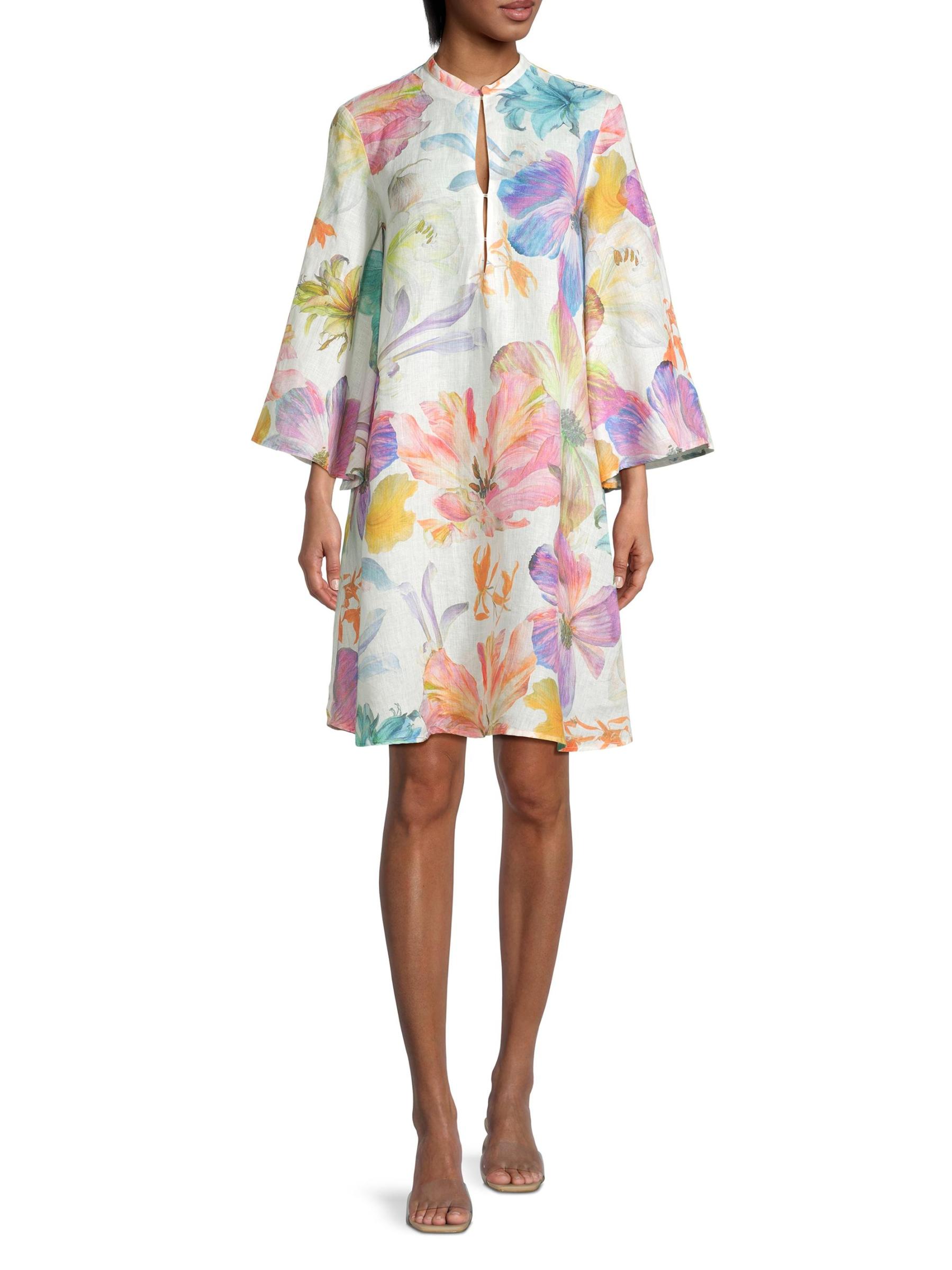 يتميز فستان لينو القصير بنسبة 120% المصنوع من الكتان الفاخر بتصميم قصير مستوحى من الكيمونو وأكمام طويلة واسعة. تم الانتهاء من هذا الطراز بإغلاق بحلقة أمامية وطباعة زهرية.رقبة مستديرة أكمام طويلة إغلاق بحلقة أمامية كتان 100% يُغسل في الغسالة مستوردة