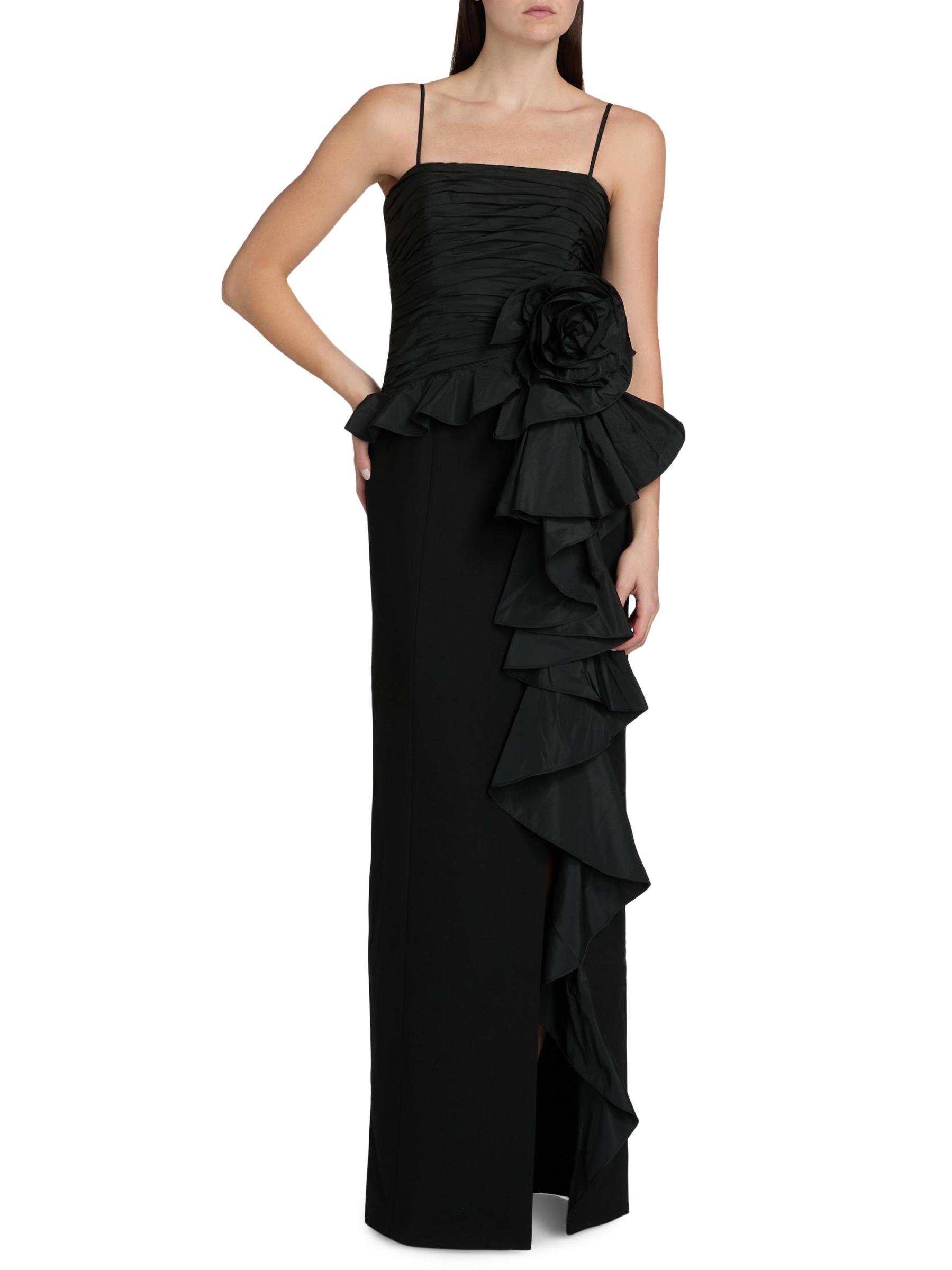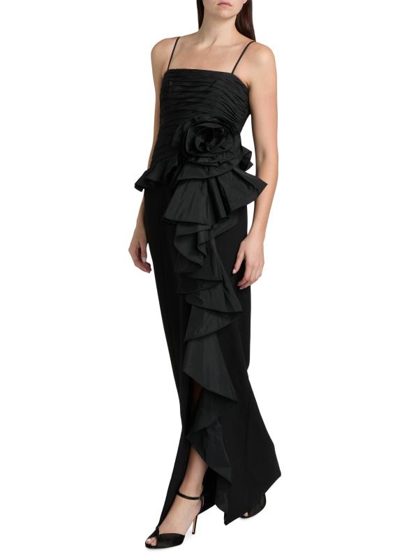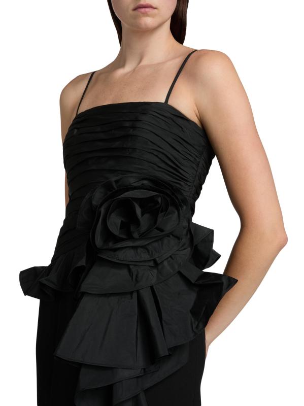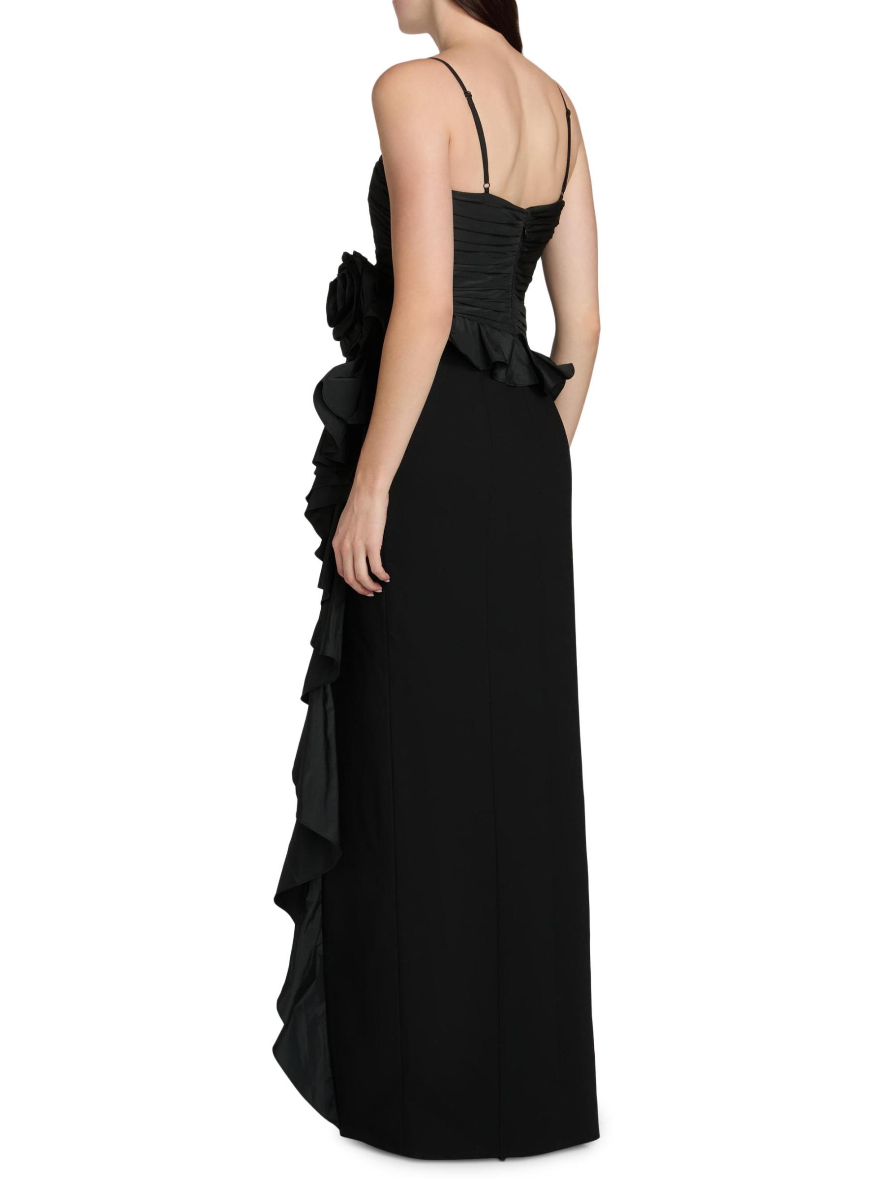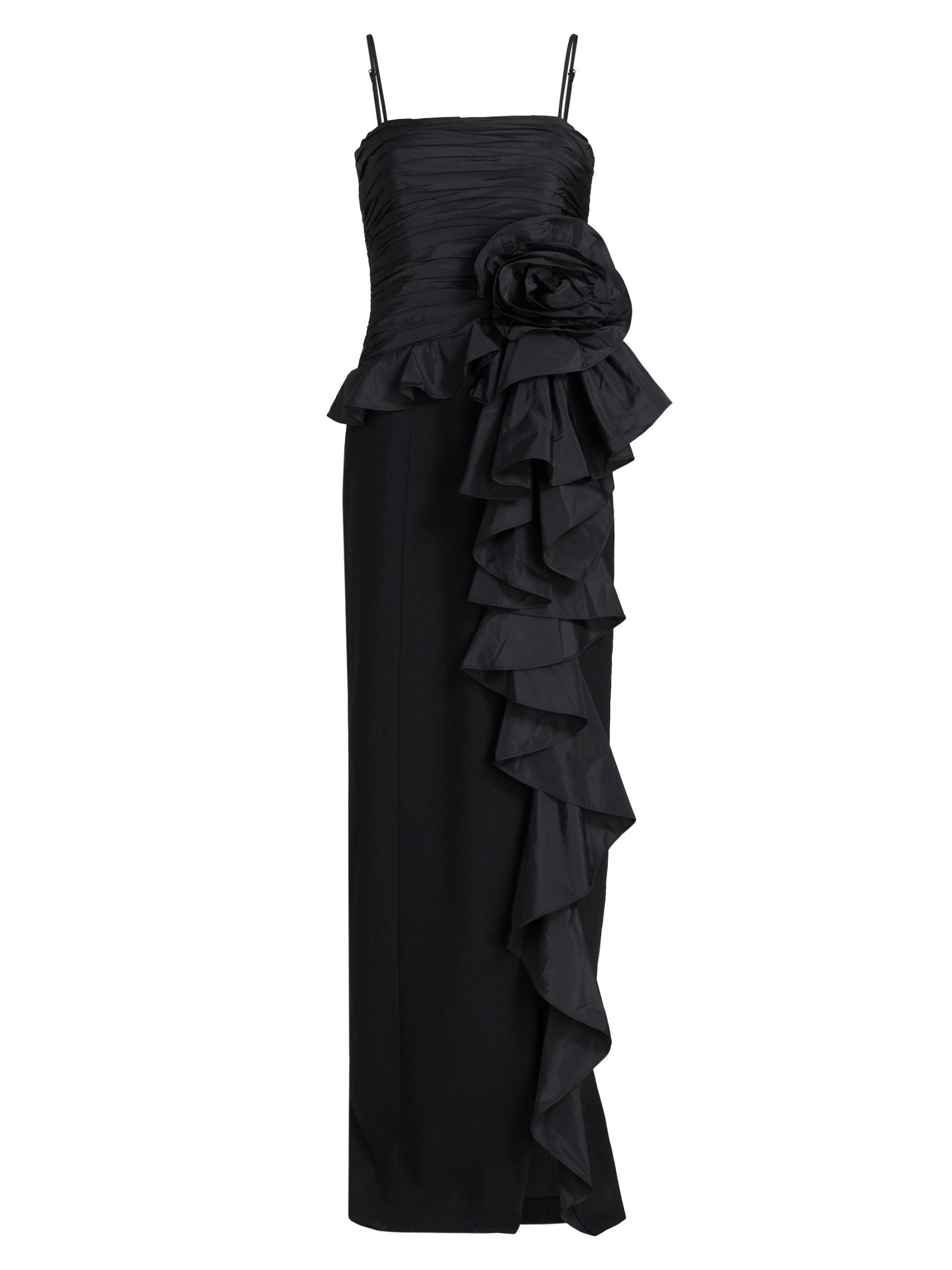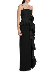 تم تزيين فستان Liora من Cinq à Sept بزخارف نباتية كبيرة الحجم عند الخصر وكشكشة تتدلى نحو الحافة. تتميّز هذه القطعة بتقويرة مستقيمة وكشكشة عند الصدّار وشق جانبي عند الحافة.