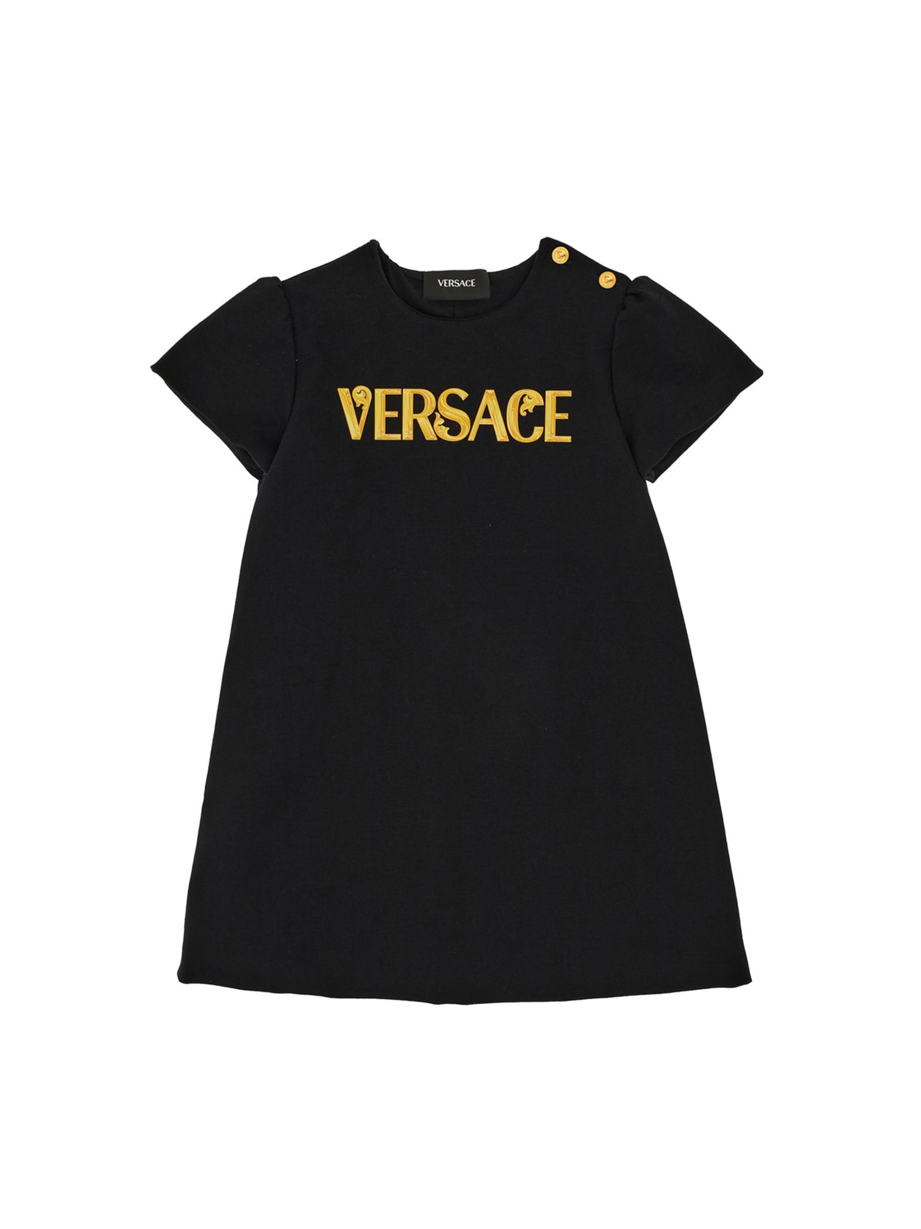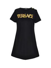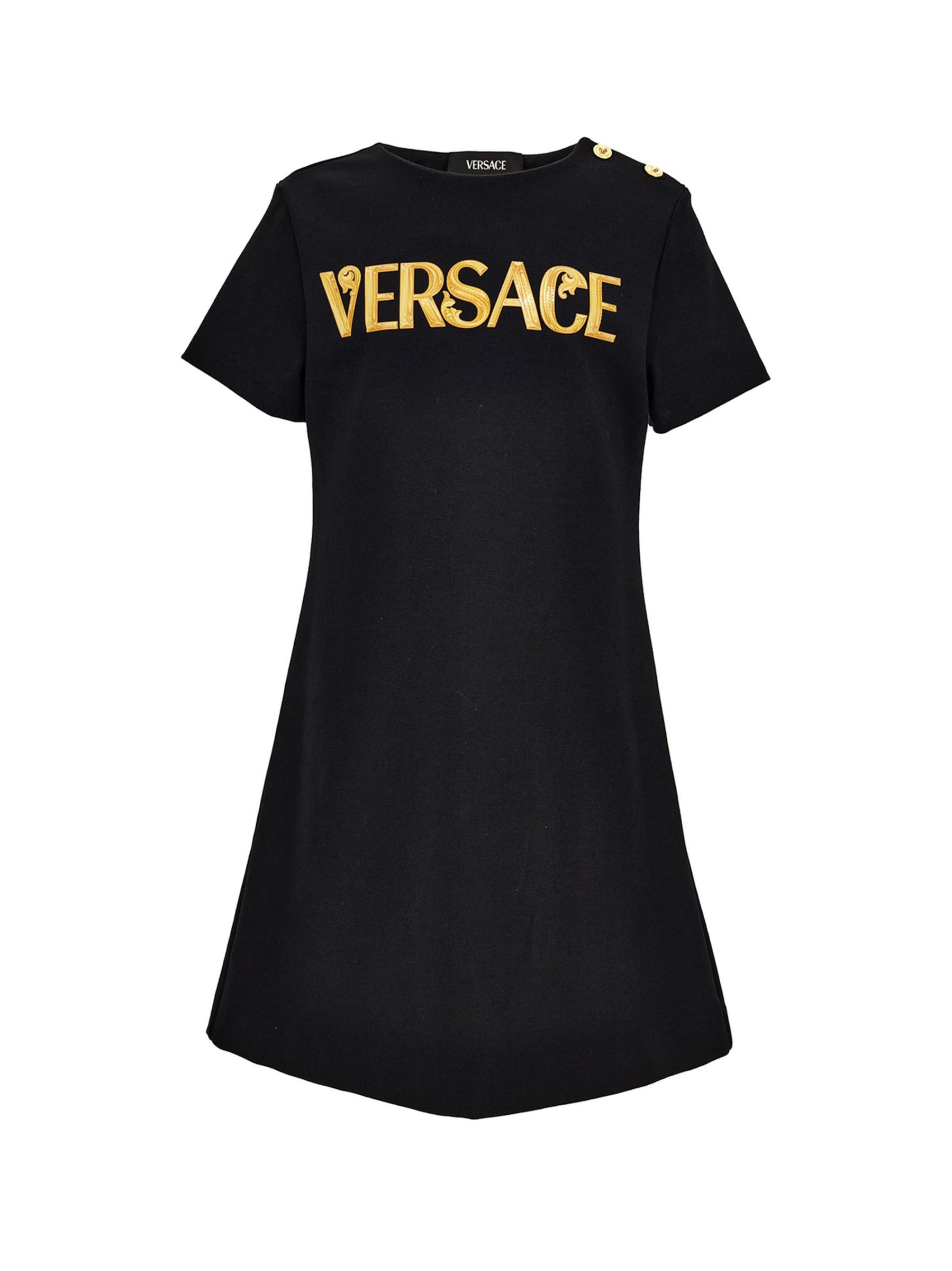 صُمم هذا الفستان ذو الرقبة المستديرة على شكل حرف A من فيرساتشي مزيّن بشعار مستوحى من الباروك على الجهة الأمامية وأزرار ذهبية مرصعة بميدوسا.رقبة مستديرة أكمام قصيرة تسحب 67% فيسكوز/ 28% نايلون/ 5% إيلاستين البطانة: 100% قطن يُغسل في الغسالة مستوردة