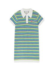 صُنع هذا الفستان المصمم على طراز بولو من القطن، وهو محبوك بتصميم كروشيه ويتميز بنمط مخطط متعدد الألوان. تم الانتهاء من القطعة بتقليم مضلع صلب بلون مغاير.
