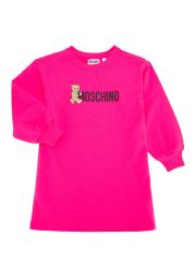 صُمم هذا الفستان المصمم على شكل سويت شيرت من موسكينو من الصوف القطني، وقد تم تزيينه بالدب المميز للعلامة التجارية ورسم الشعار على الجهة الأمامية. تُكمل الرقبة المستديرة المضلعة والأساور المظهر.