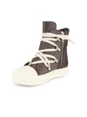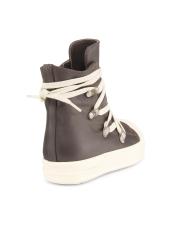 صُنع حذاء Hexalace الجلدي عالي الرقبة من Rick Owens في إيطاليا، ويتميز بأربطة سداسية متقاطعة ونعل مميز بأسنان القرش.