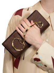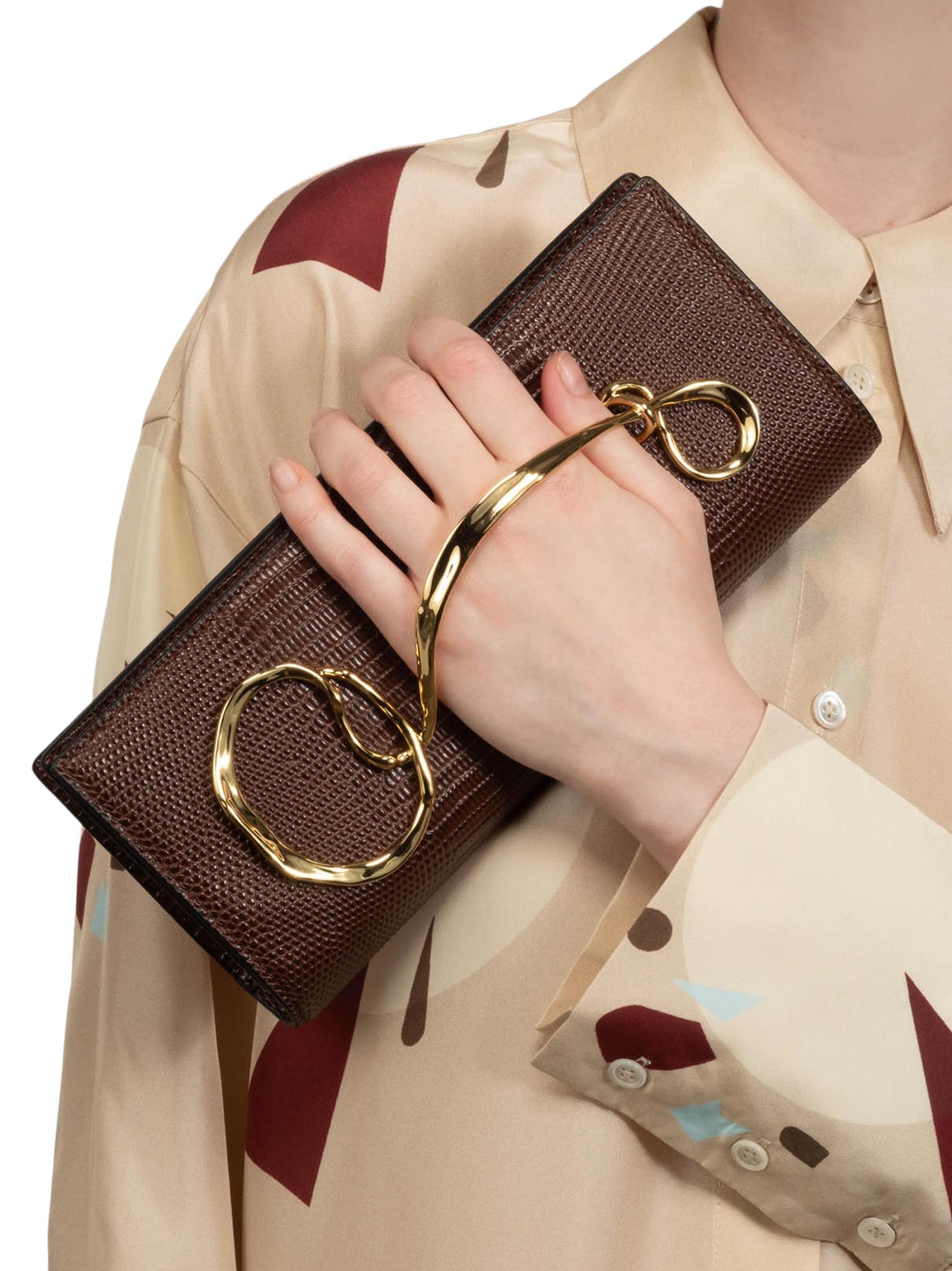 من مجموعة تويستد جولد. باستخدام روح تصميم Alexis Bittar المميزة في أشكالها وأجهزتها، تتميز هذه الحقيبة المهيكلة بمقبض سائل ملتوي مطلي بالذهب عيار 14 قيراطًا.