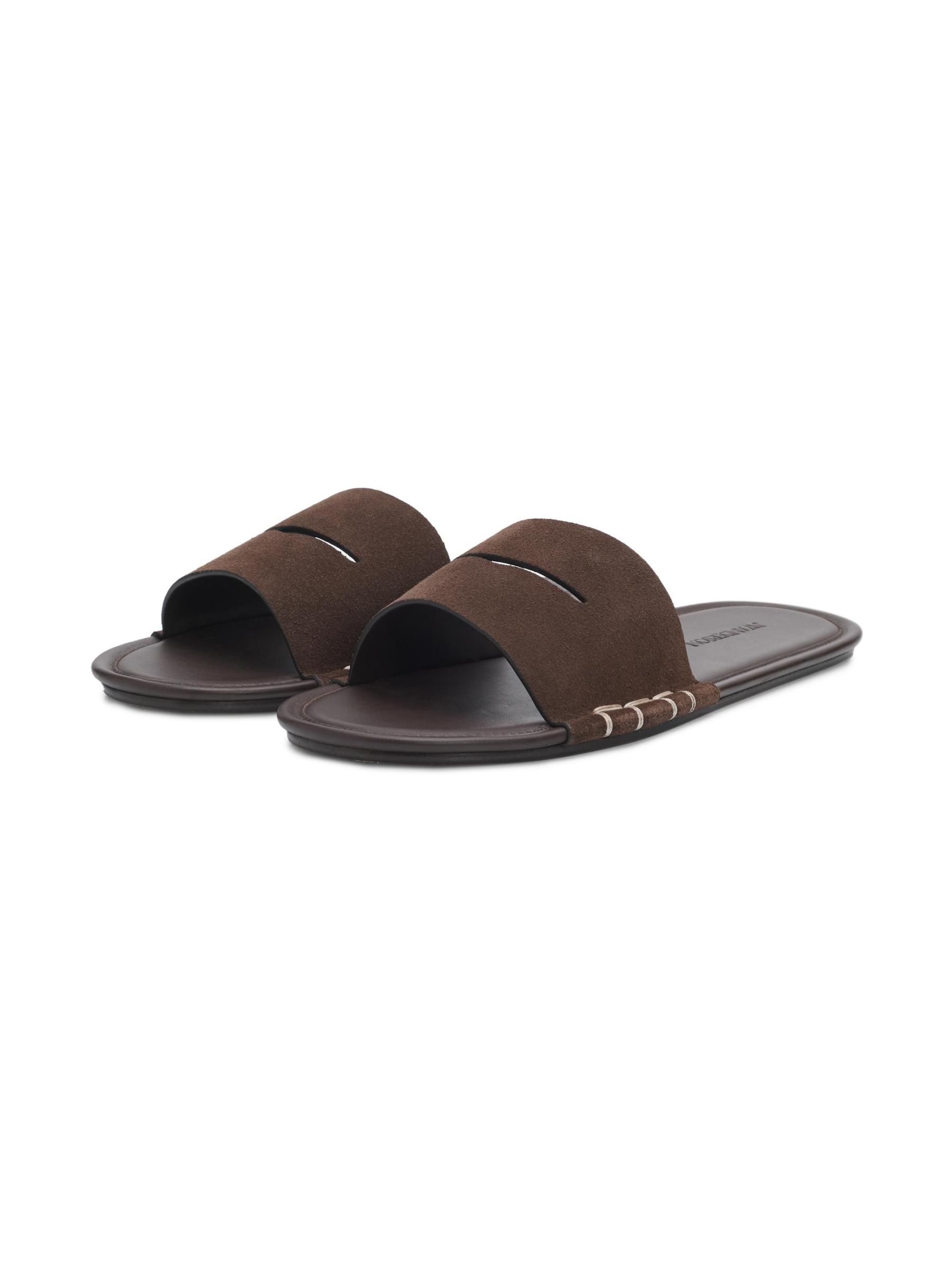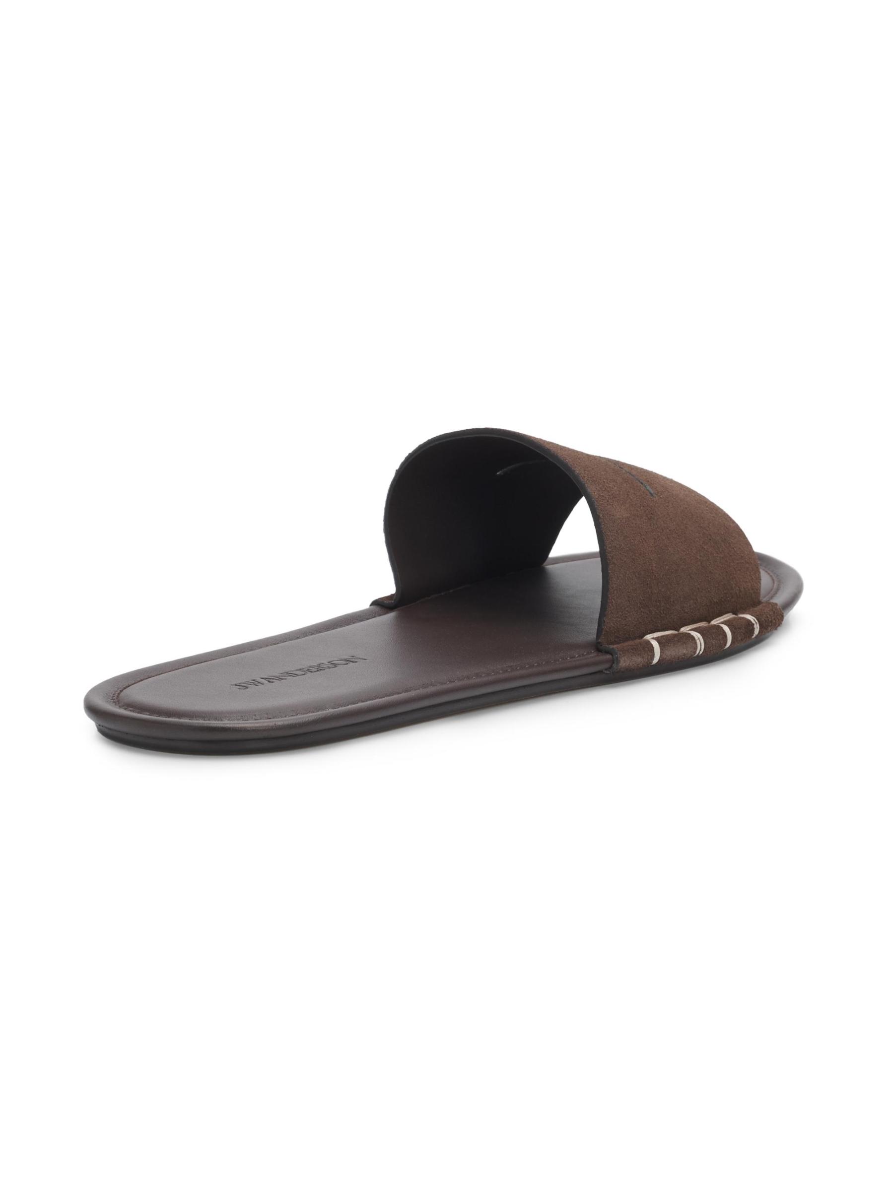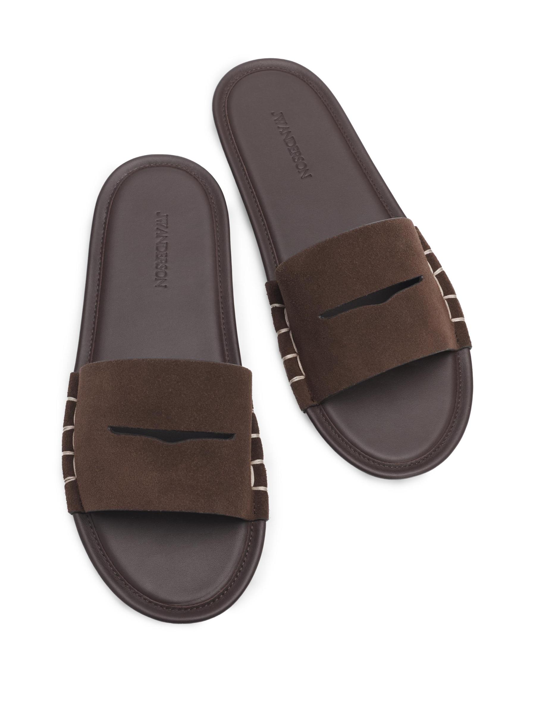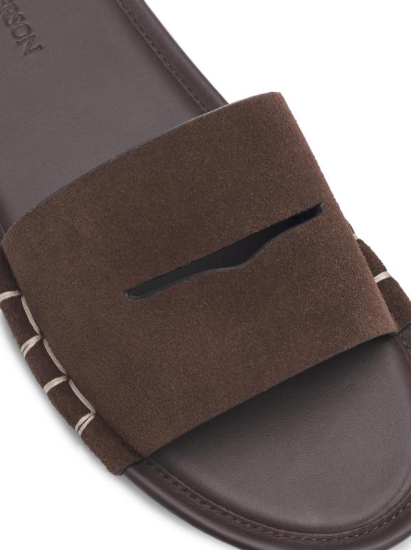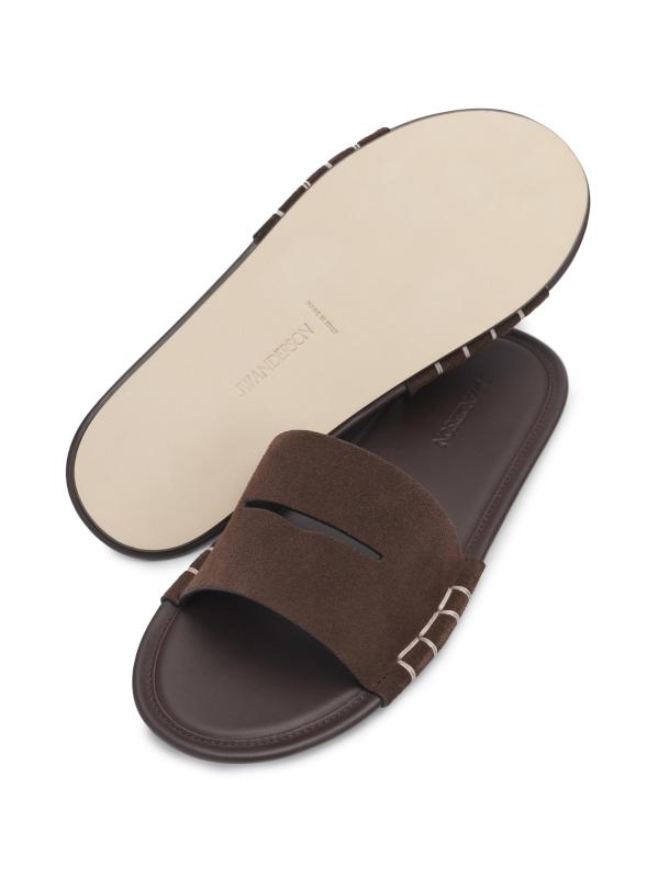 صُنع صندل Loafer Slide من JW Anderson من الجلد المدبوغ الإيطالي الناعم، ويتميز بتصميم بسيط مع حزام علوي مستوحى من البنسات. تفاصيل الخياطة العلوية المتباينة على الجانبين.