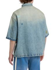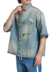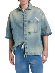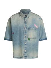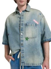 هذا القميص المصنوع من قماش الدنيم القطني الصلب مزين بأزرار أمامية برقع شعار مرحة مستوحاة من الضمادات. تم تصميم هذا النمط الصندوقي بياقة واسعة وجيب خارجي على الصدر وأكمام قصيرة.